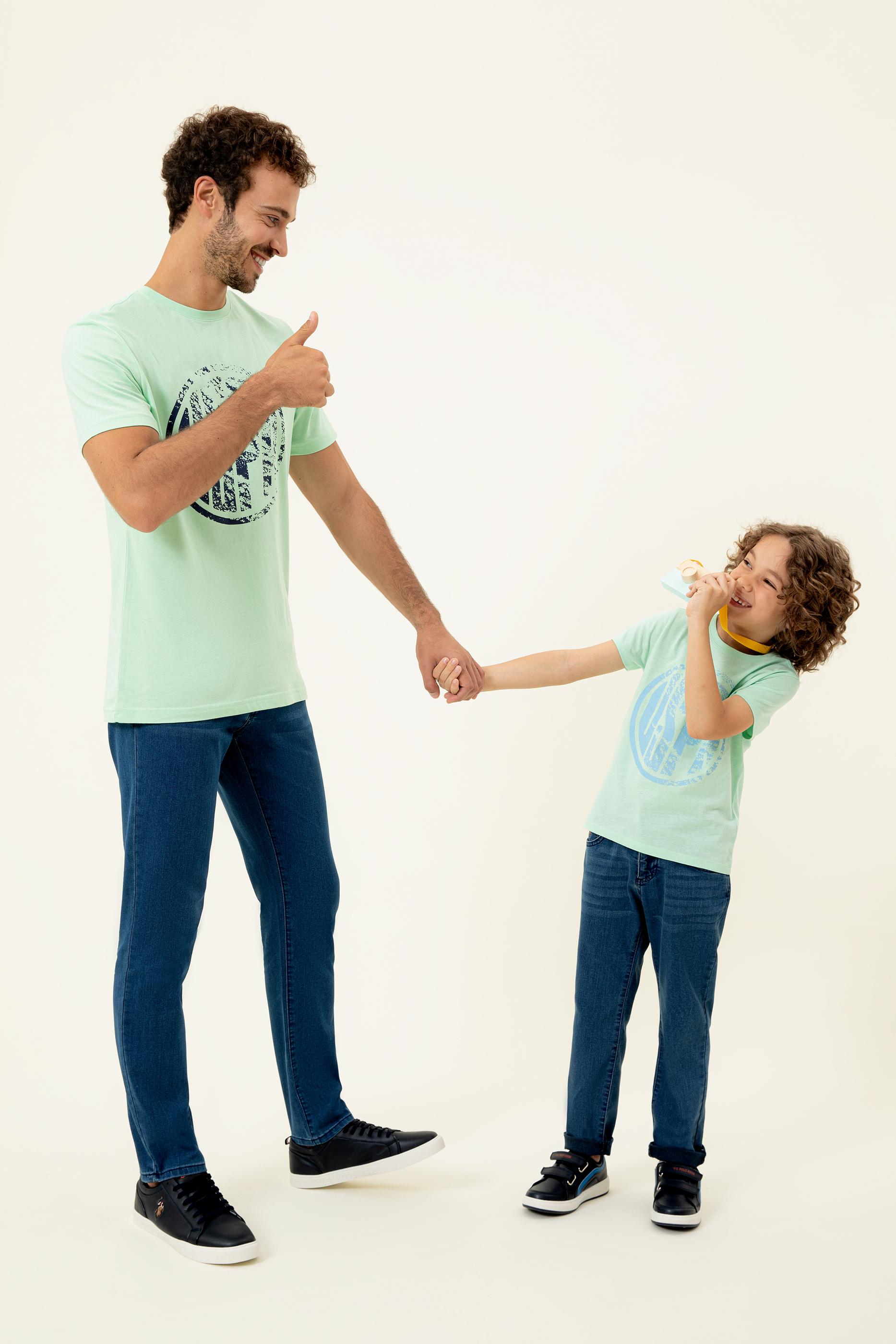 Bisiklet yaka erkek çocuk tişört modelimiz %100 pamuk kumaşı sayesinde cildin hava almasına olanak sağlarken, USPA baskısı ile şık bir görünüm verir.