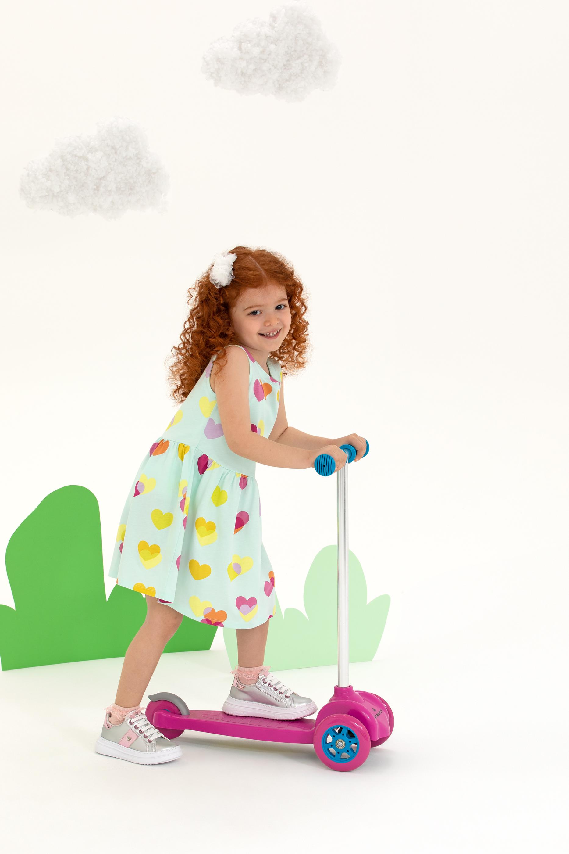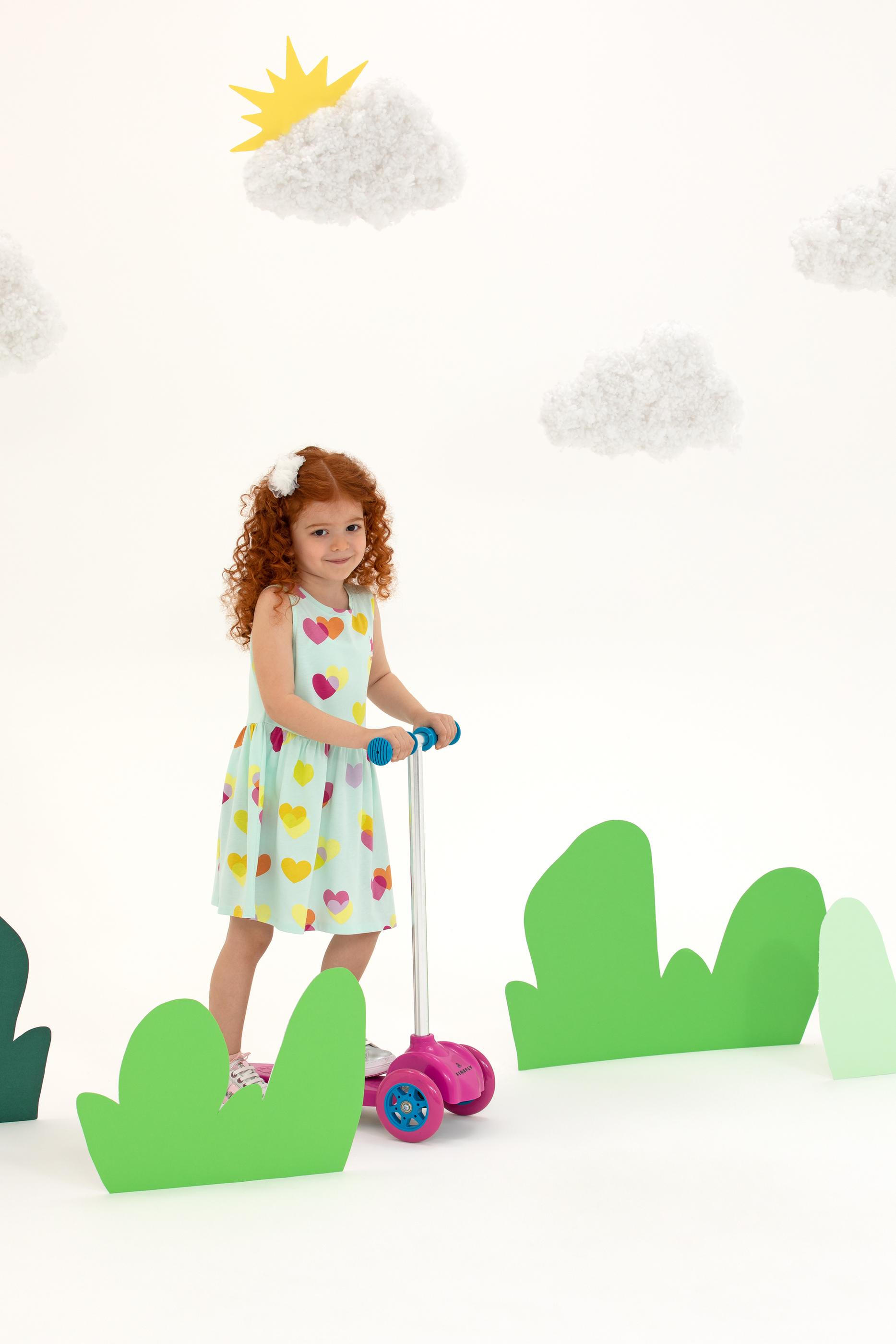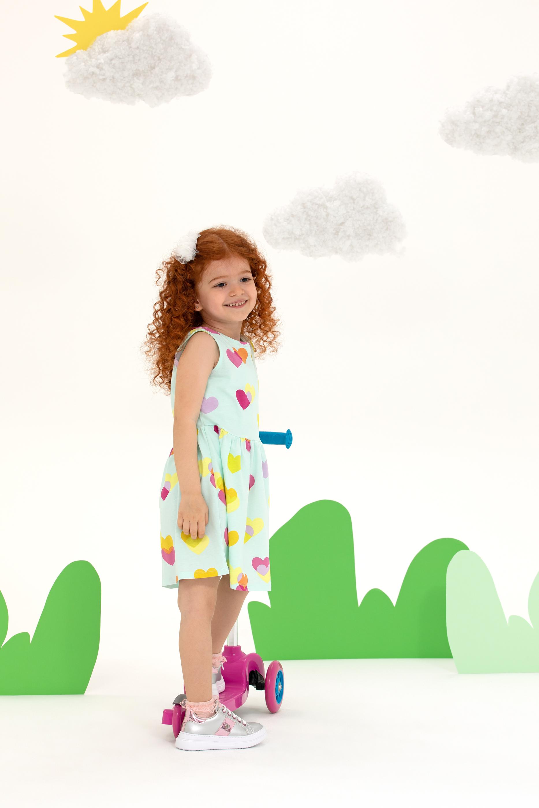 Canlı renk kullanımı ve fark yaratan baskılı kız çocuk örme elbise modelimiz spor kombinler başta olmak üzere dilediğiniz görünümde kızınıza eşlik eder.
