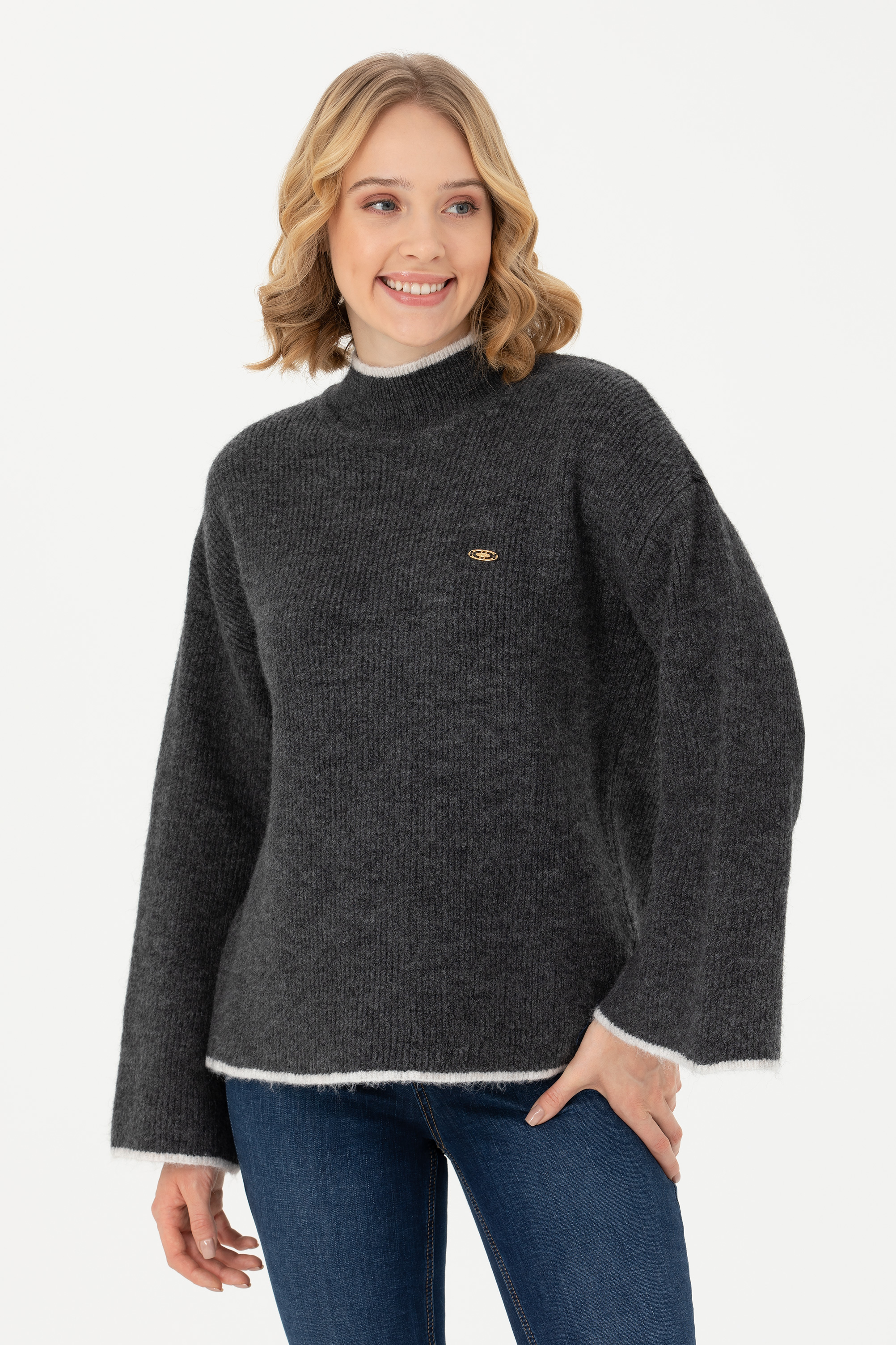 İnce detaylarla son derece şık ve göz alıcı bir parça haline gelen comfort fit kadın triko kazak modelimiz dik yakalıdır. Manşet kısmından yukarı doğru ilerleyen yırtmaç kol eklemesine sahip modelimiz, stil sahibi kadınların vazgeçilmezlerinden biridir. Polyester karışımlı iplikler kullanarak ürettiğimiz ve torba yaka forma sahip kadın triko kazak modelimize tek tıkla, sadece Online’da ulaşabilirsiniz.