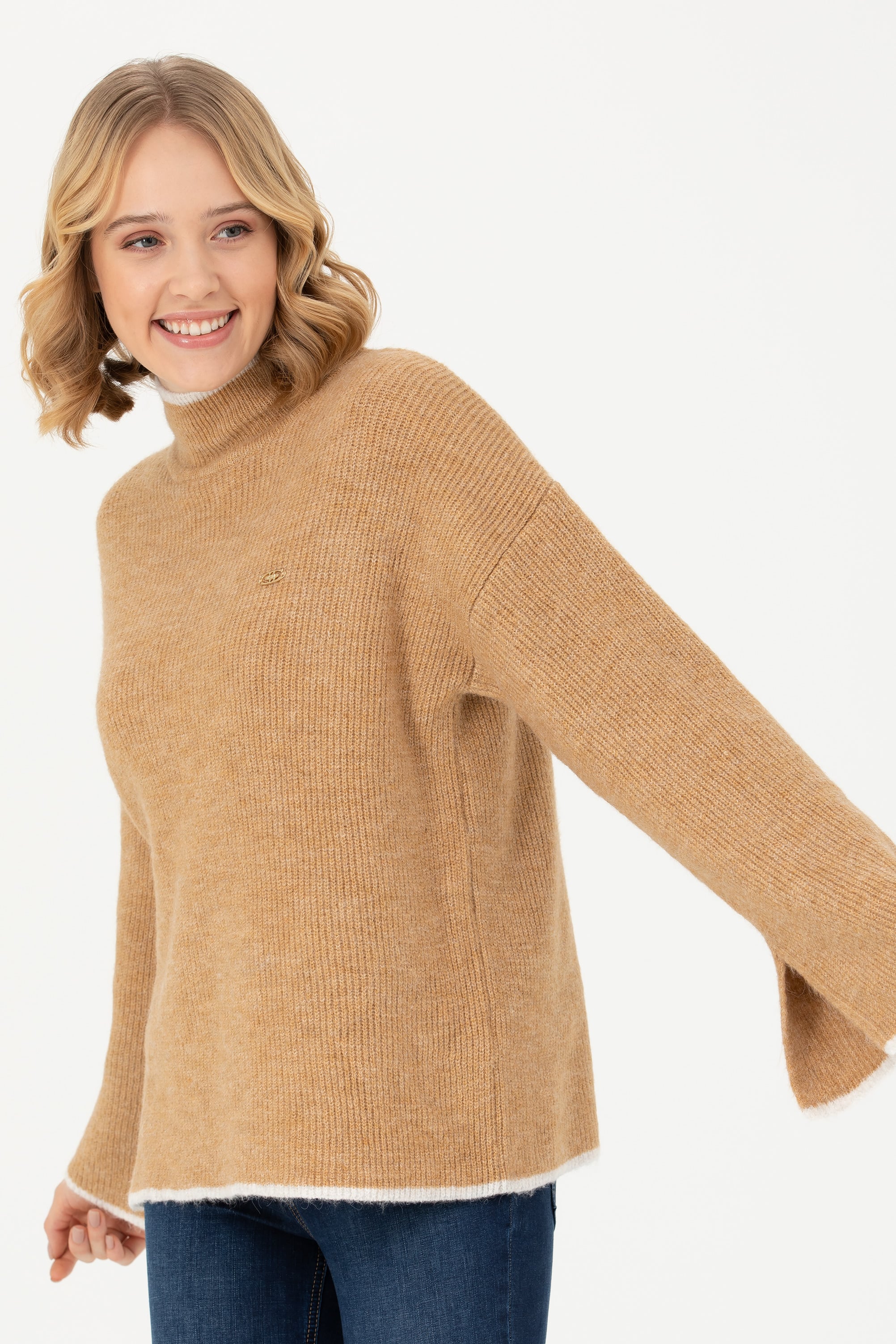 İnce detaylarla son derece şık ve göz alıcı bir parça haline gelen comfort fit kadın triko kazak modelimiz dik yakalıdır. Manşet kısmından yukarı doğru ilerleyen yırtmaç kol eklemesine sahip modelimiz, stil sahibi kadınların vazgeçilmezlerinden biridir. Polyester karışımlı iplikler kullanarak ürettiğimiz ve torba yaka forma sahip kadın triko kazak modelimize tek tıkla, sadece Online’da ulaşabilirsiniz.