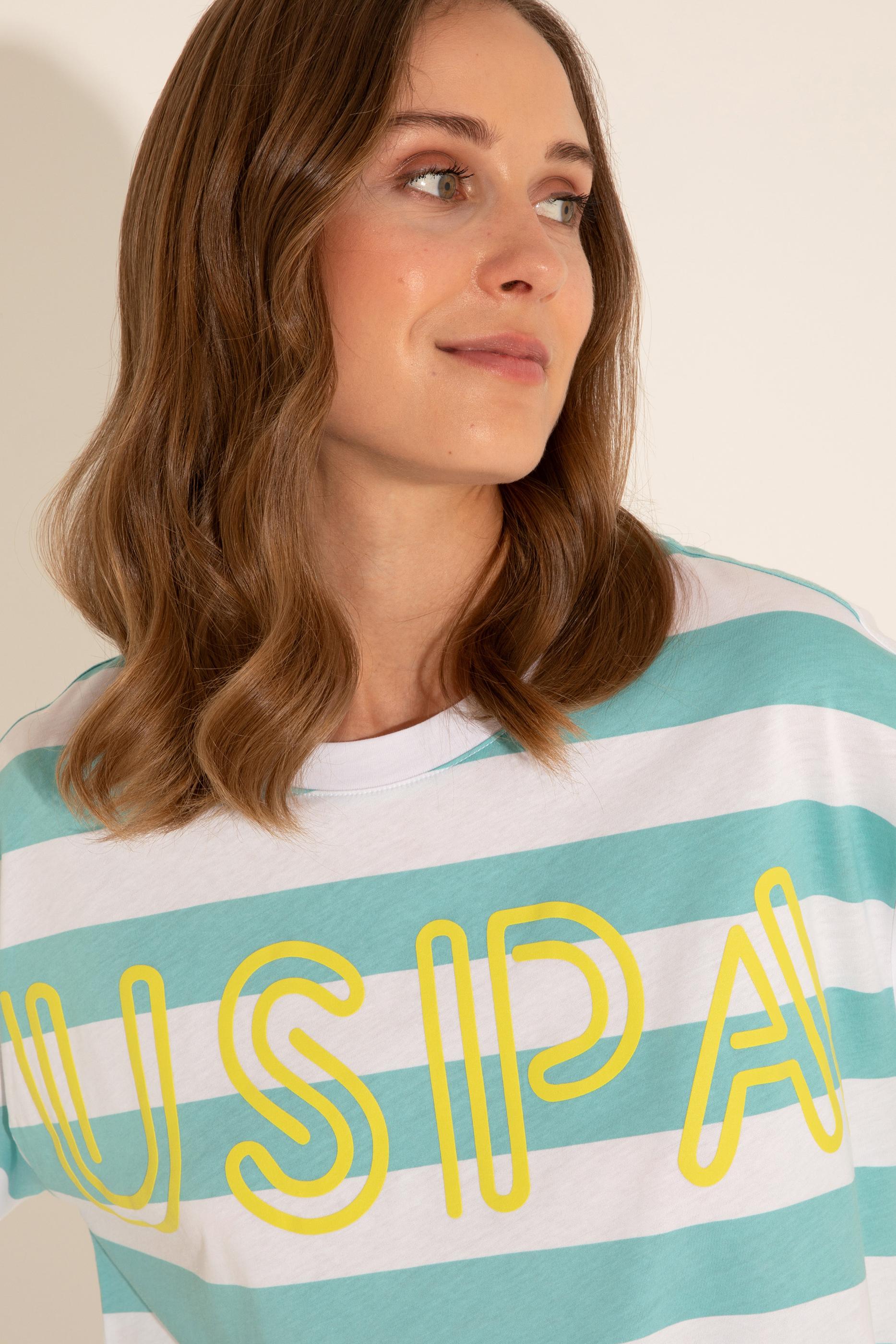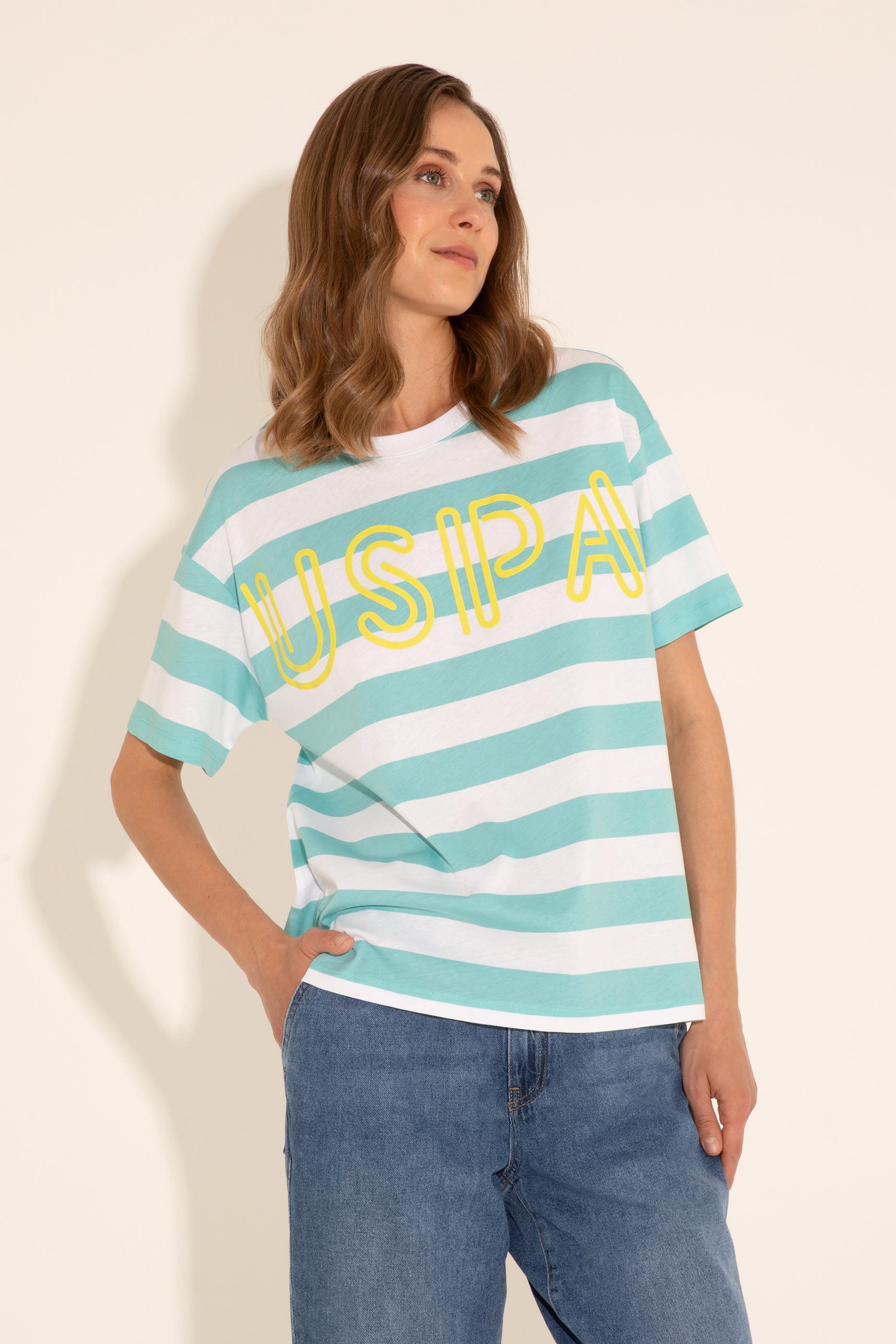 Tarzınıza canlılık katmak için tasarlanan mint çizgili baskılı tişört, ferah bir stil sağlıyor. %100 pamuk malzemesi sayesinde cildinize yumuşacık bir dokunuş hissi verir. Mint ve beyaz çizgiler yazın taze atmosferini yansıtırken, canlı sarı USPA baskısı ile dikkat çekici hale gelir.