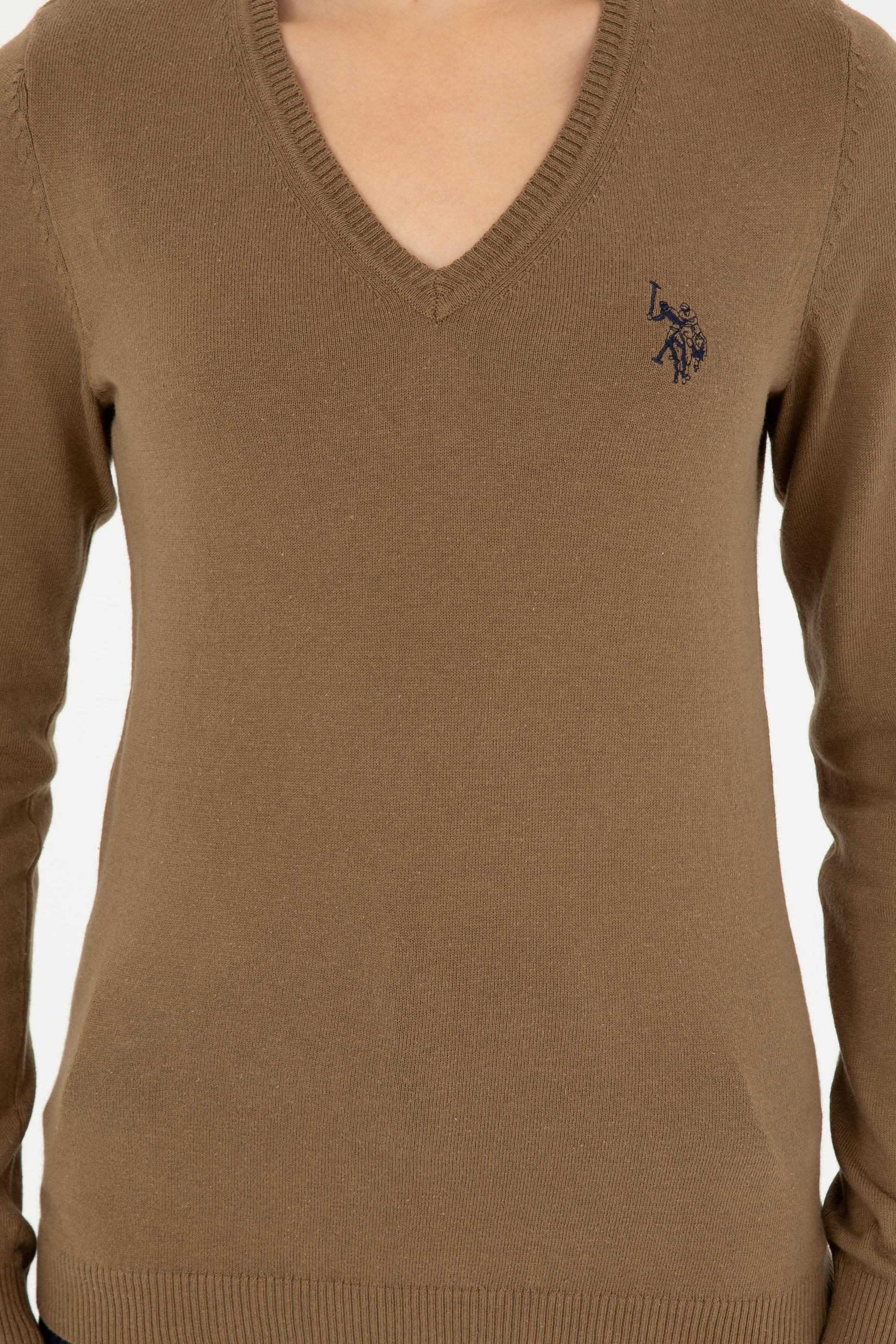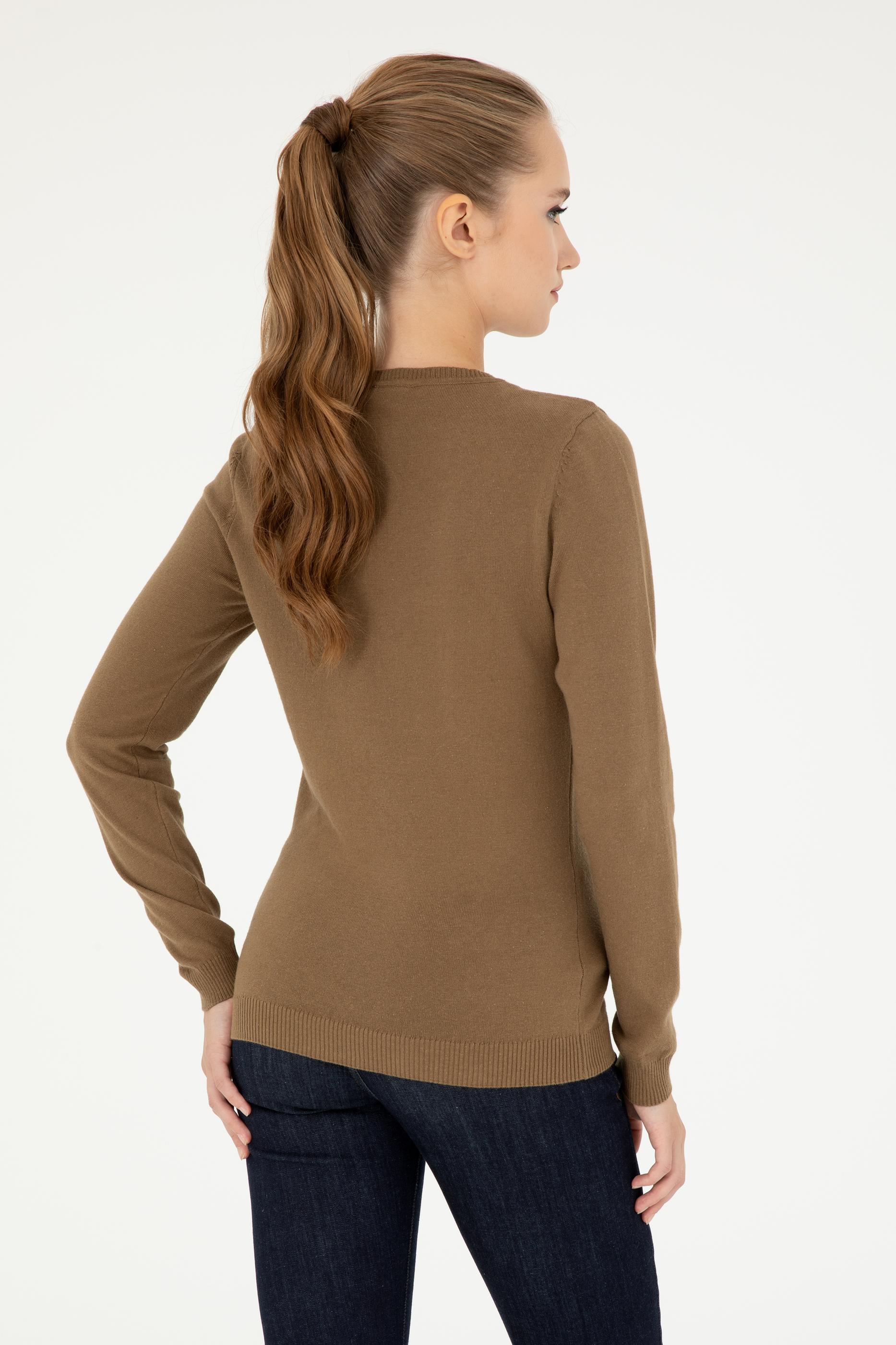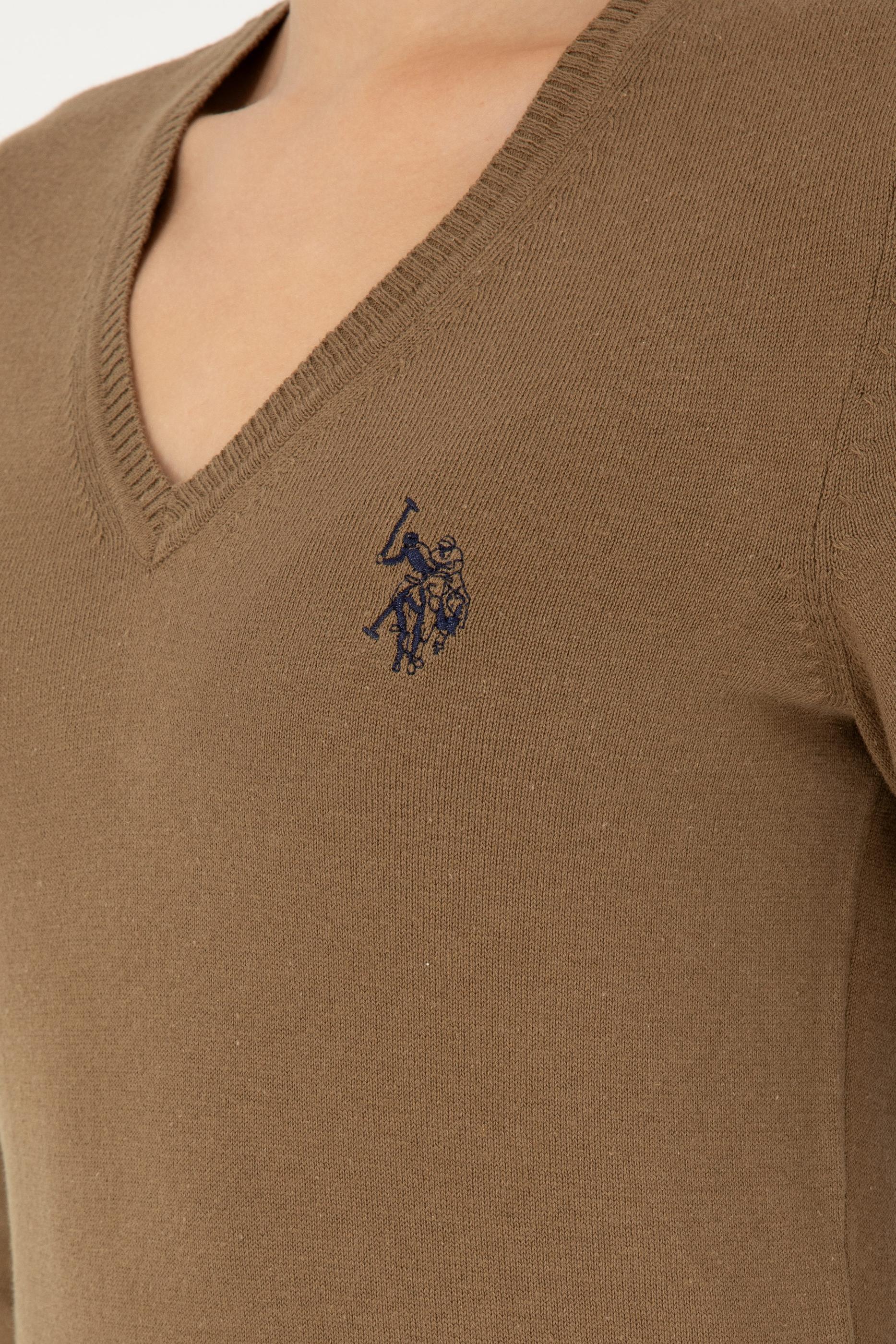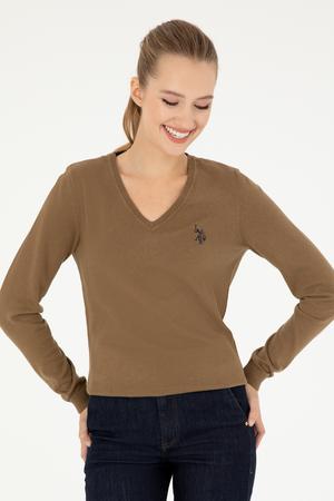 Kadın Koyu Haki Melanj V Yaka Basic Kazak