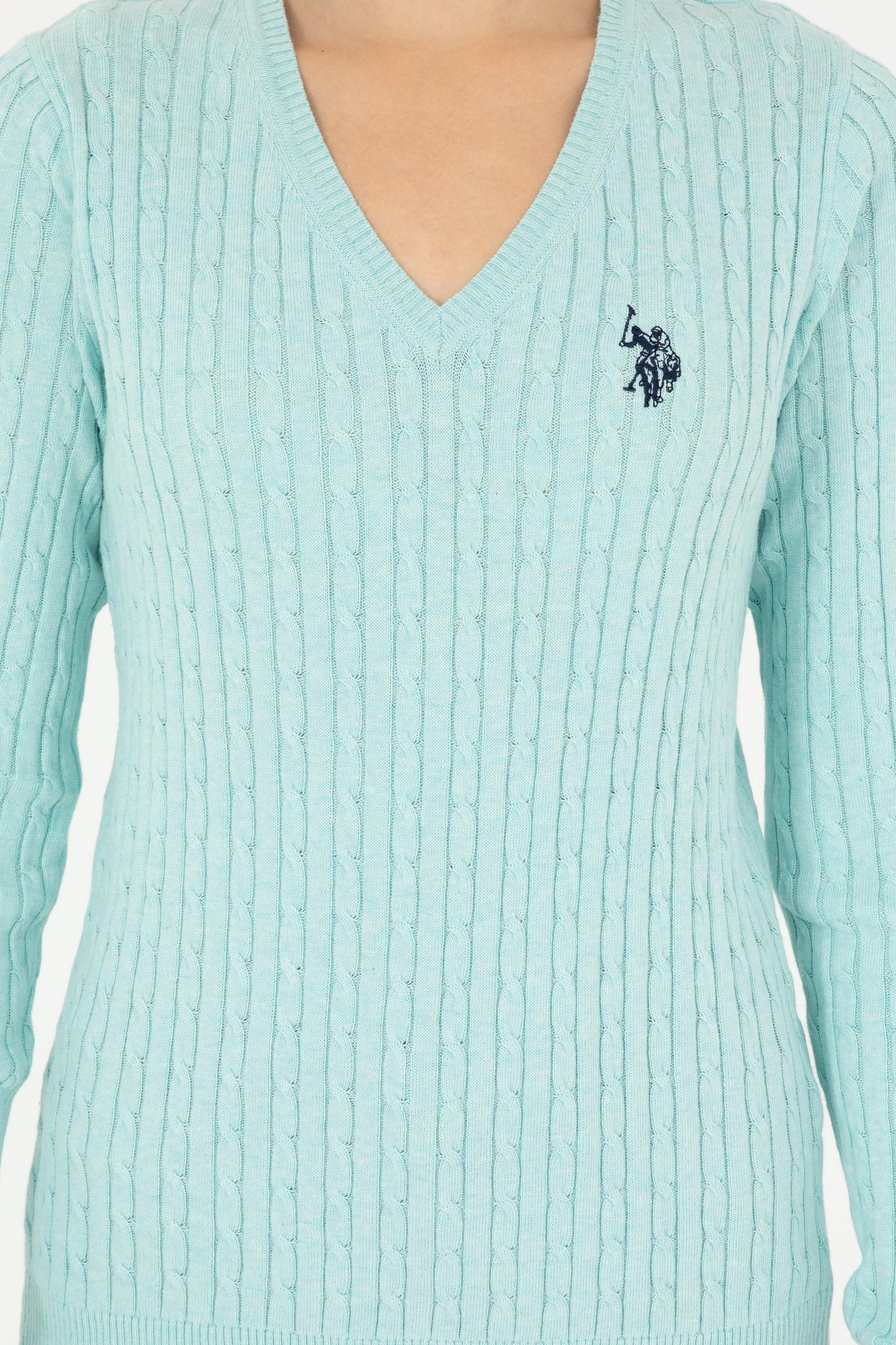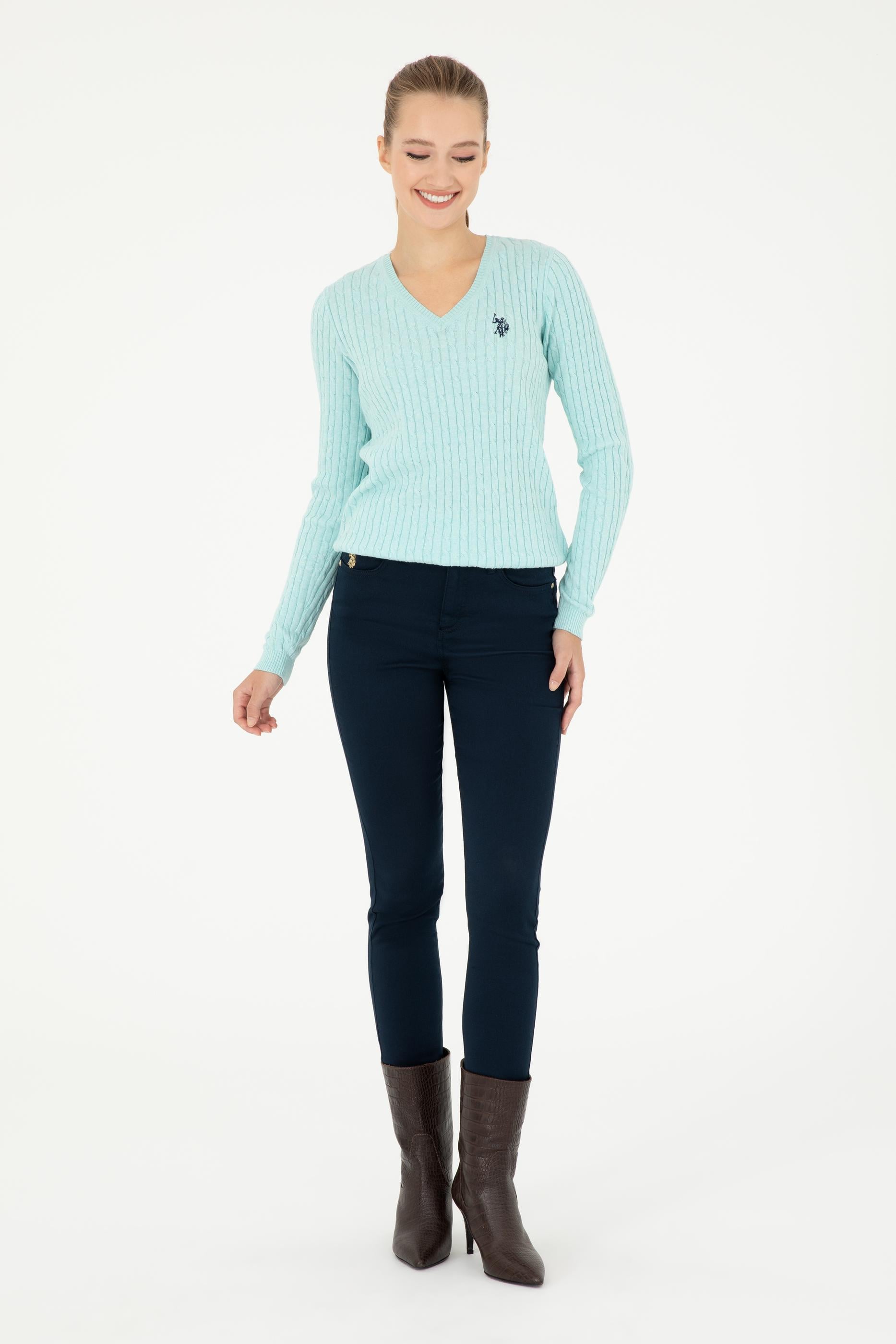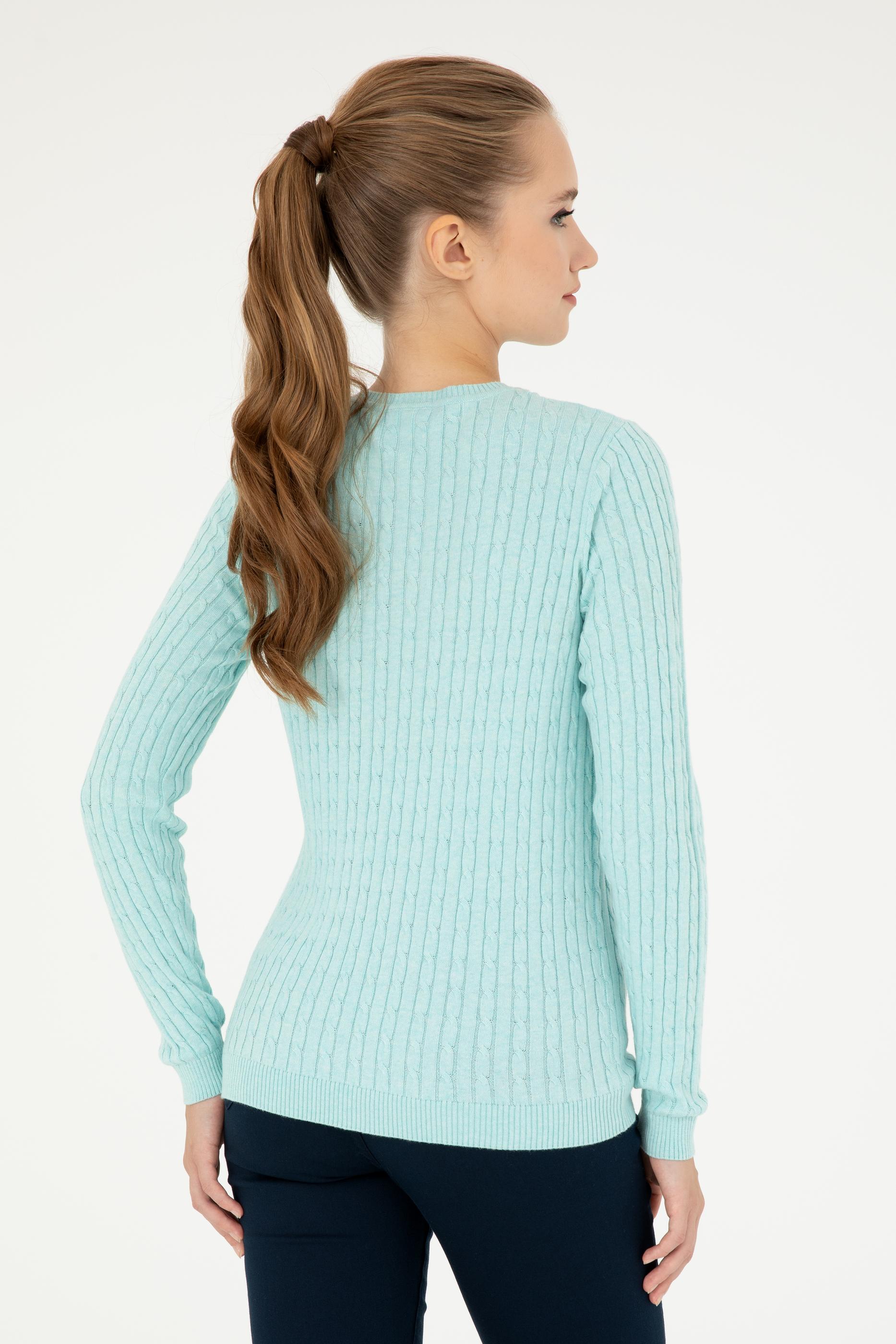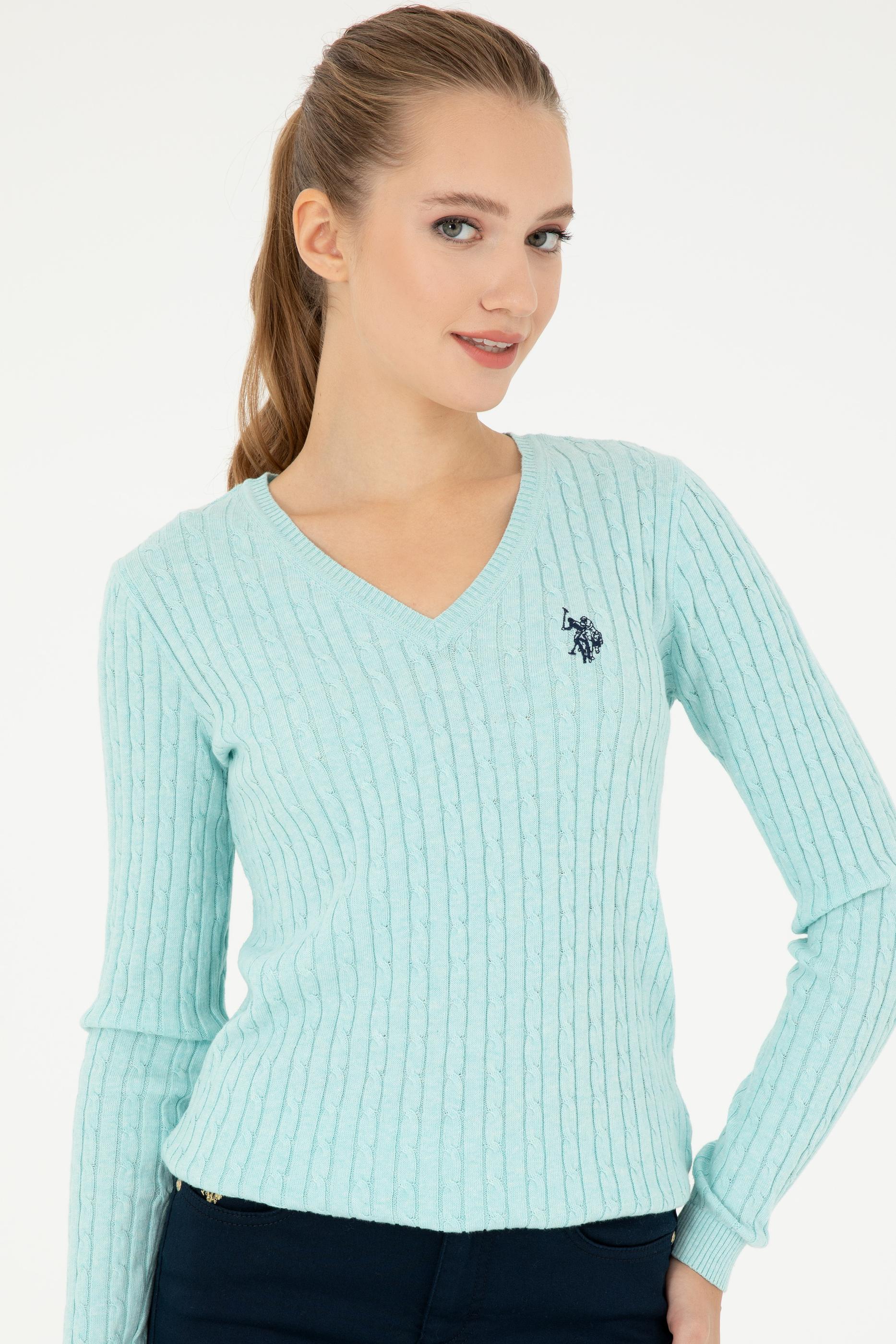 Kadın Su Yeşil V Yaka Basic Kazak