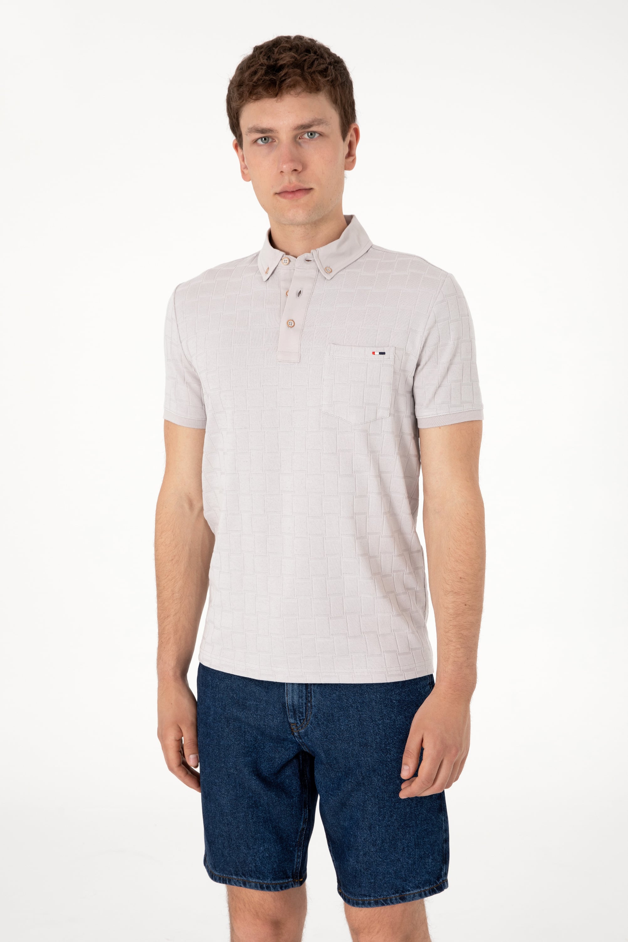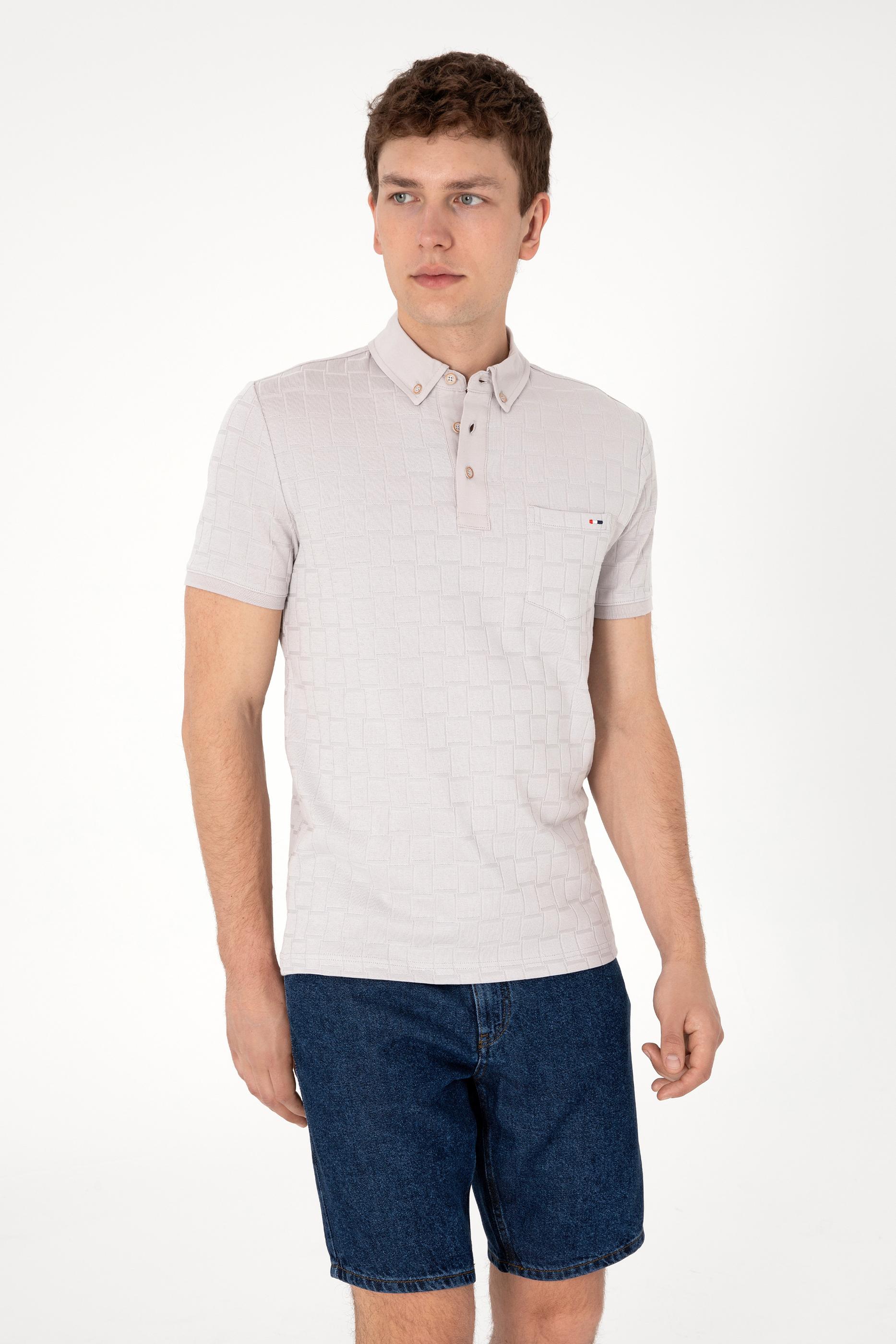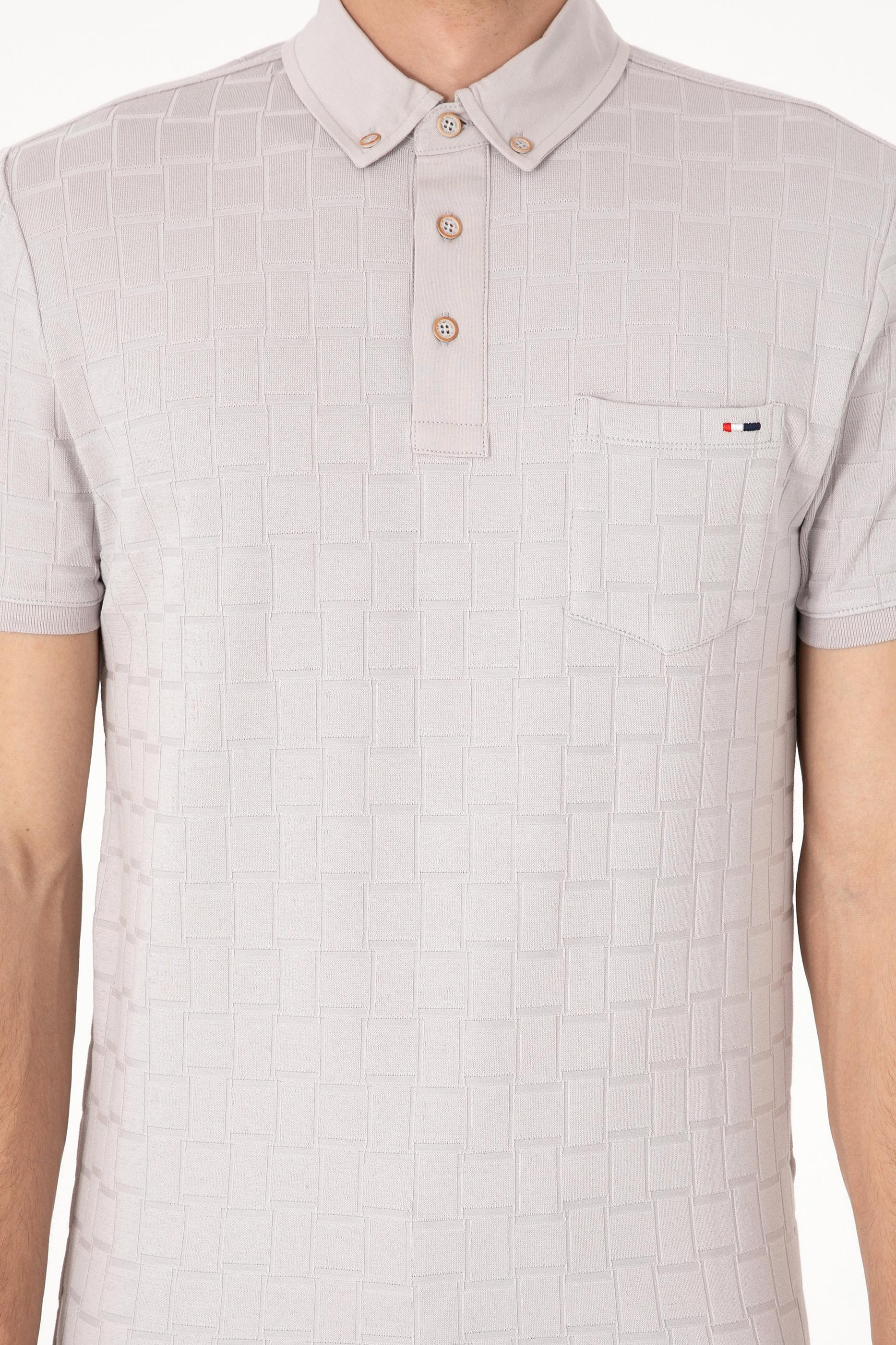 Erkek Slim Fit Polo Yaka Cepli Açık Gri Dokulu Tişört