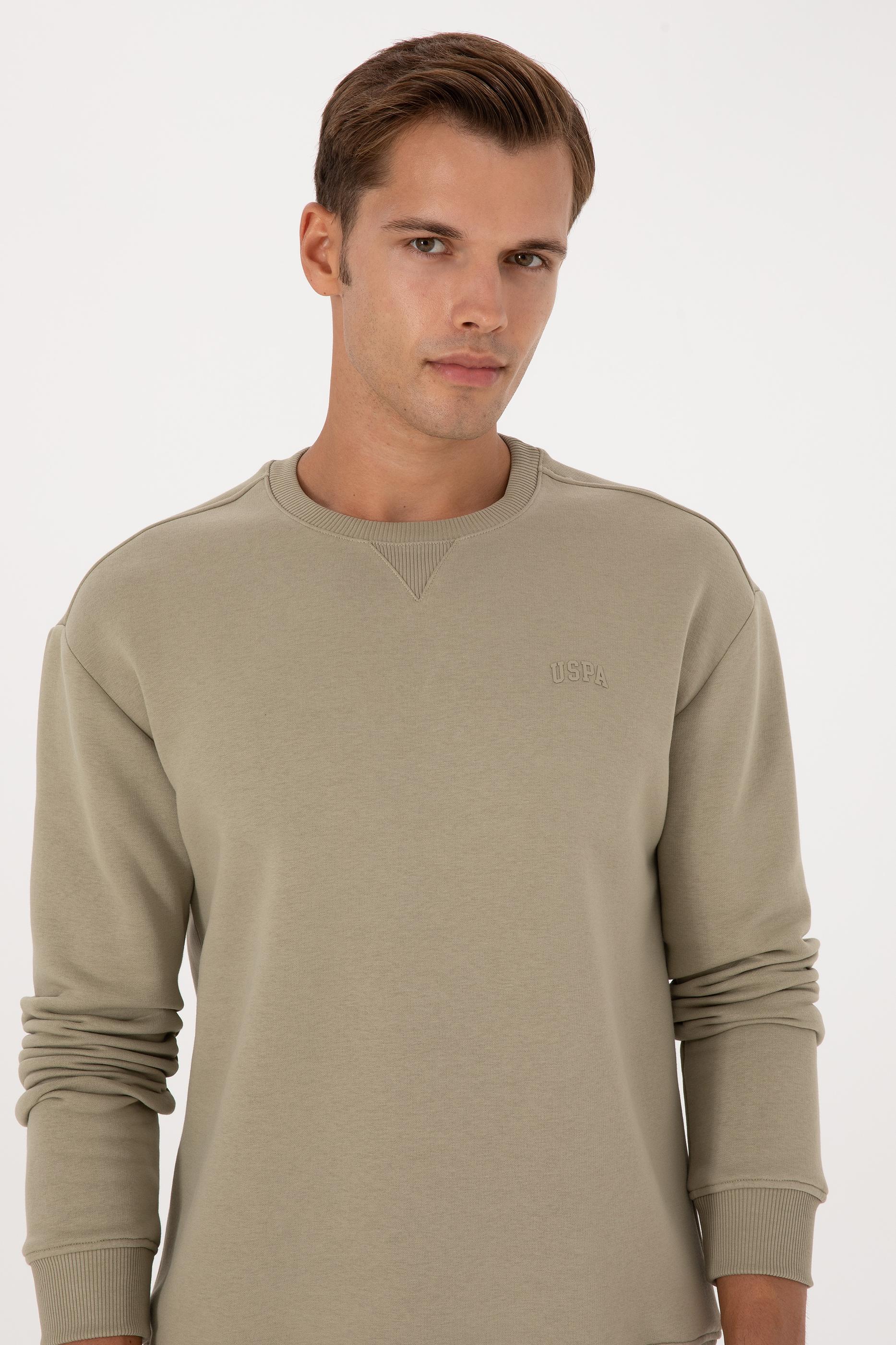 - Erkek Comfort Fit Bisiklet Yaka Şardonlu Açık Haki Basic Sweatshirt