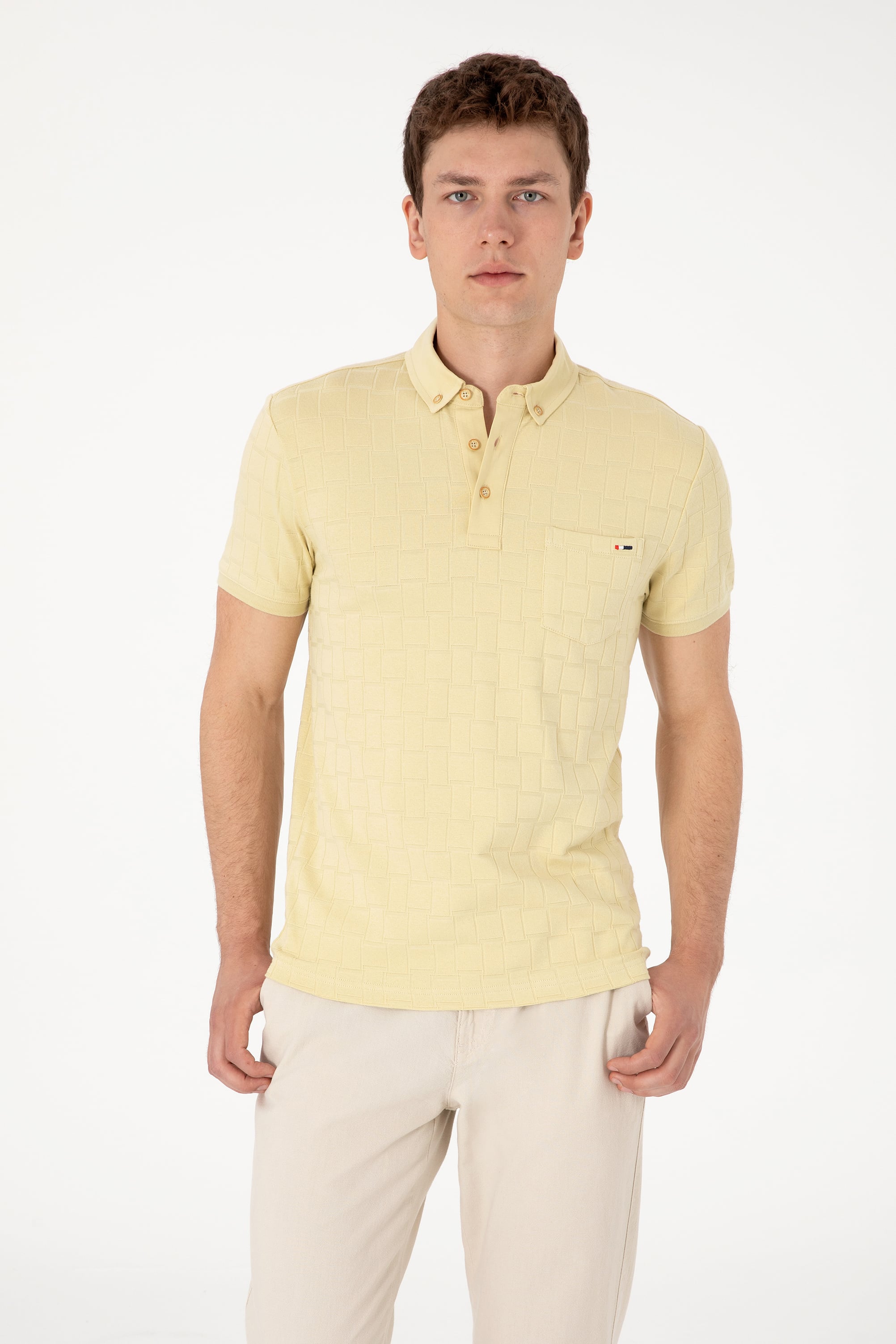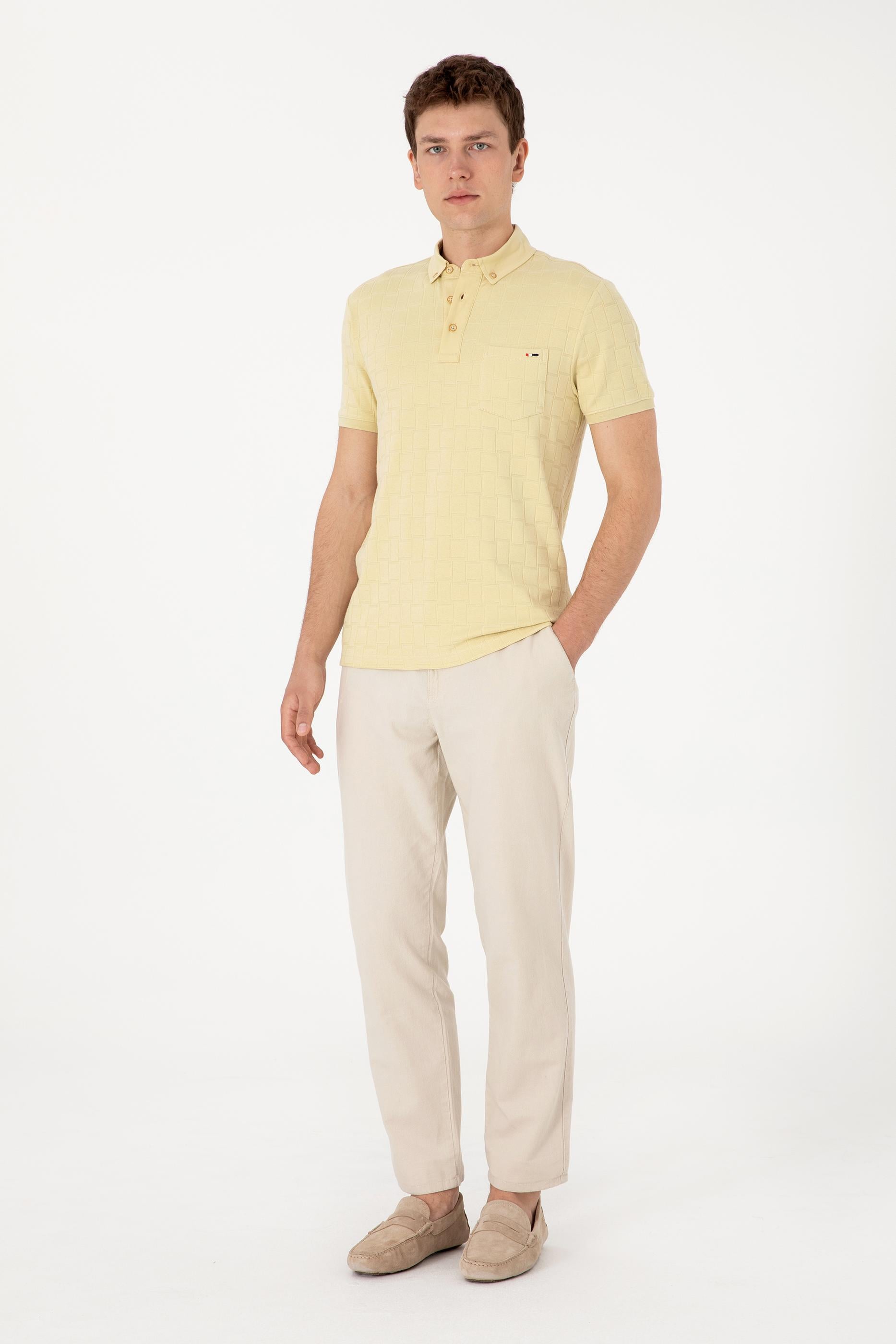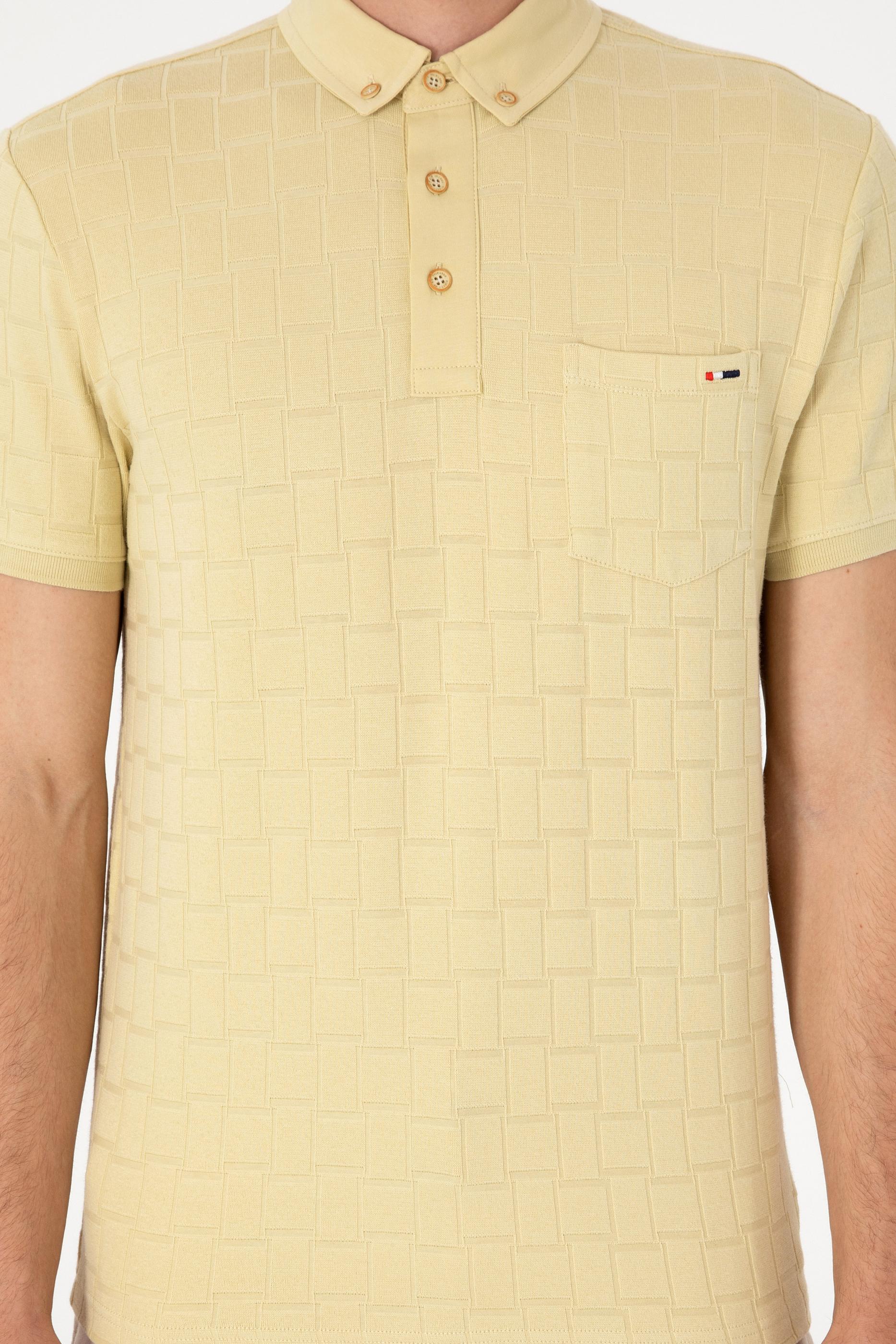 - Erkek Slim Fit Polo Yaka Cepli Açık Haki Dokulu Tişört