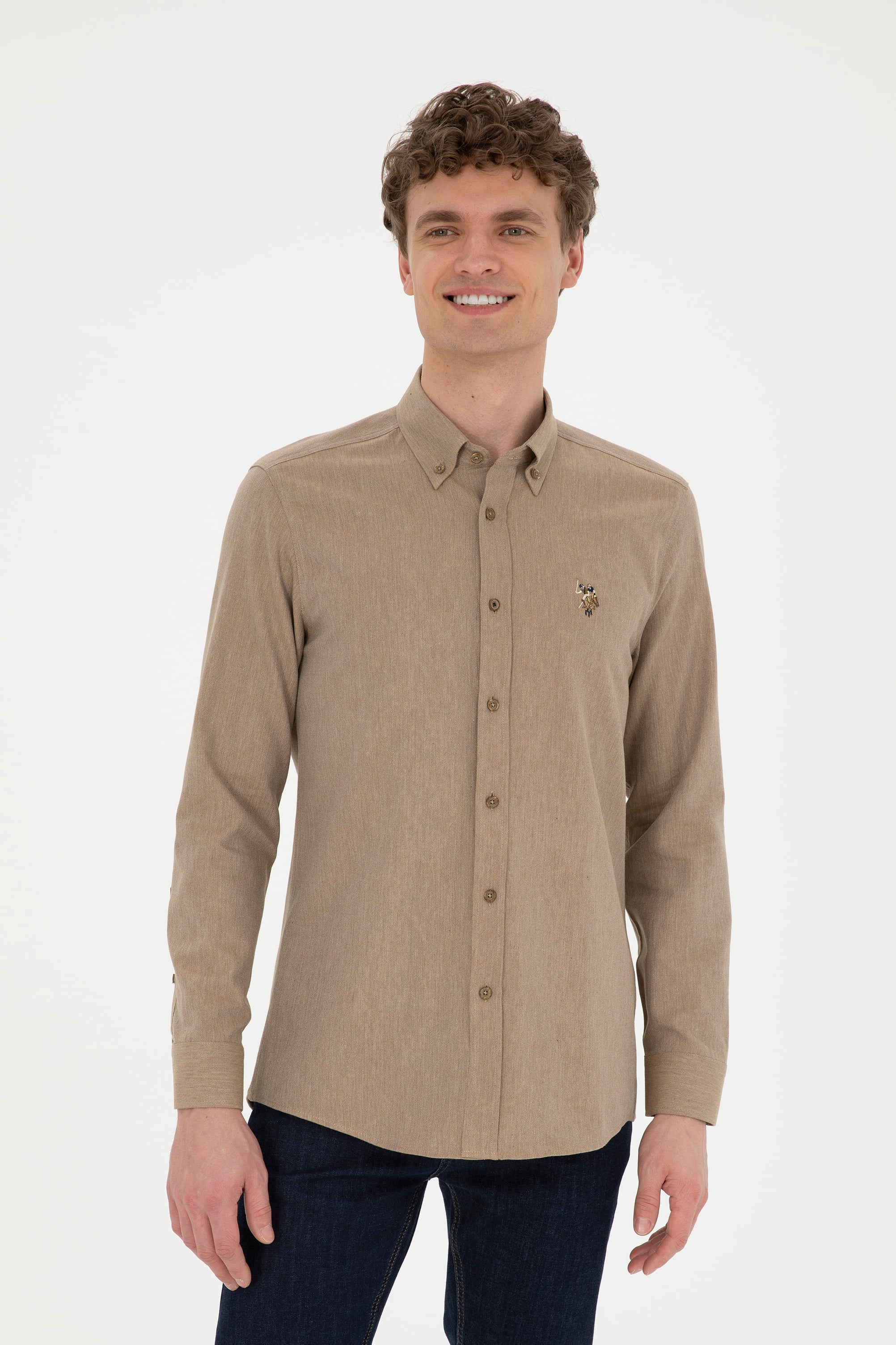 - Erkek Açık Haki Uzun Kollu Basic Gömlek
