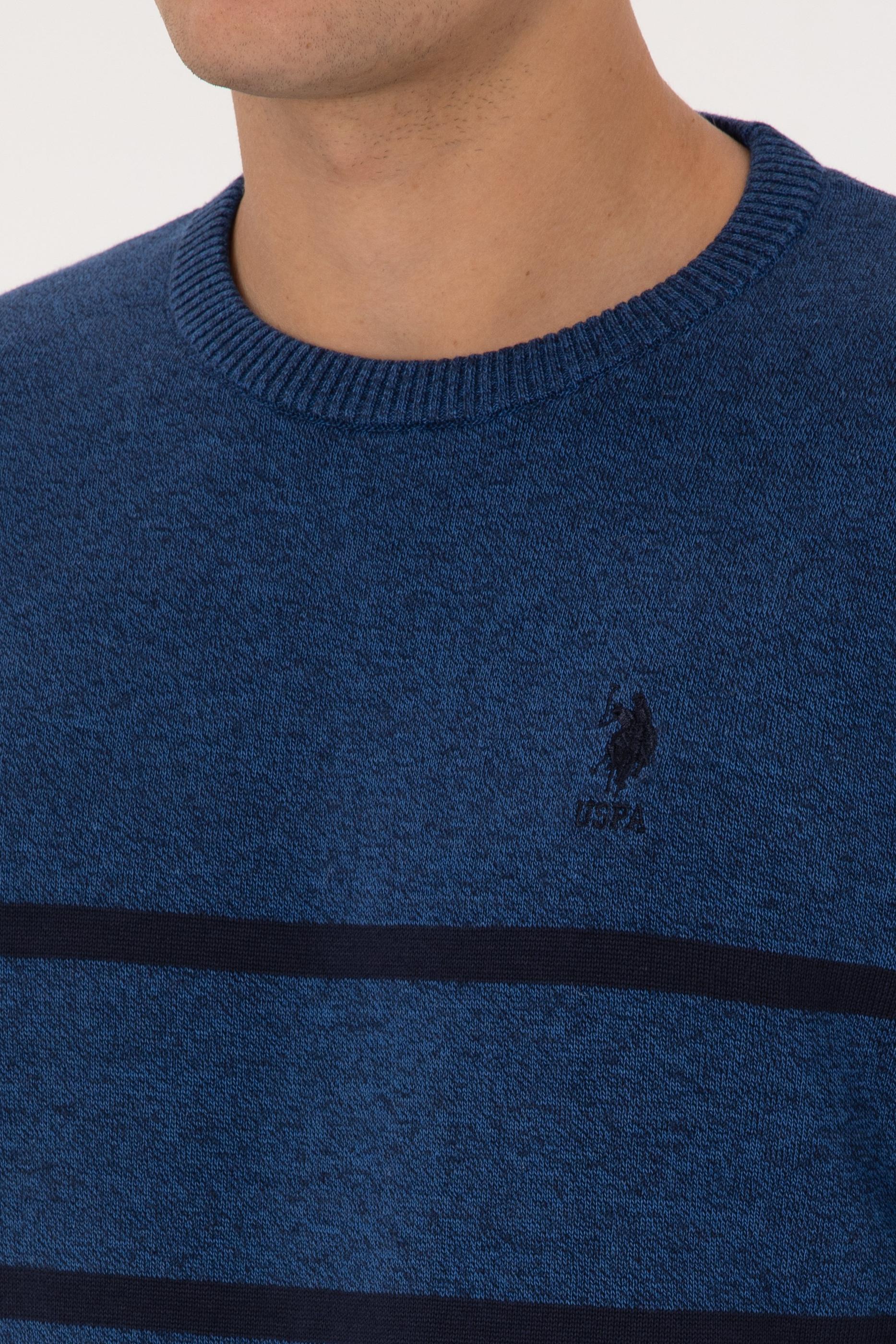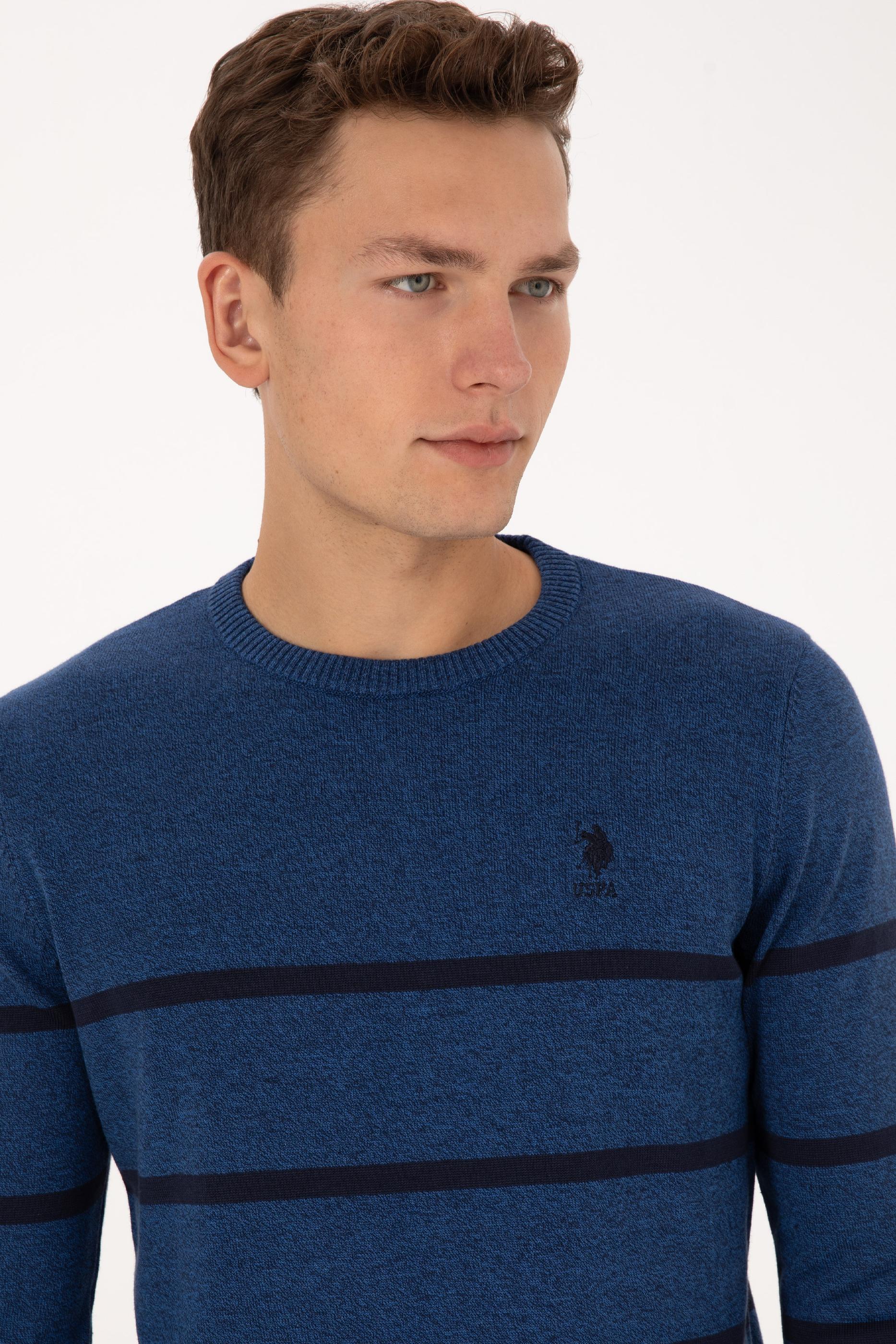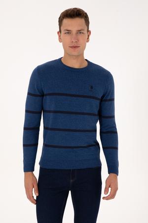 Erkek Slim Fit Bisiklet Yaka Çizgili Açık Lacivert Kazak