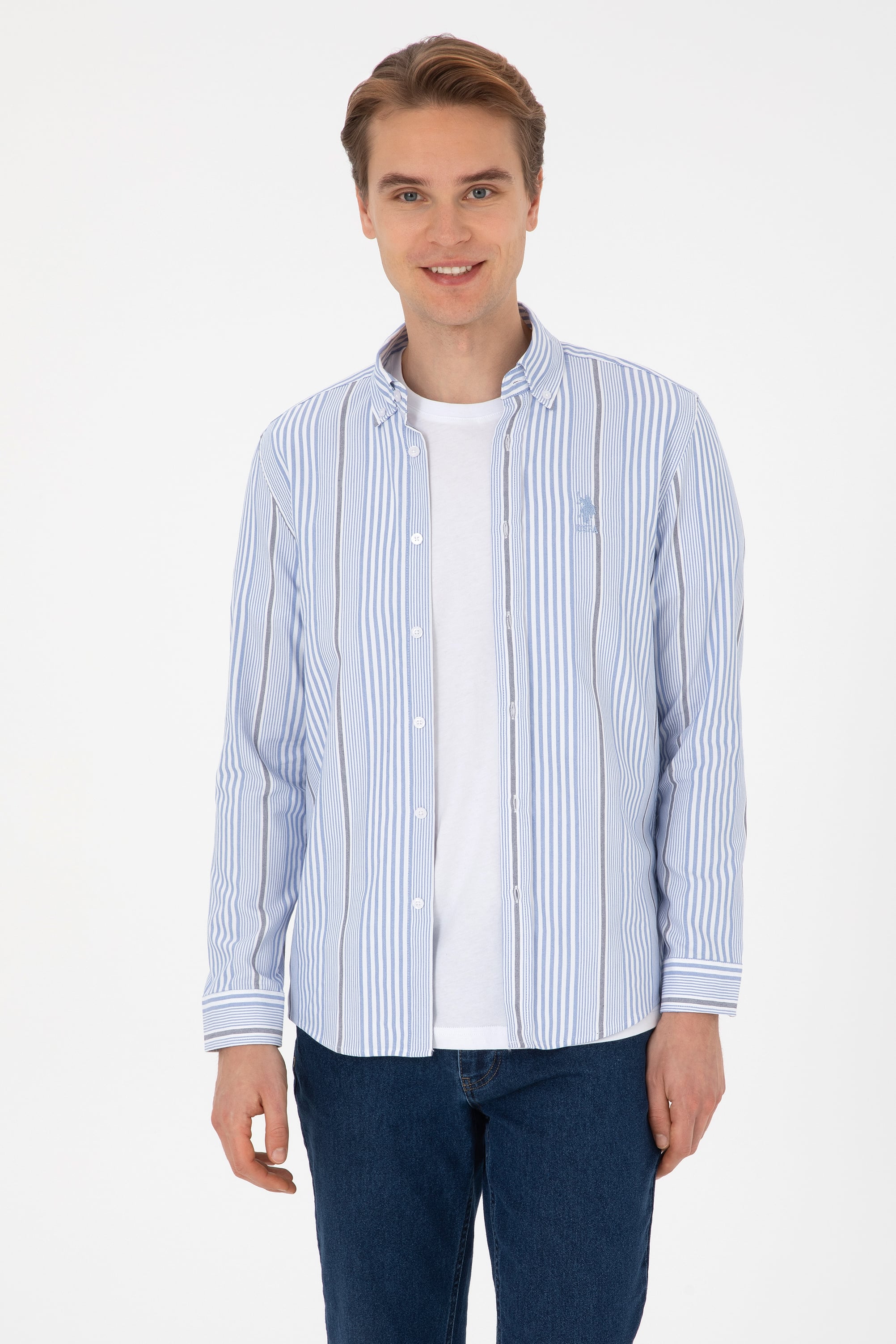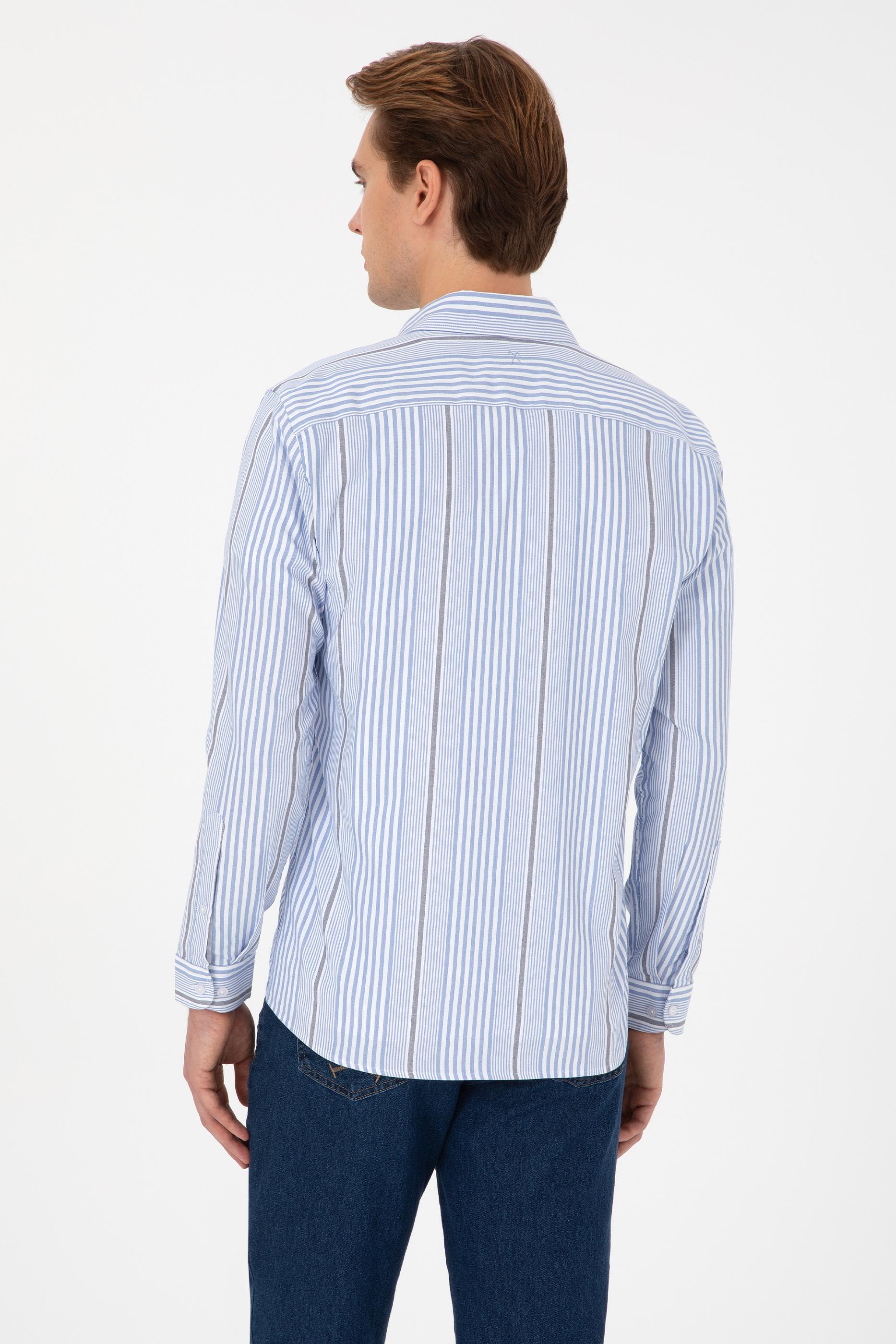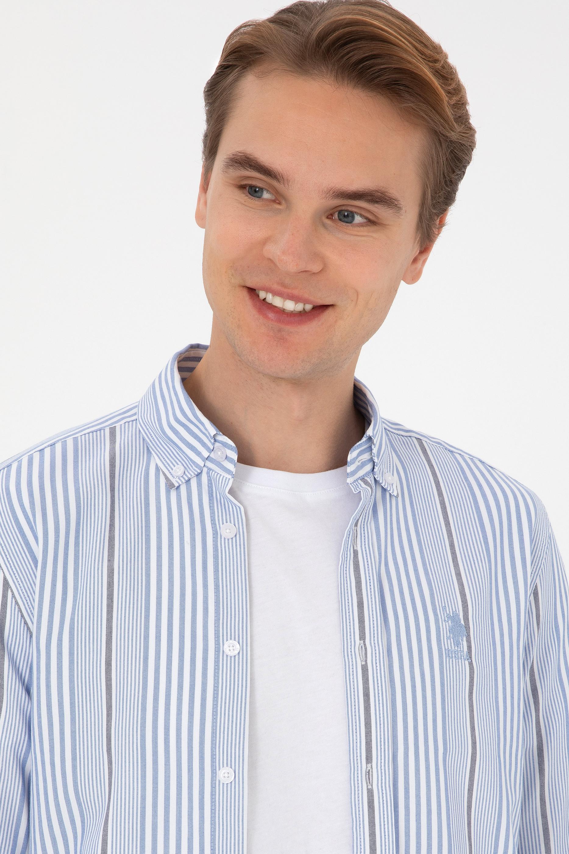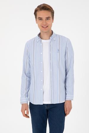 Erkek Beyaz Çizgili Uzun Kollu Açık Mavi Gömlek