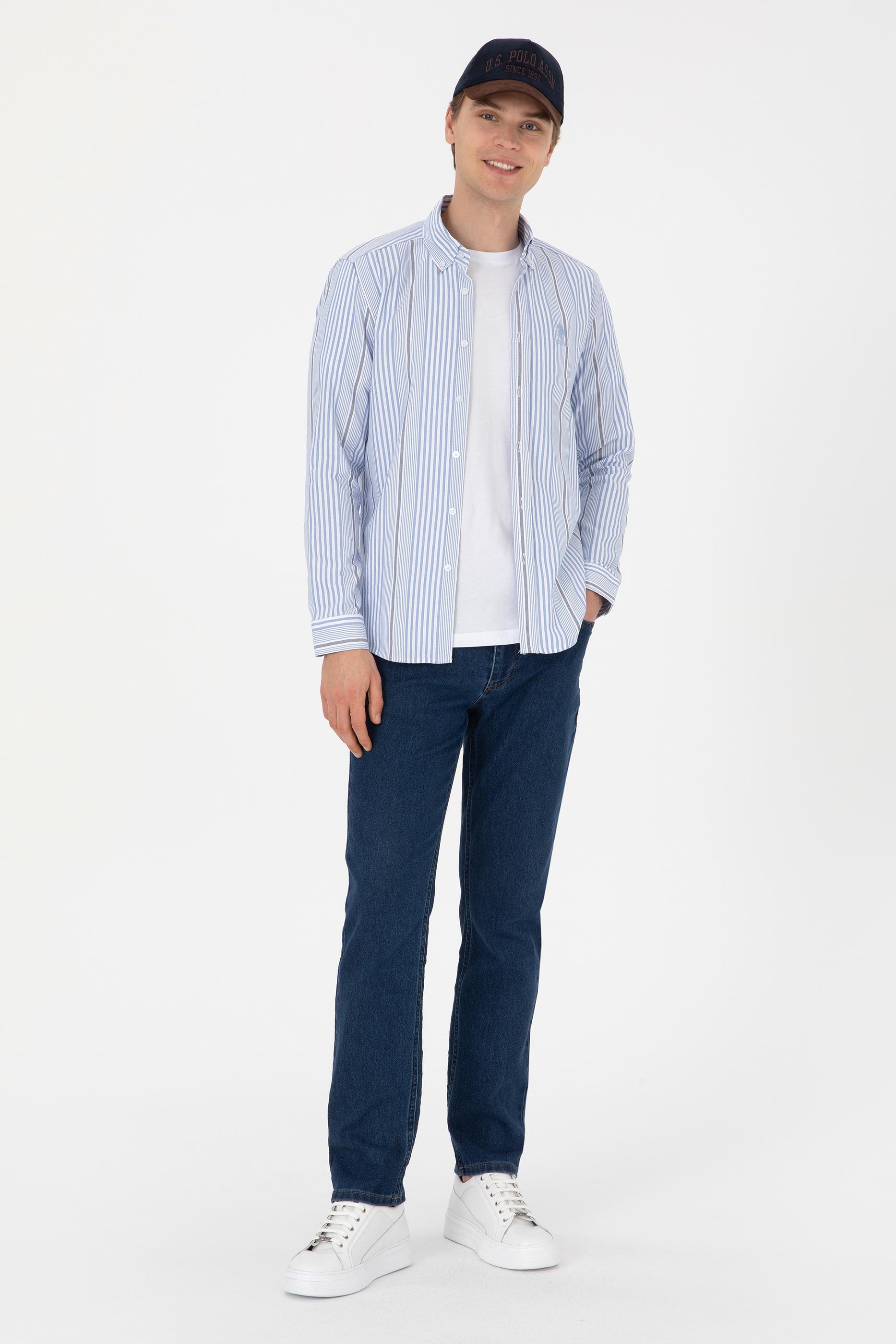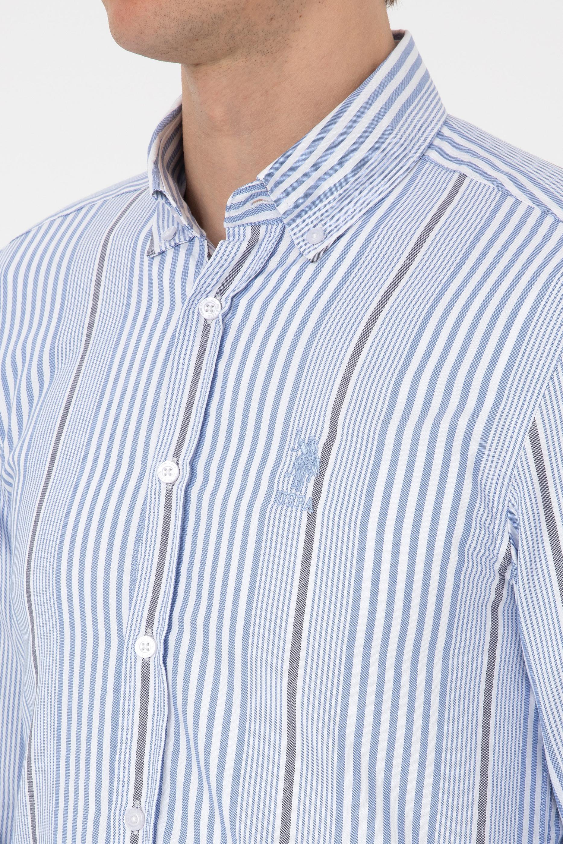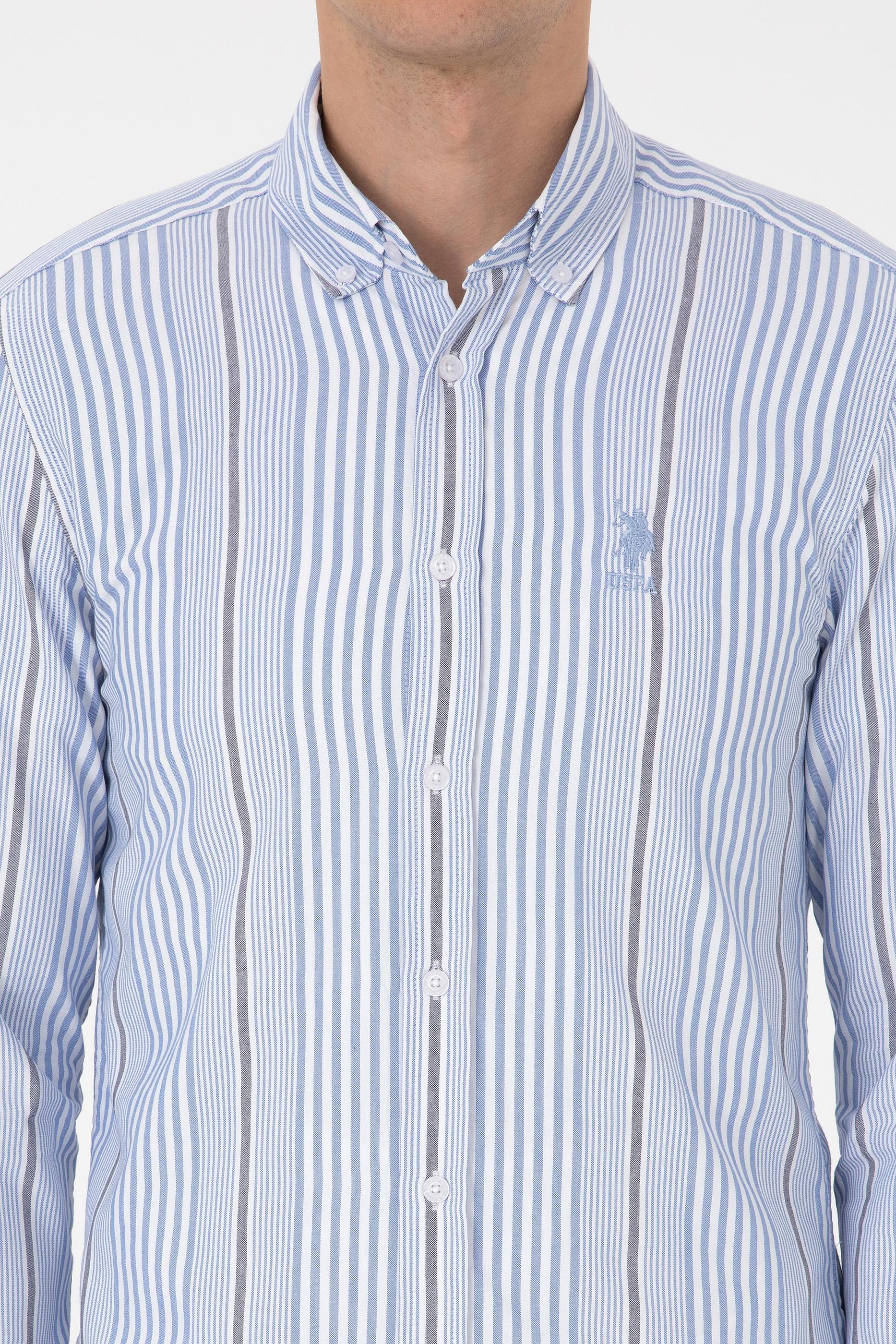 Erkek Beyaz Çizgili Uzun Kollu Açık Mavi Gömlek