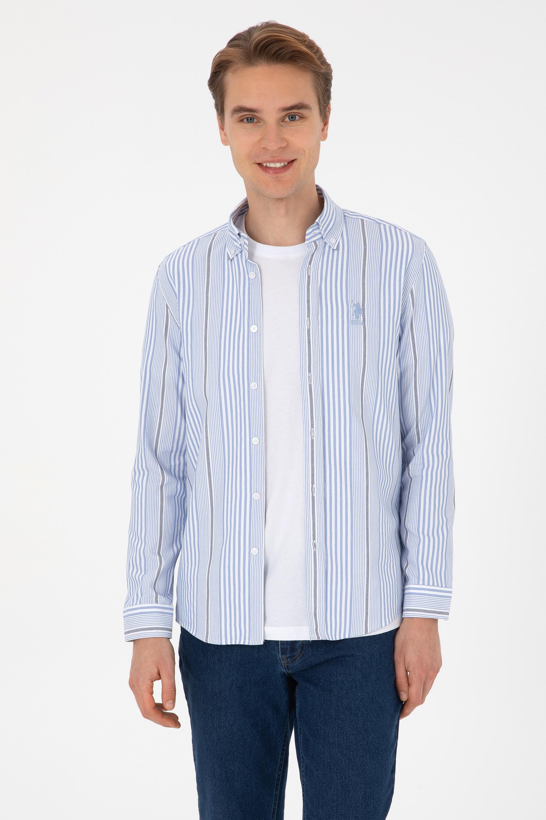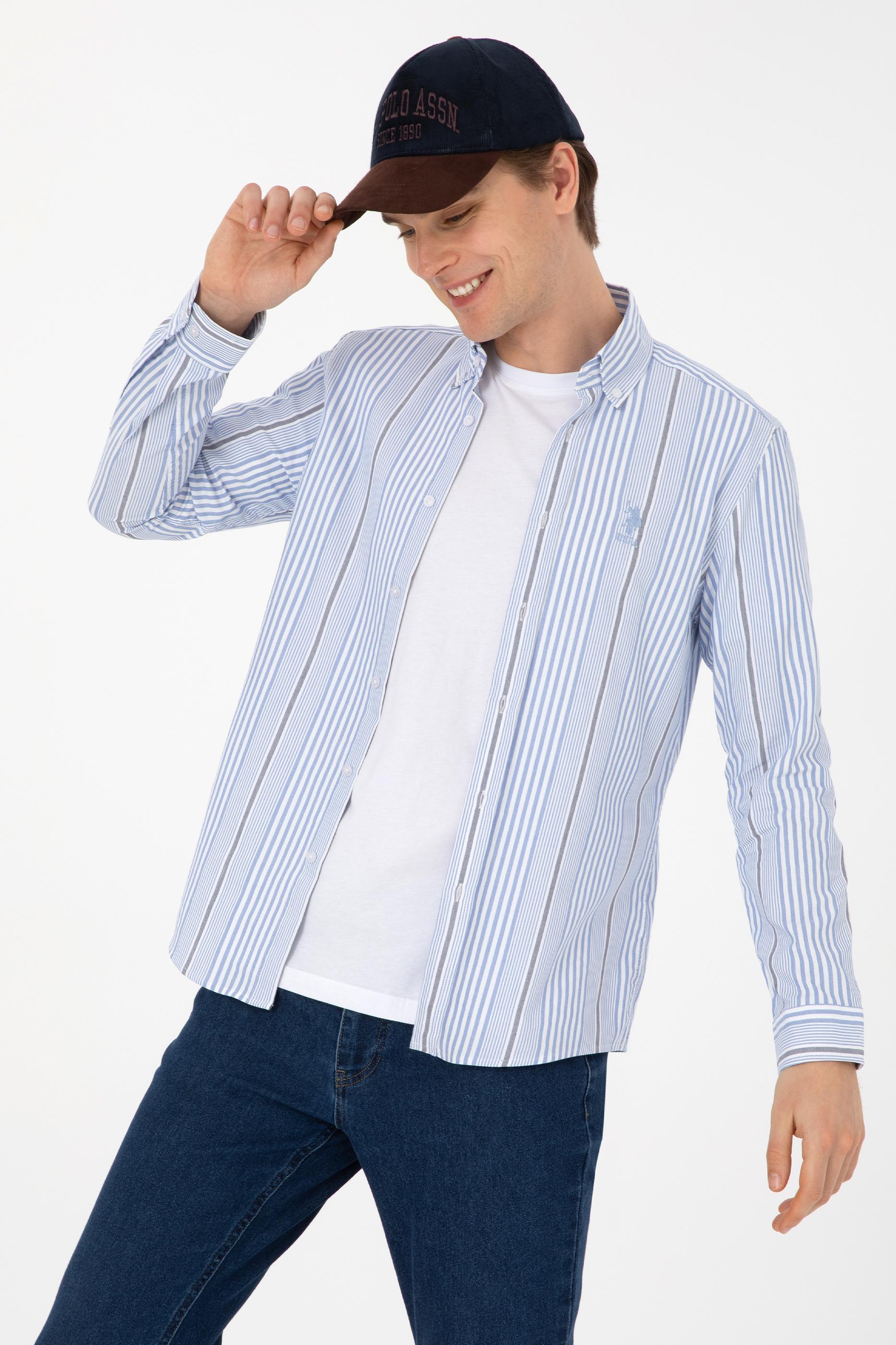 - Erkek Beyaz Çizgili Uzun Kollu Açık Mavi Gömlek