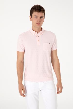 - Erkek Slim Fit Polo Yaka Cepli Açık Pembe Dokulu Tişört