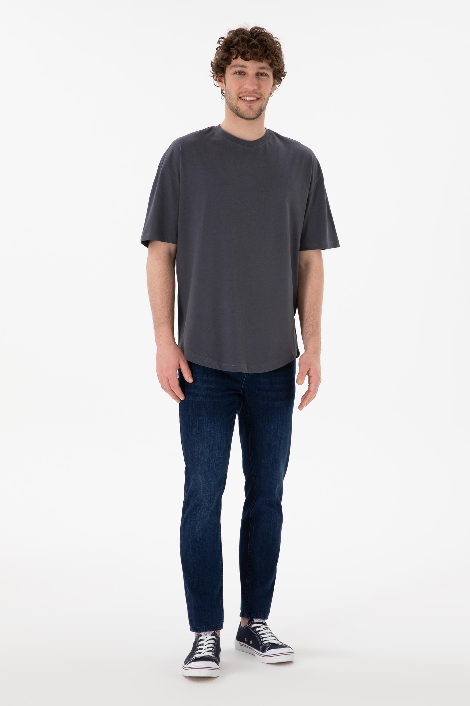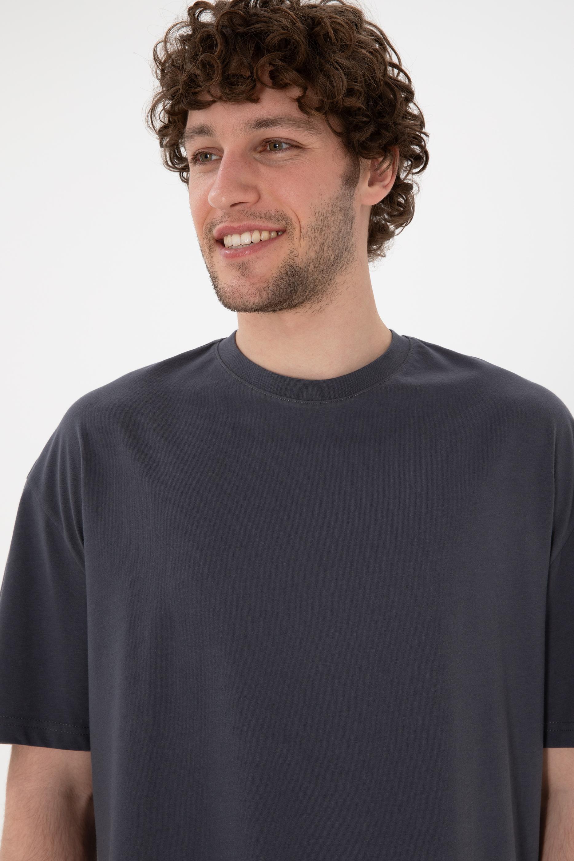 Erkek Long Fit Bisiklet Yaka Antrasit Basic Tişört