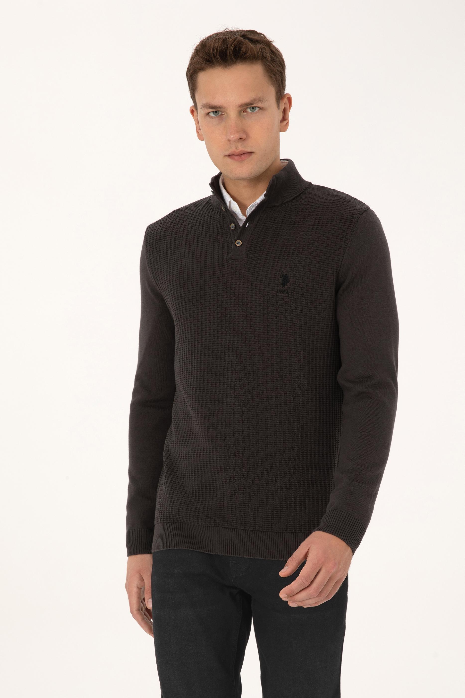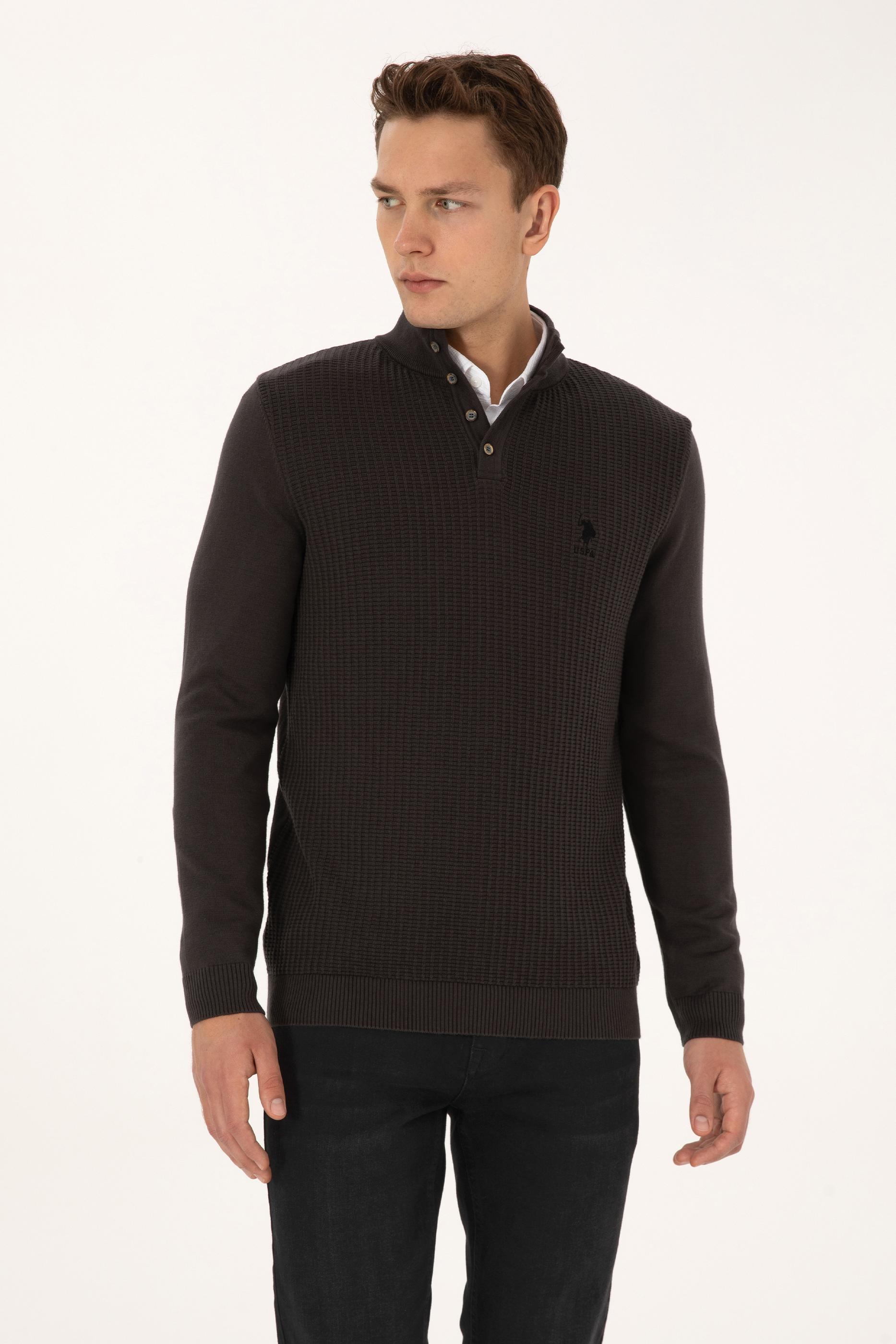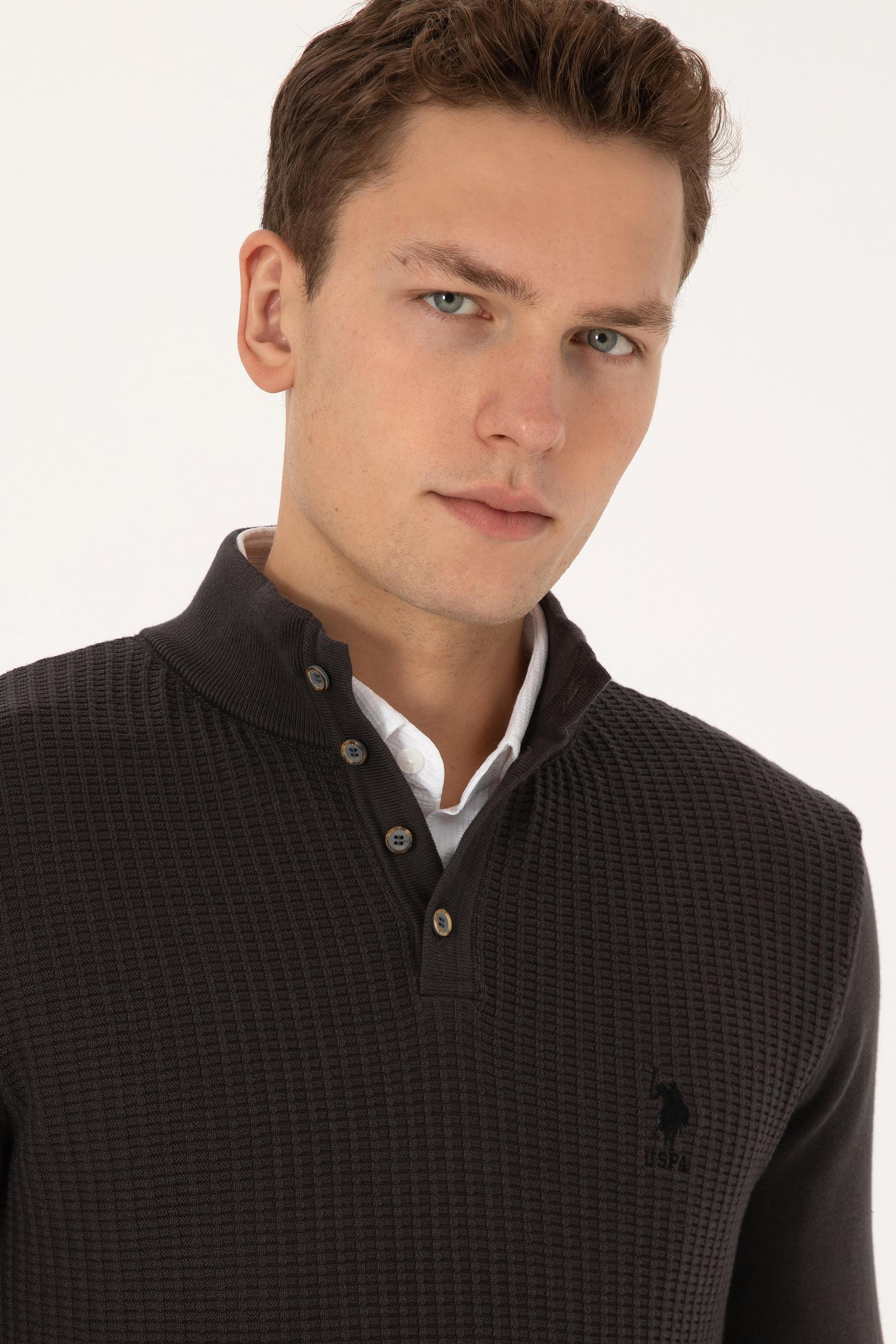 - Erkek Regular Fit Düğmeli Yaka Antrasit Melanj Kazak