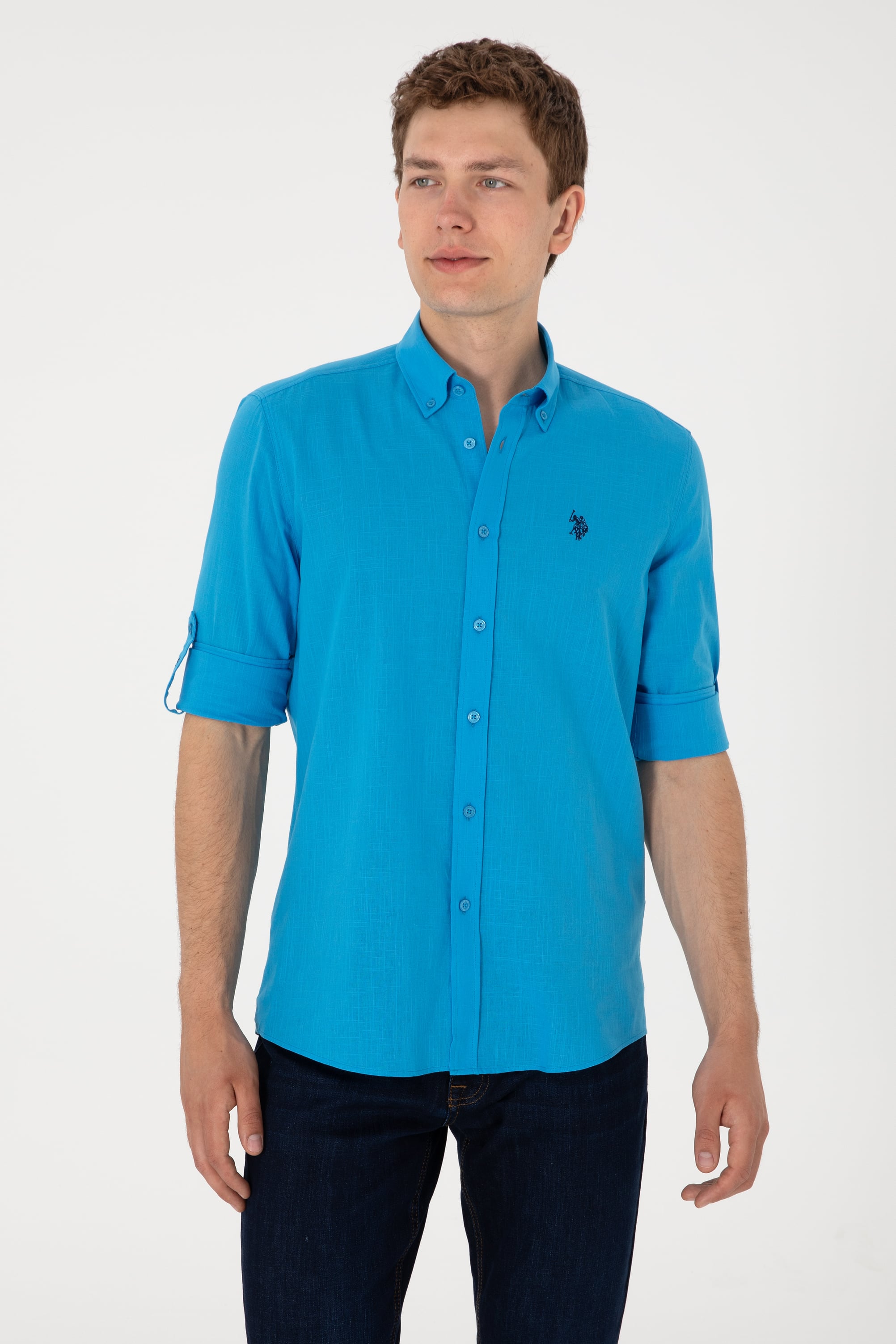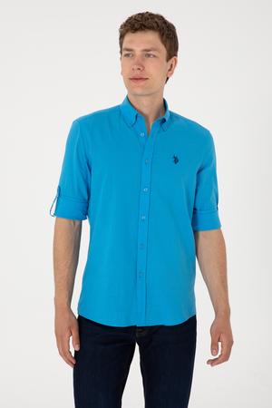 - Erkek Mavi Keten Görünümlü Basic Gömlek