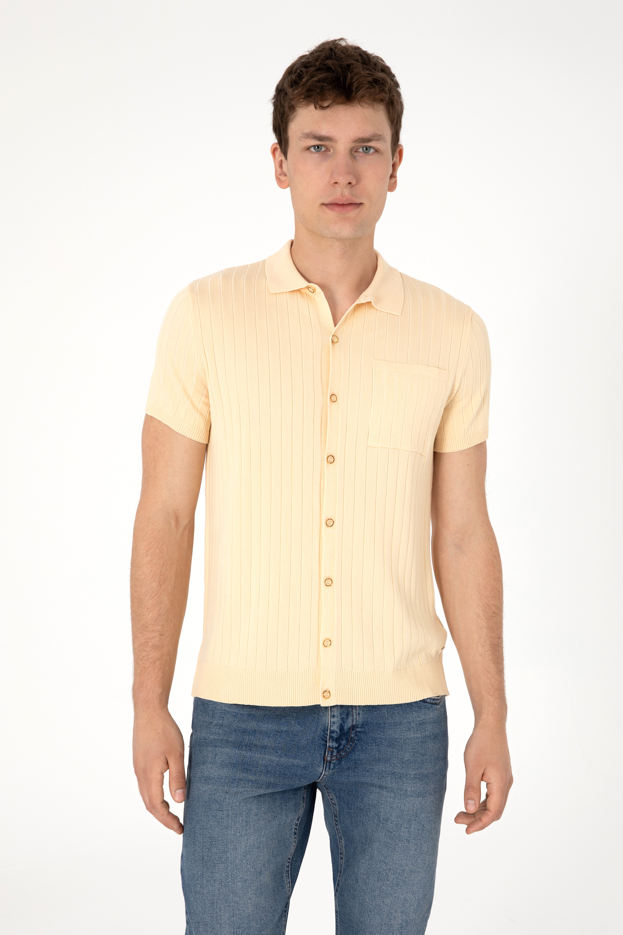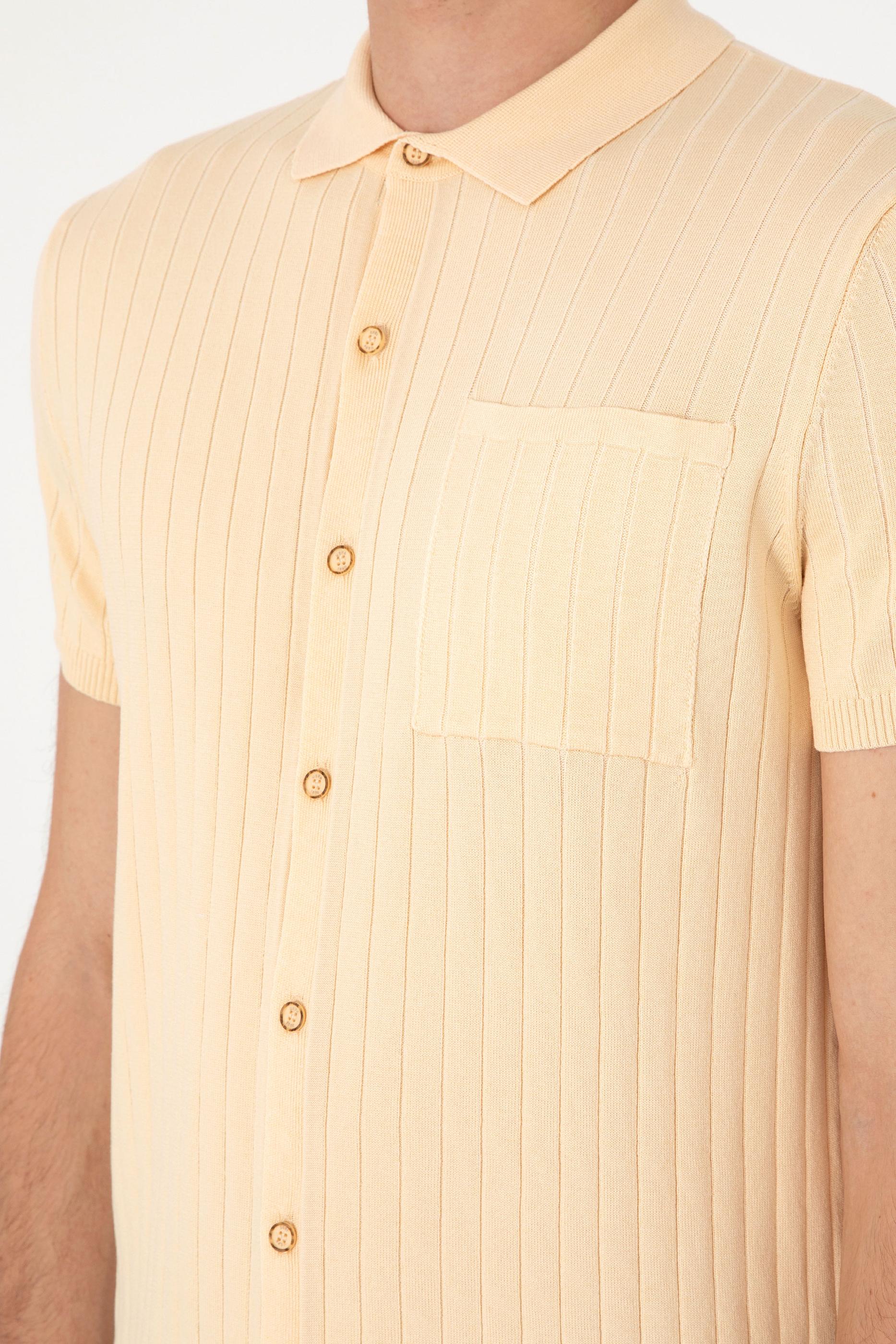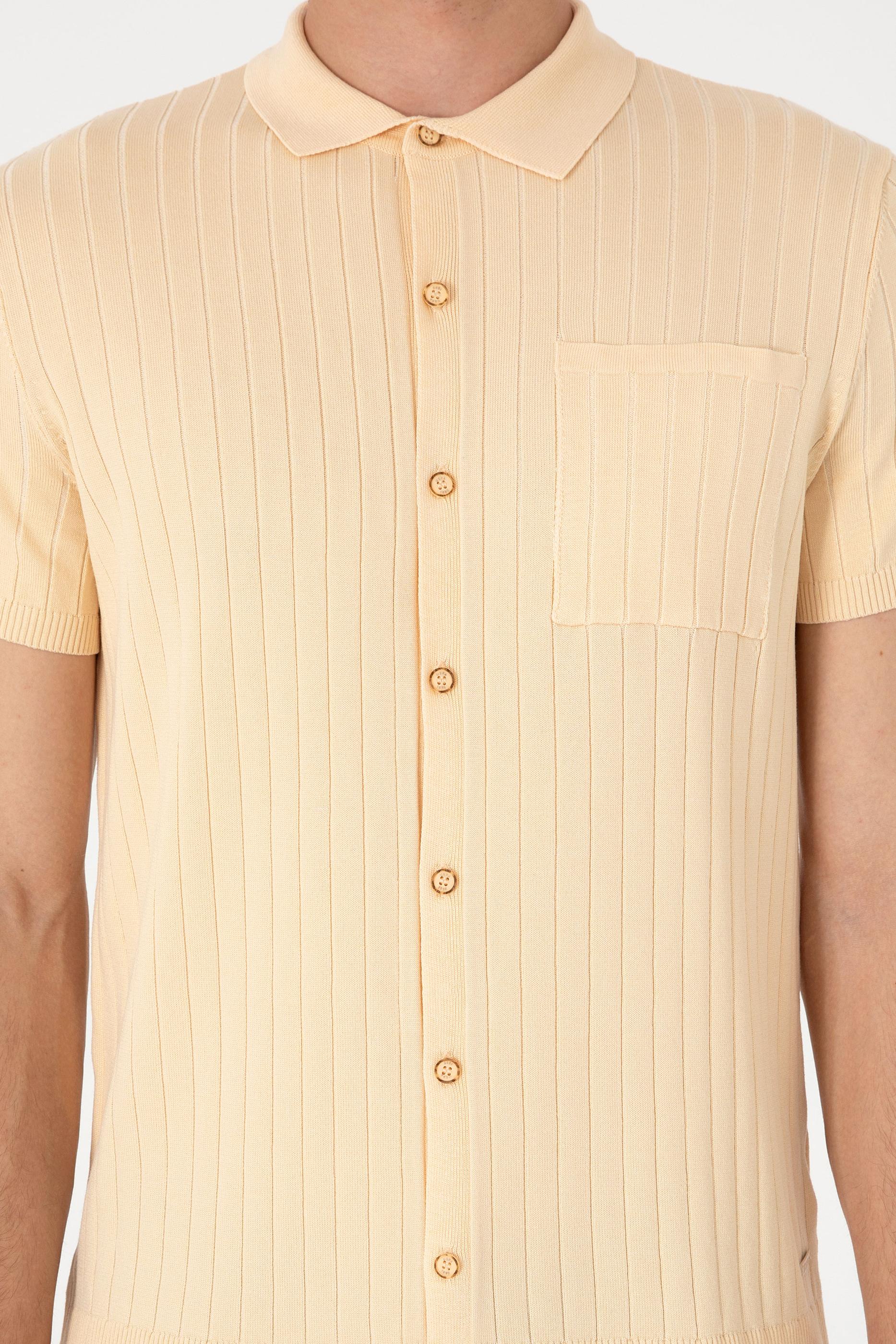 Erkek Slim Fit Bej Düğmeli Triko Tişört