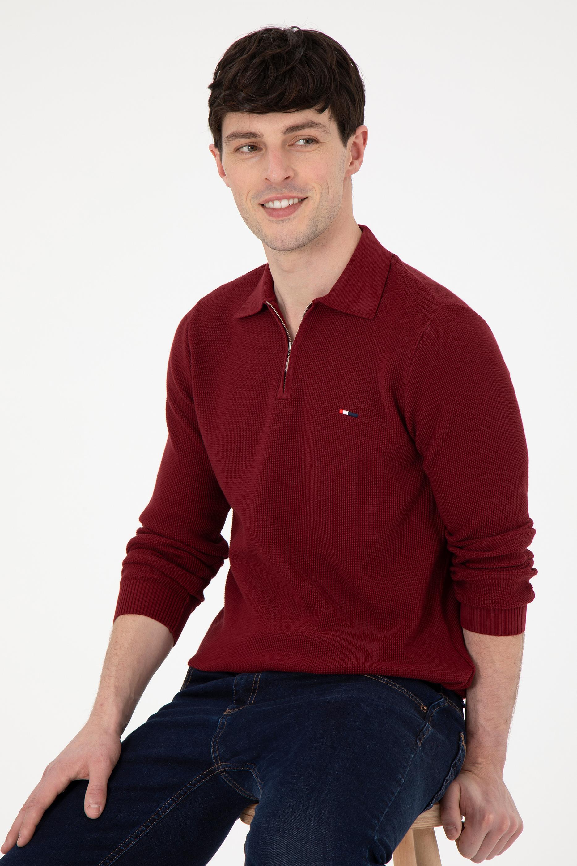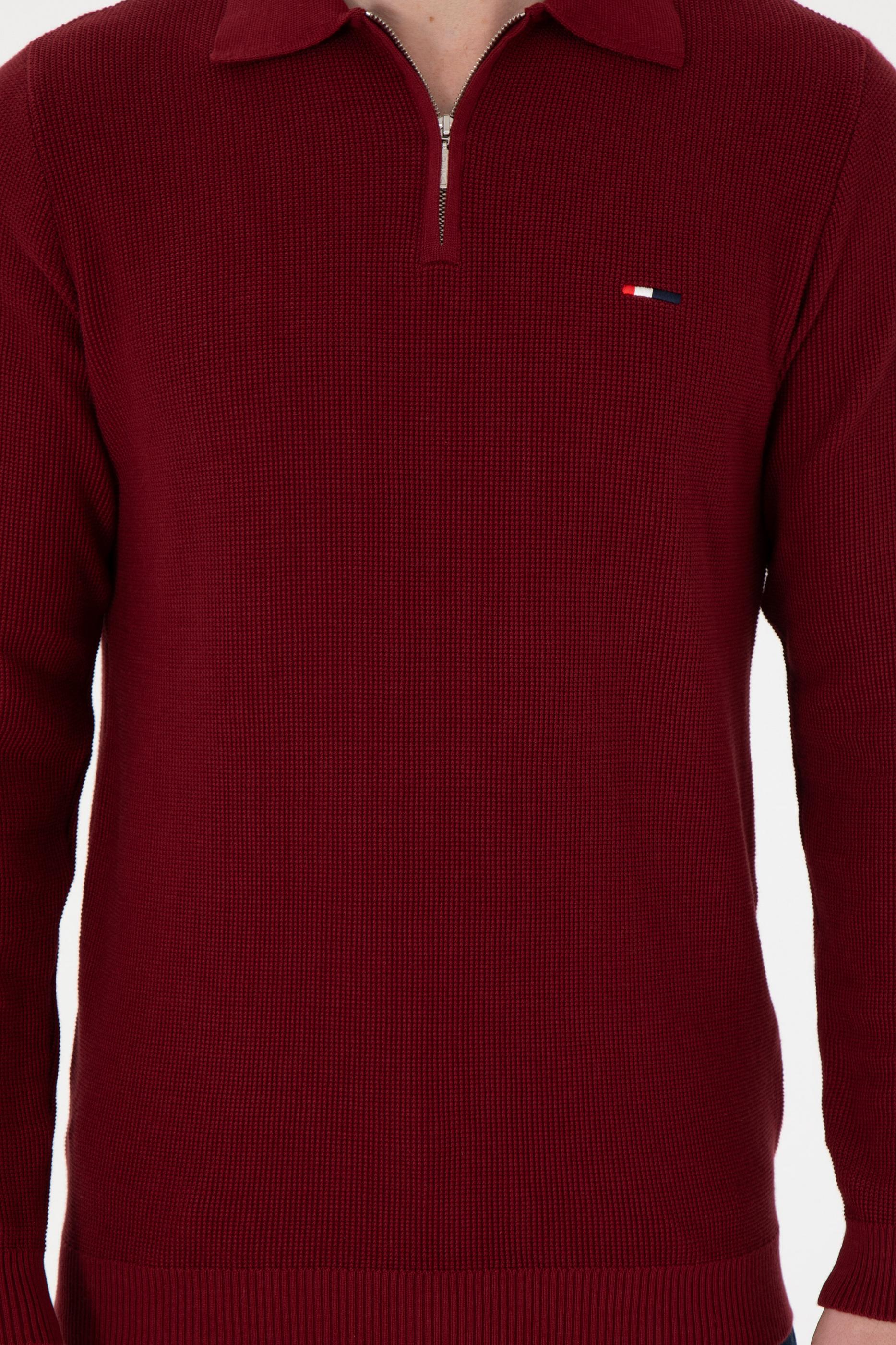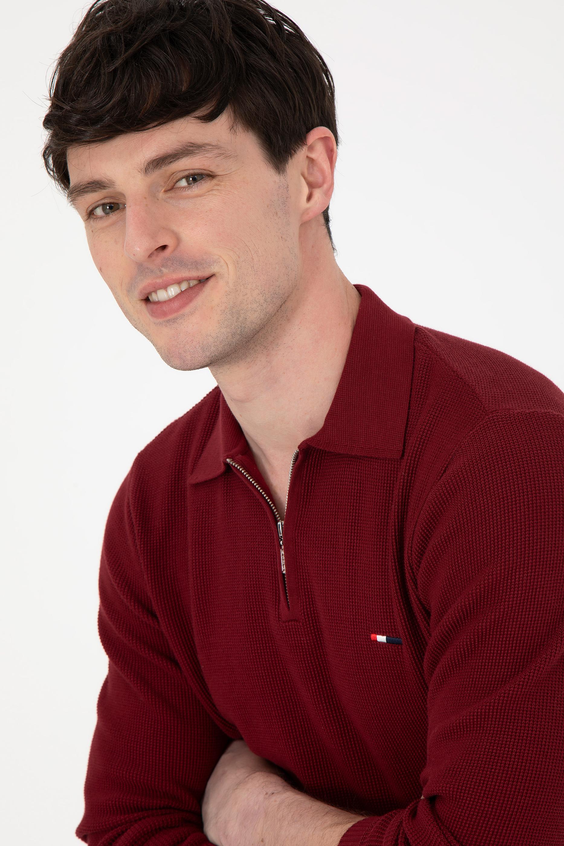 Erkek Regular Fit Yarım Fermuarlı Bordo Basic Kazak