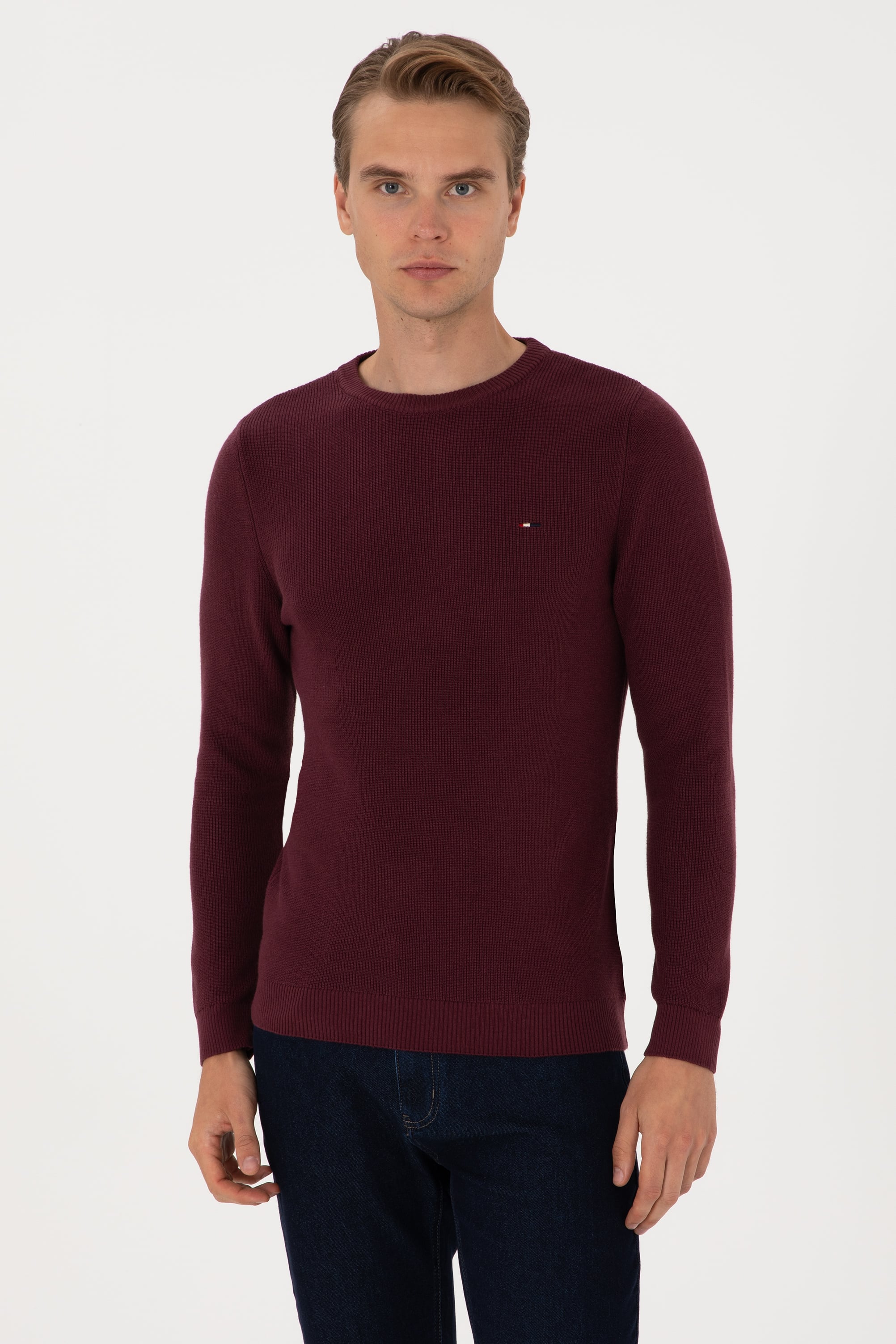 Erkek Slim Fit Bisiklet Yaka Bordo Basic Kazak