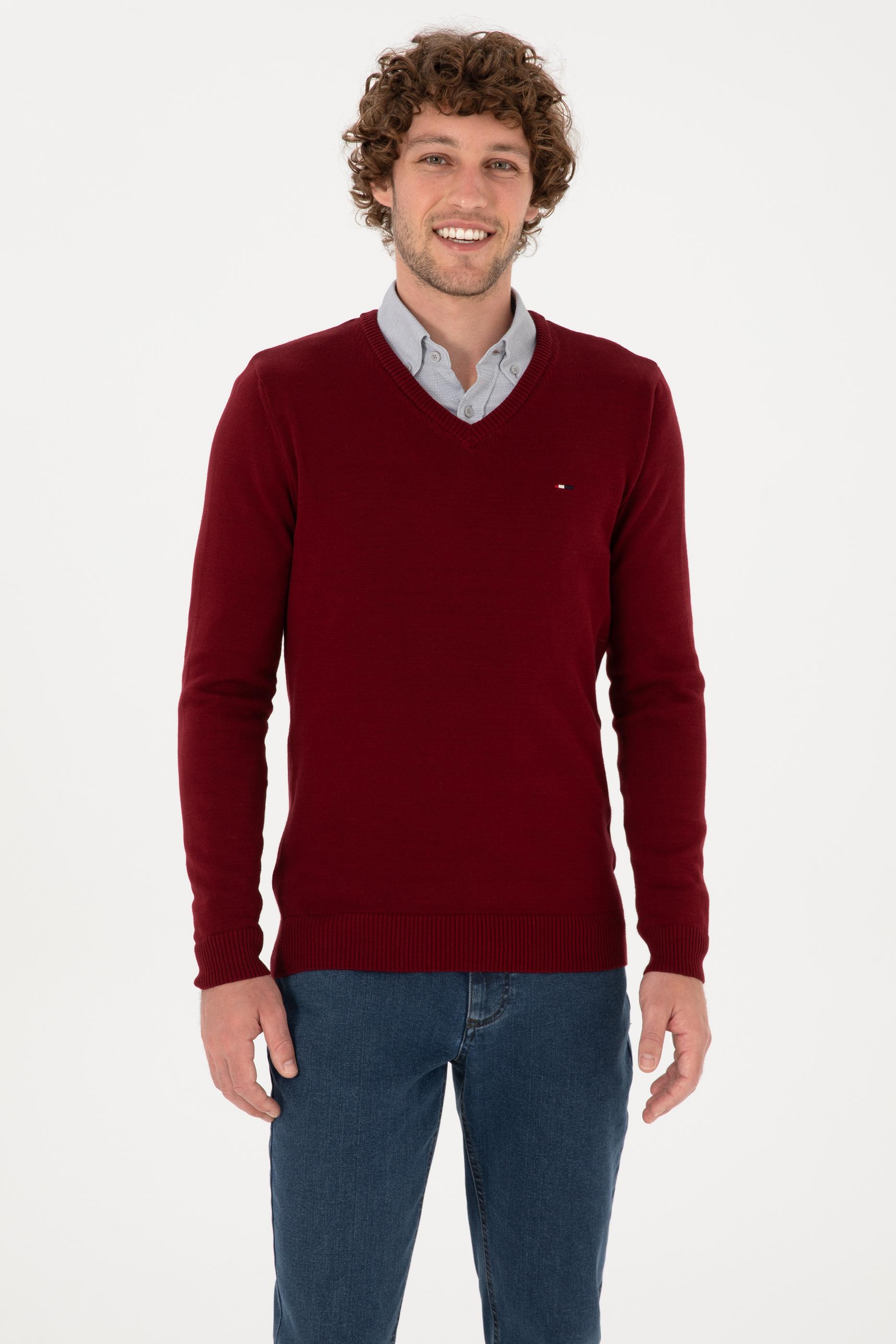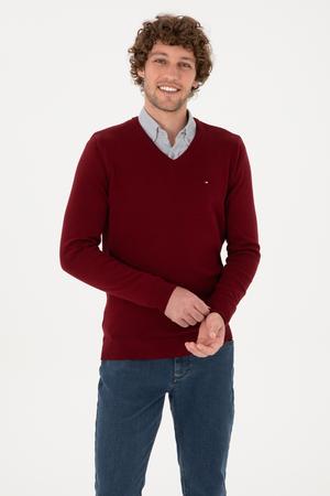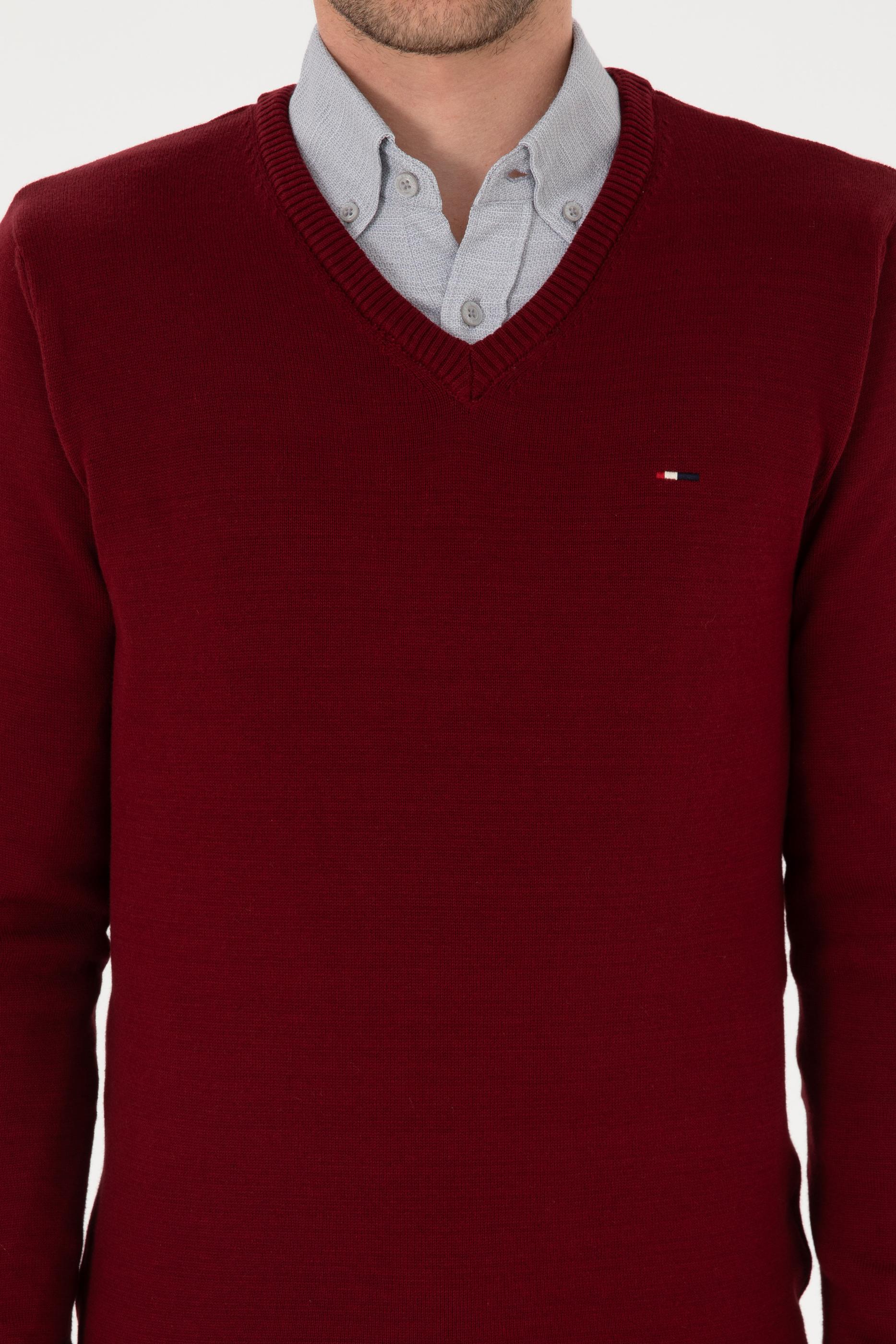 - Erkek Slim Fit V Yaka Bordo Basic Kazak