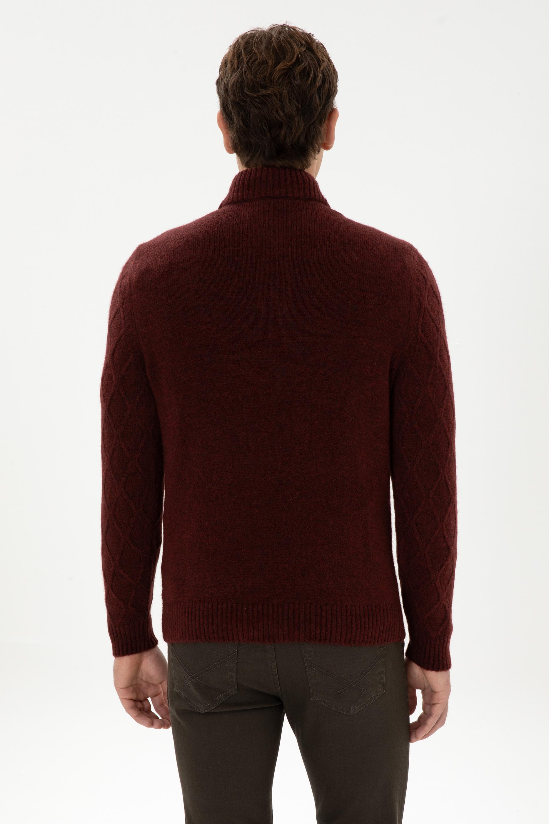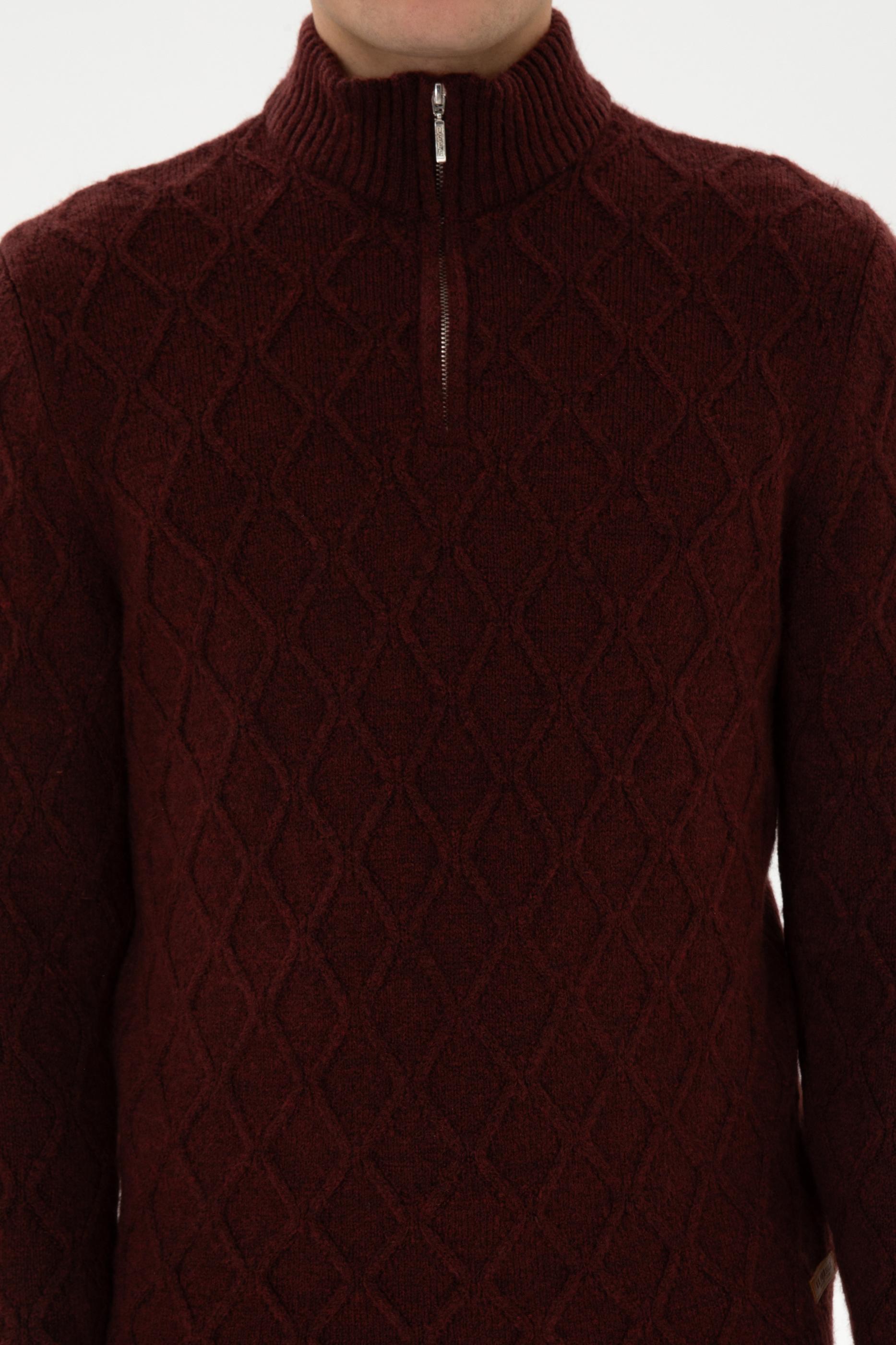 - Erkek Regular Fit Yarım Fermuarlı Desenli Bordo Kazak