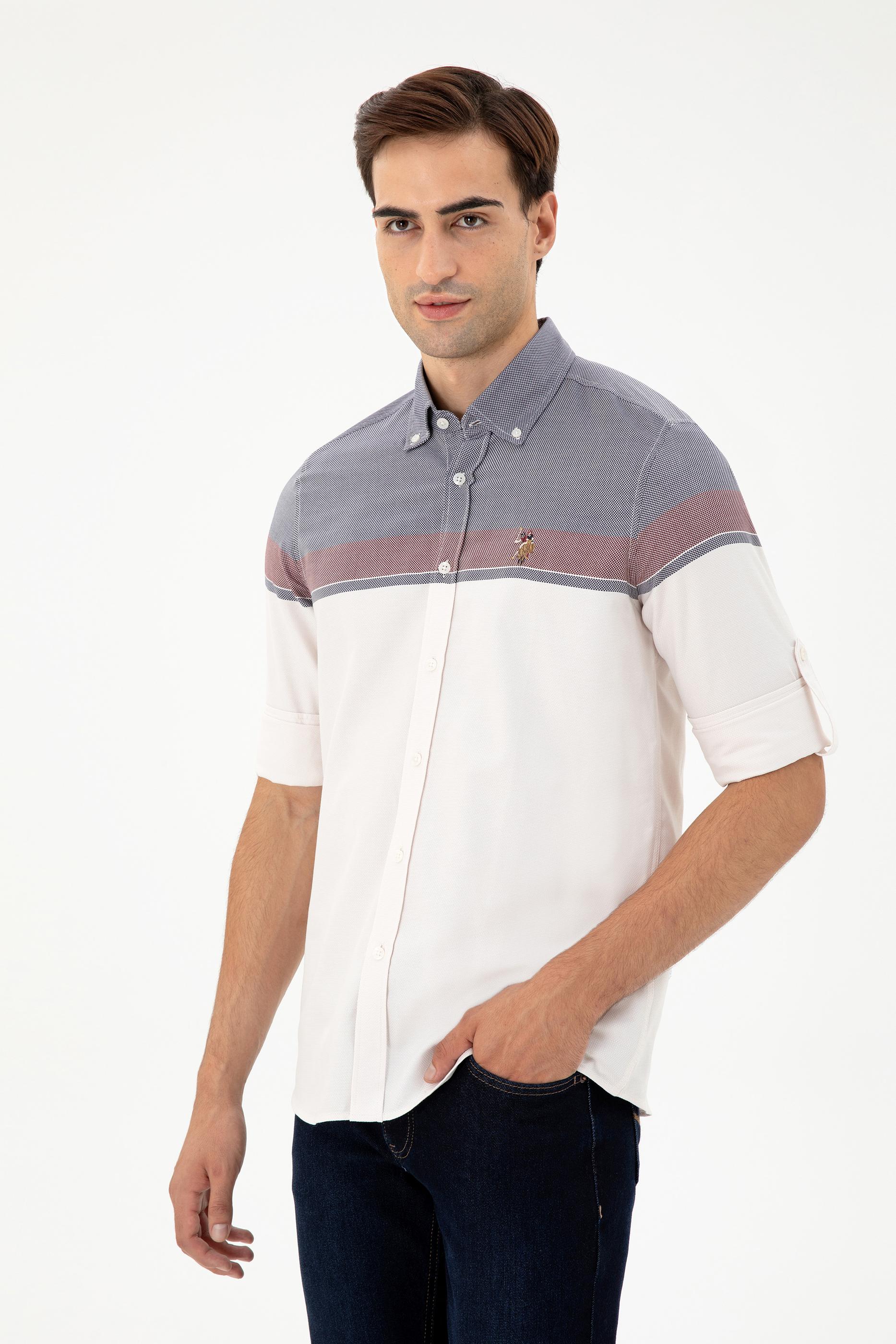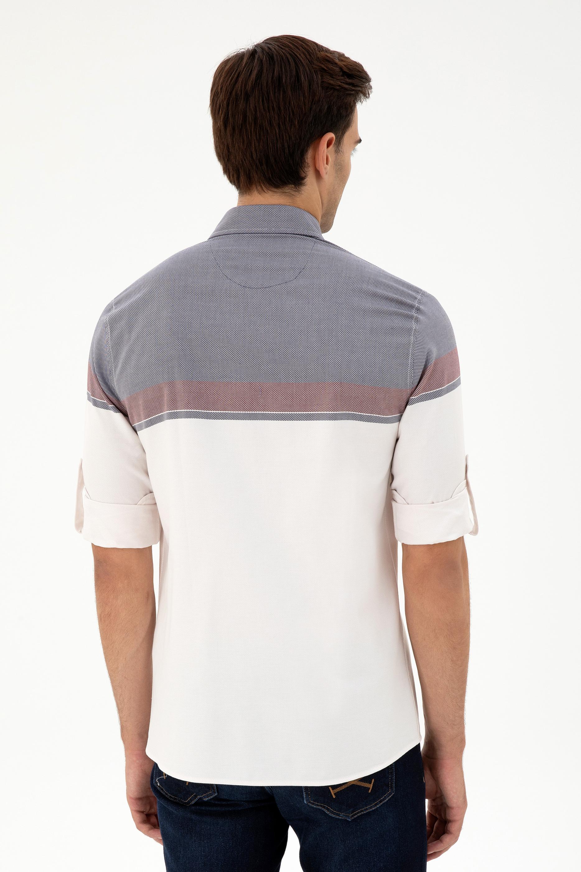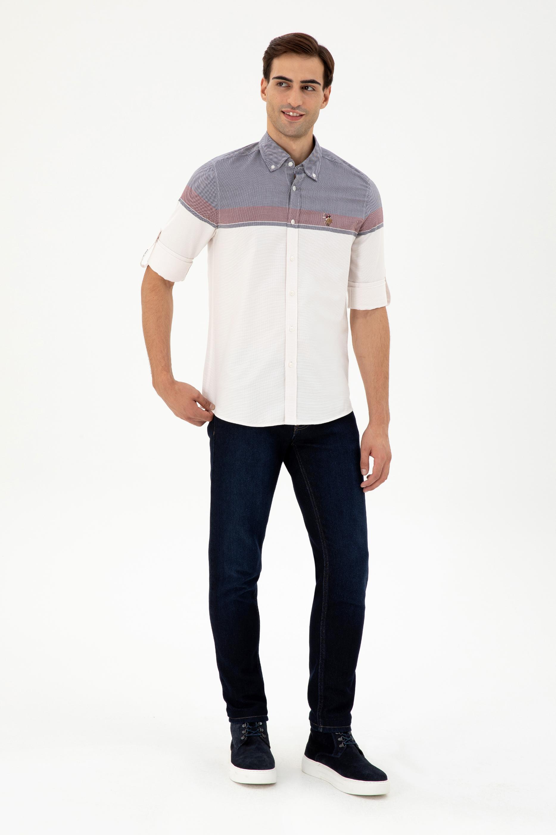 Bej ve krem tonları üzerine yerleştirilen pano şeritli detaylar gömleğe dinamik bir hava katarken, bordo panolu raporlu dokusu da farkını ortaya koyar. Gömleğin üst kısmında yer alan kontrast koyu tonlar, modern çizgilerle birleşerek özgün bir stil yaratır. Düğmeli yaka detayı ise klasik bir dokunuş ile spor şıklığı bir araya getirir.
