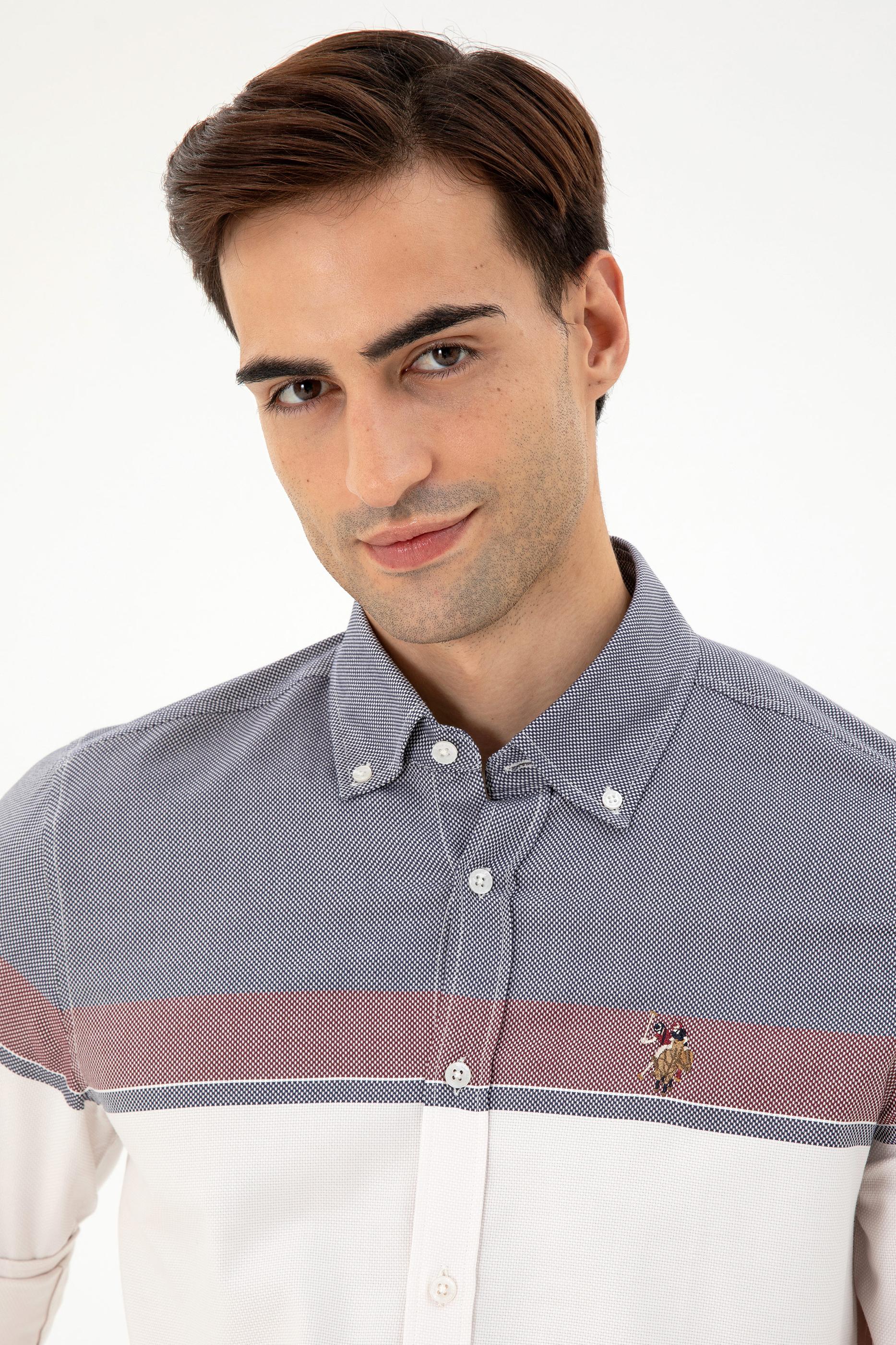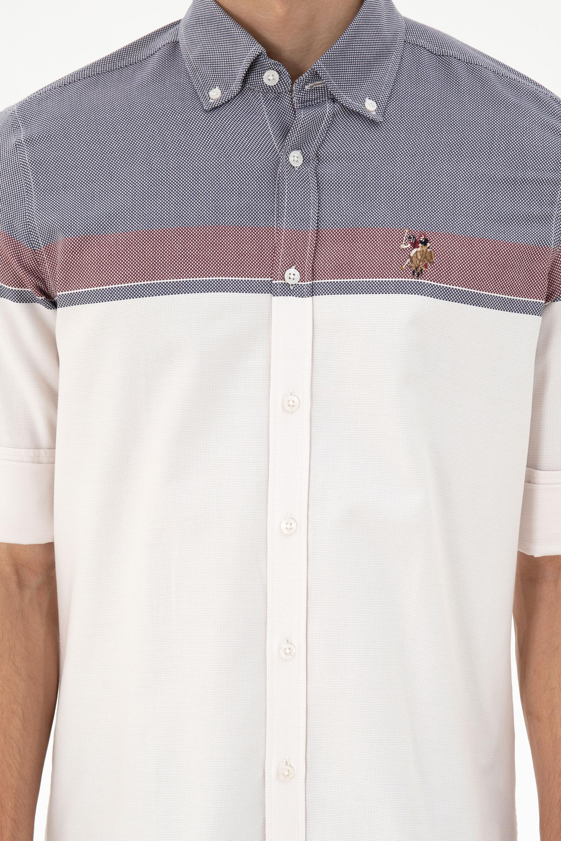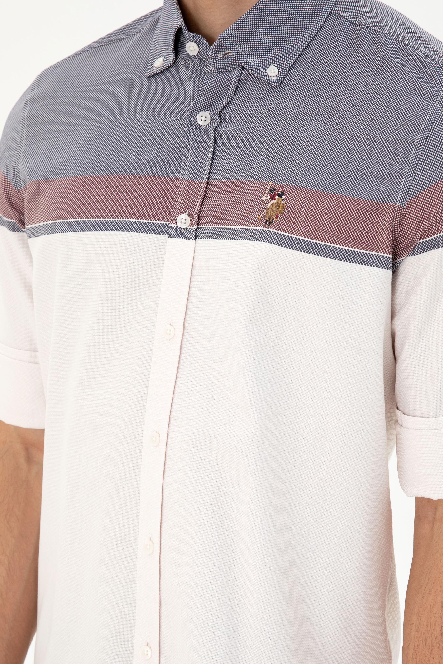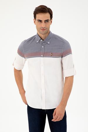 Bej ve krem tonları üzerine yerleştirilen pano şeritli detaylar gömleğe dinamik bir hava katarken, bordo panolu raporlu dokusu da farkını ortaya koyar. Gömleğin üst kısmında yer alan kontrast koyu tonlar, modern çizgilerle birleşerek özgün bir stil yaratır. Düğmeli yaka detayı ise klasik bir dokunuş ile spor şıklığı bir araya getirir.