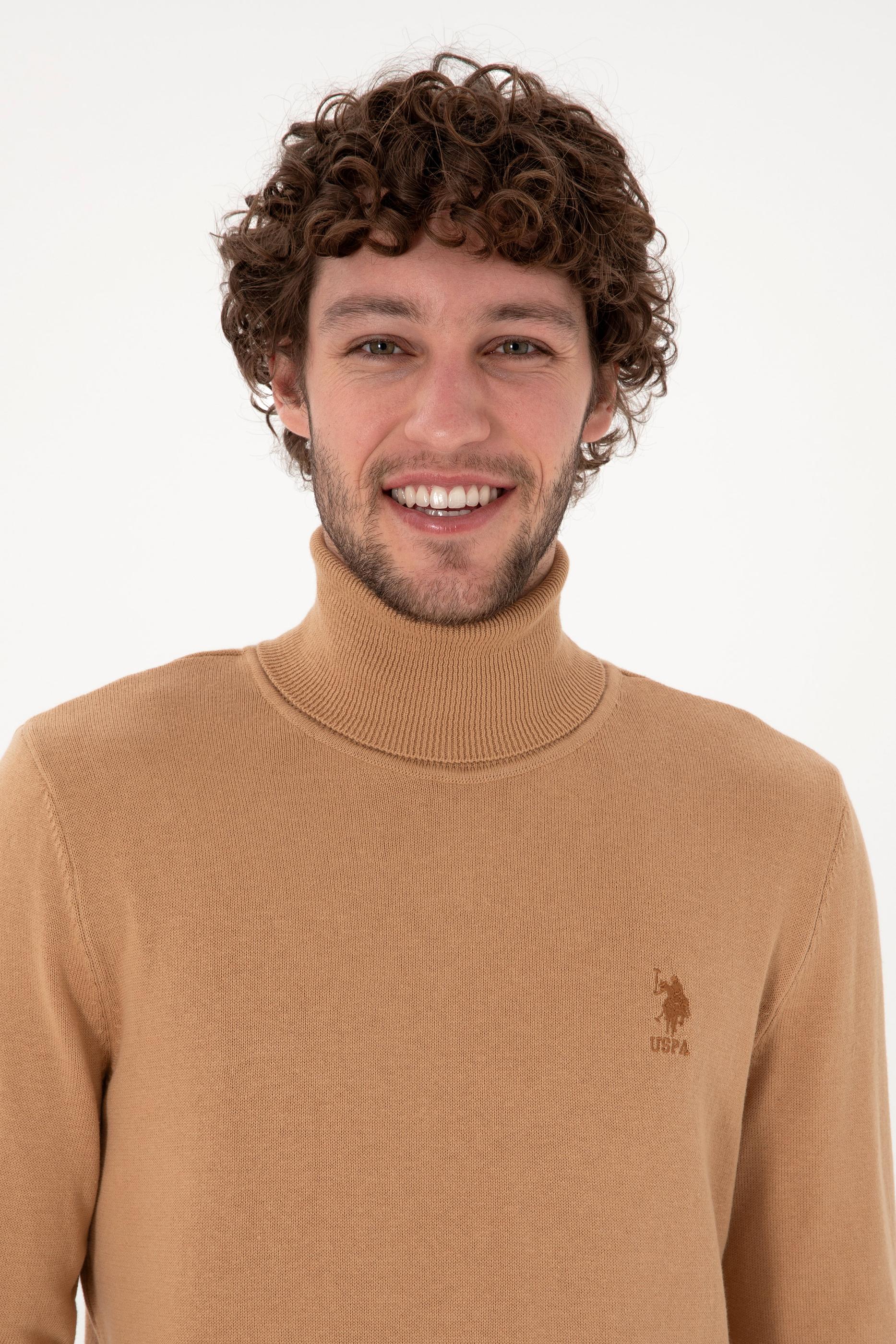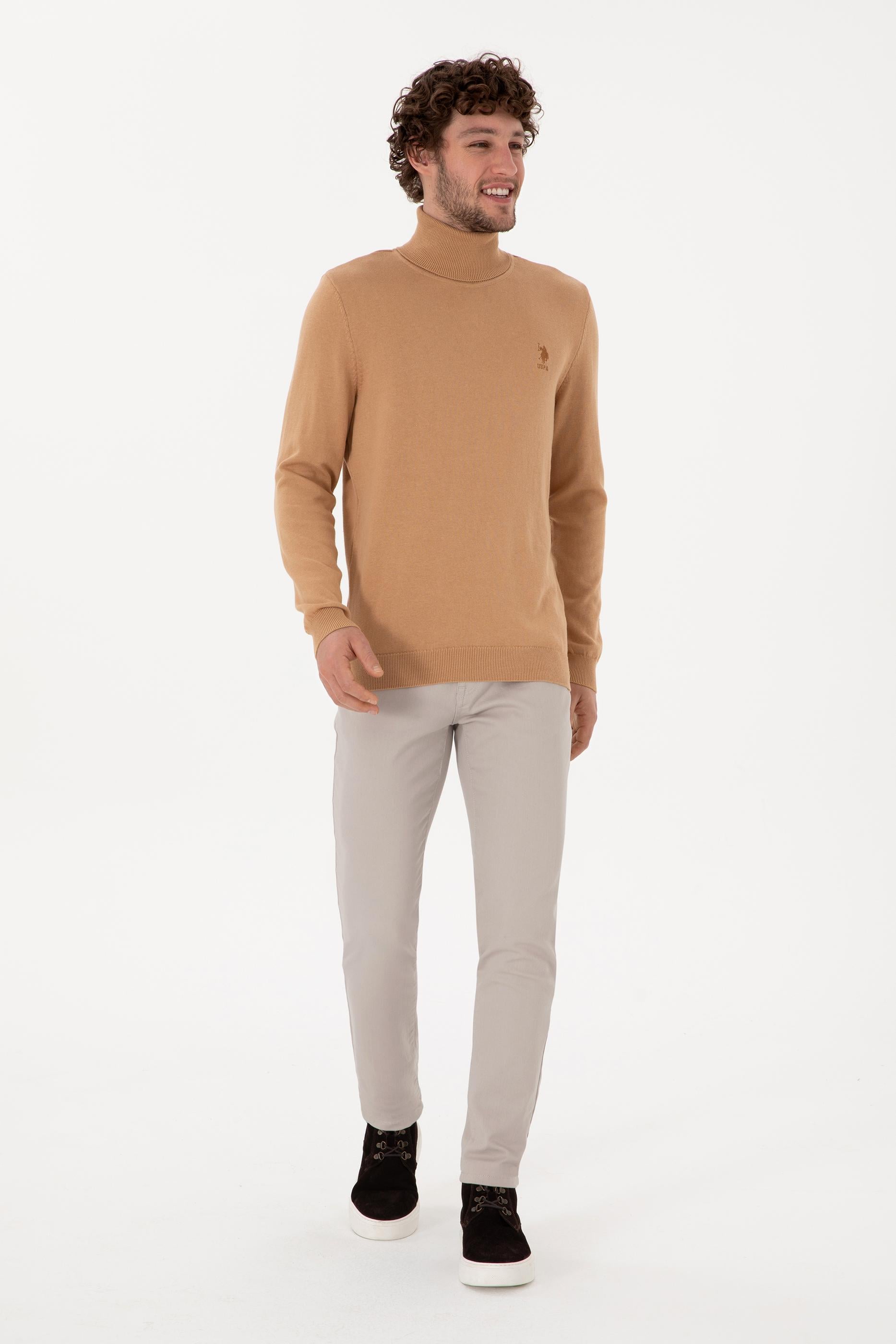 - Erkek Slim Fit Balıkçı Yaka Camel Melanj Basic Kazak