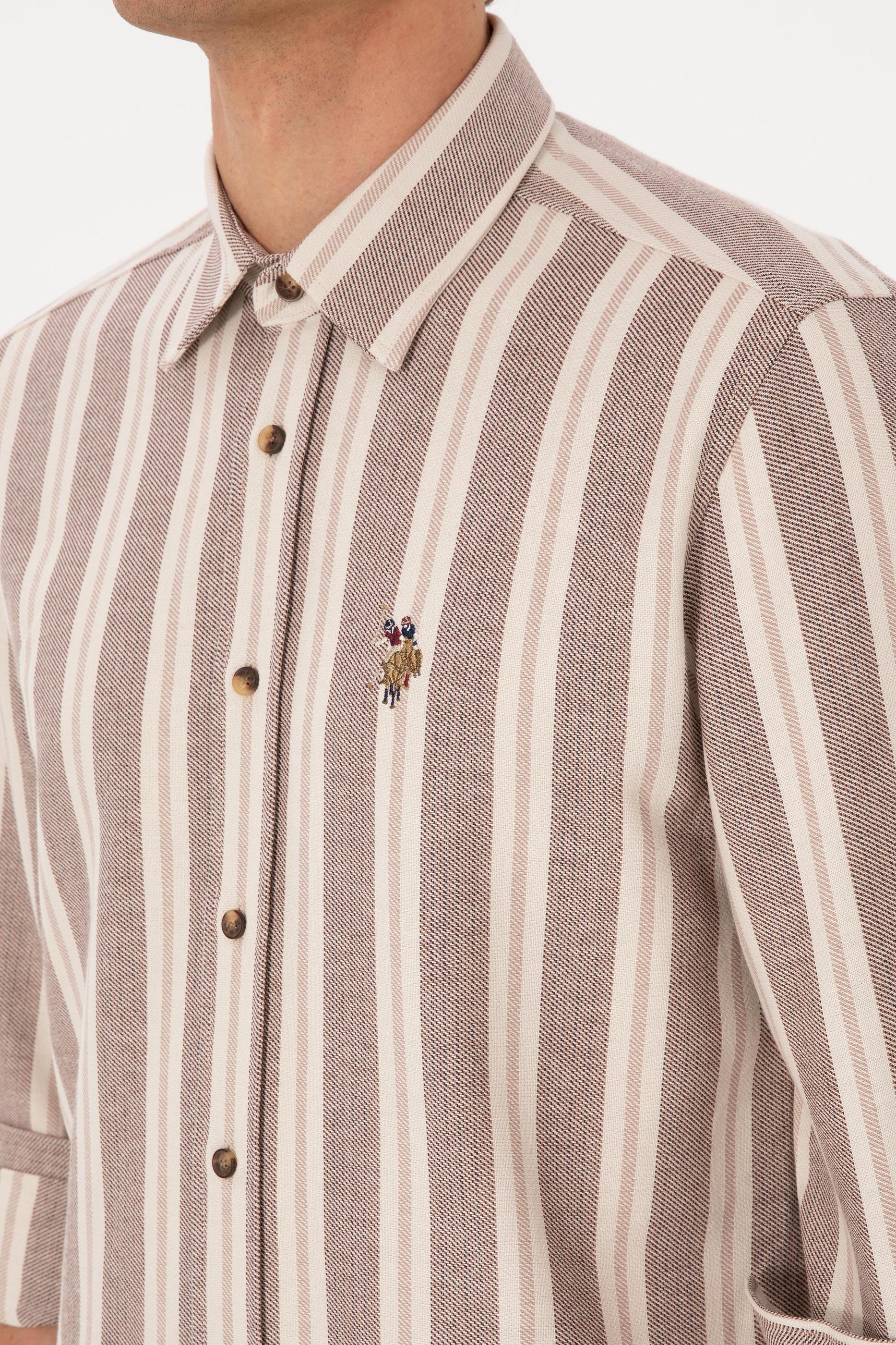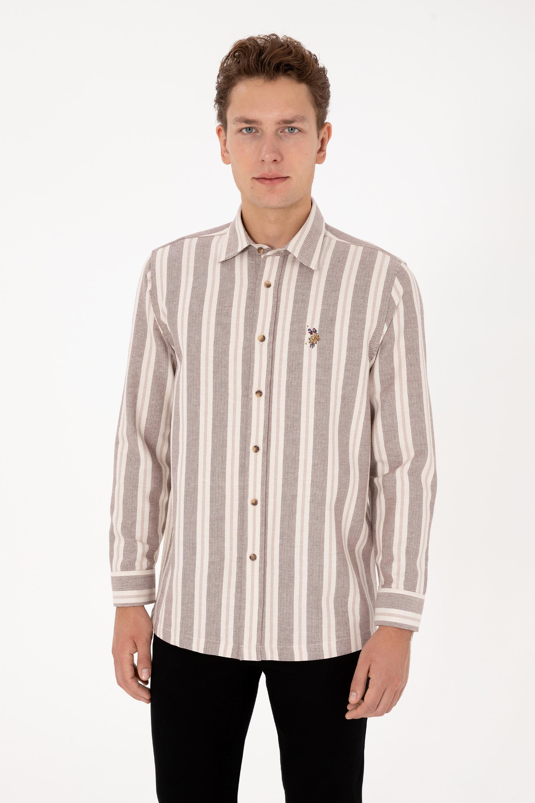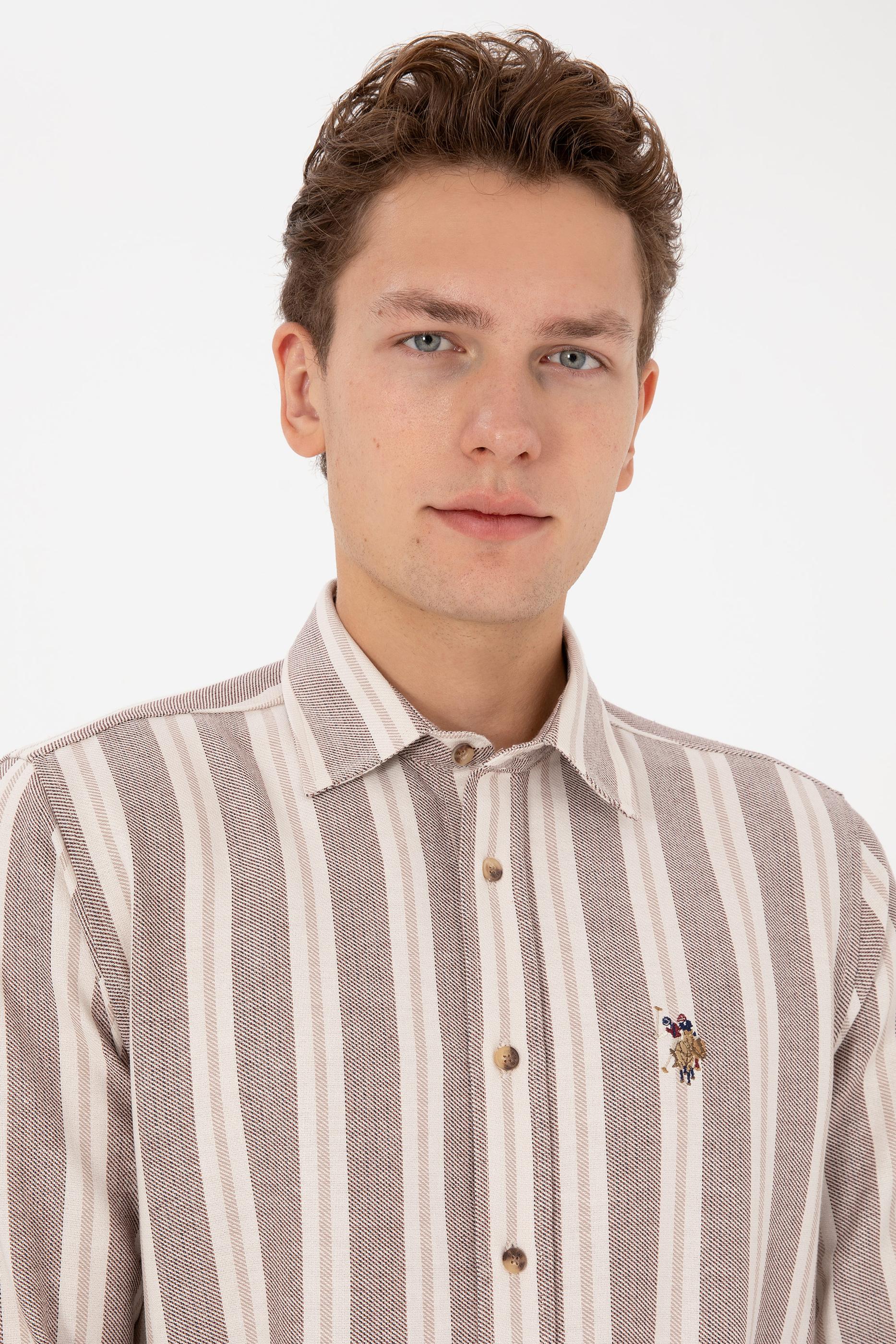 Erkek Krem Çizgili Uzun Kollu Kahverengi Gömlek