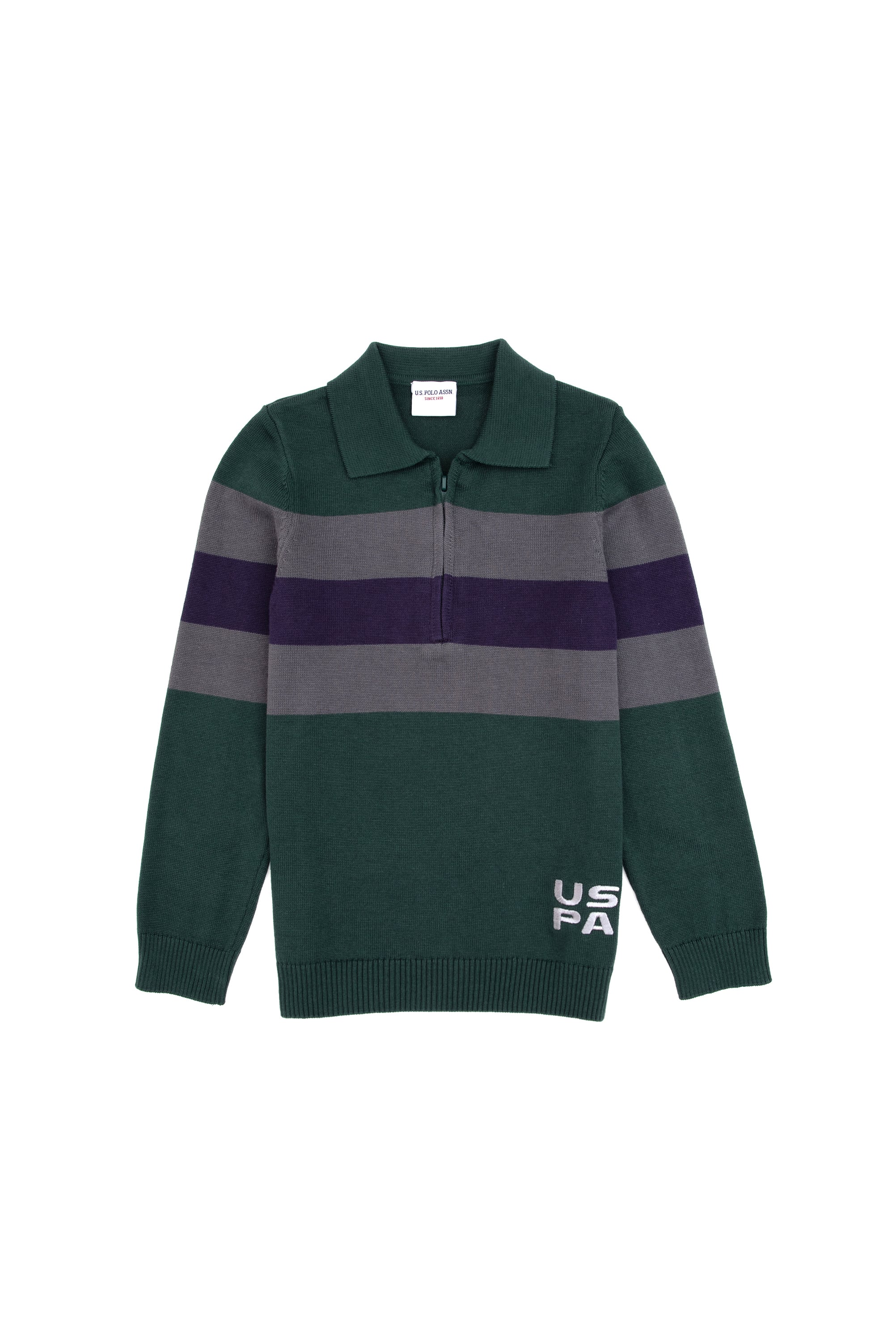 Erkek Çocuk Yeşil Polo Yaka Yarım Fermuarlı Kazak