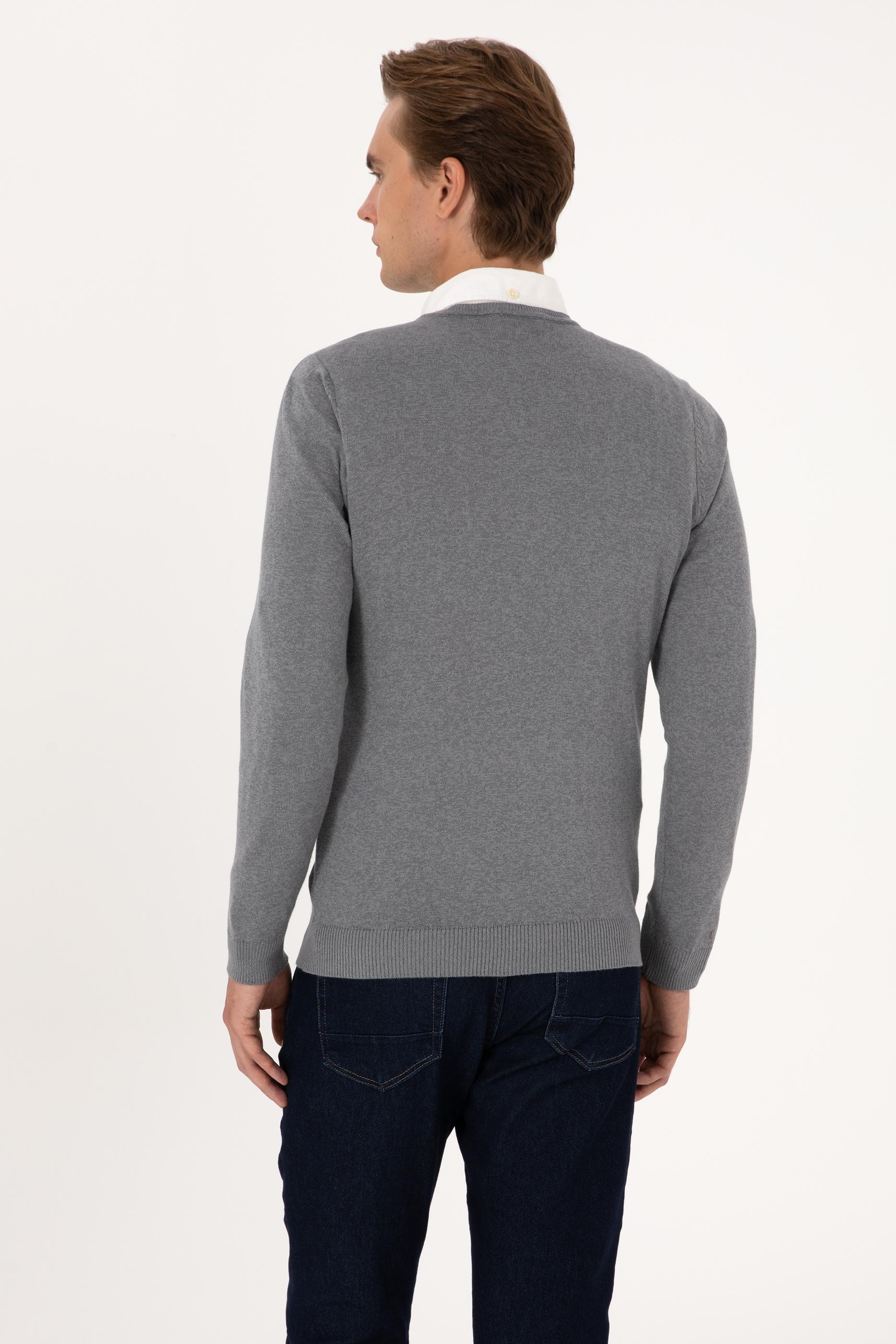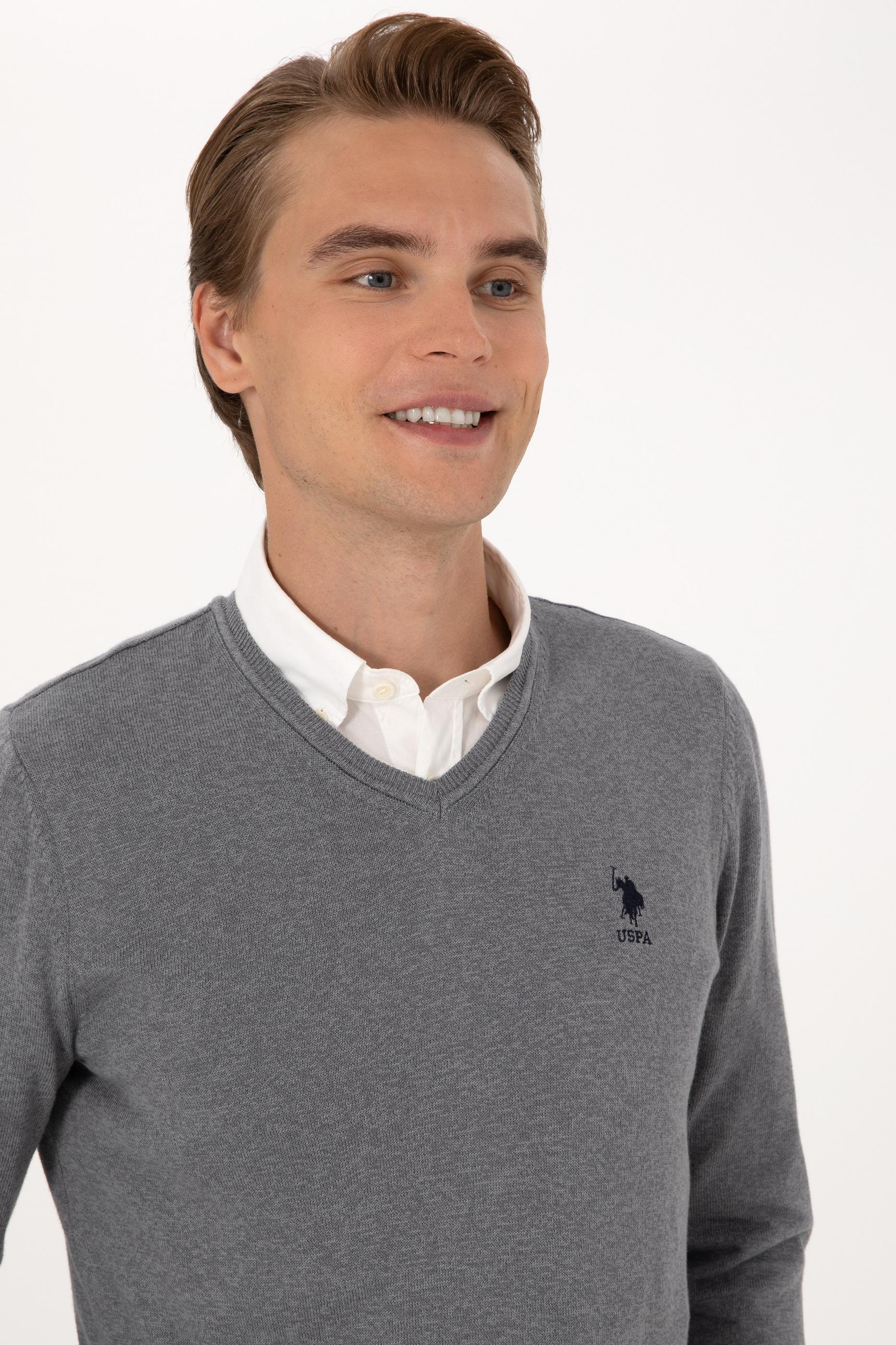 - Erkek Slim Fit V Yaka Gri Melanj Basic Kazak