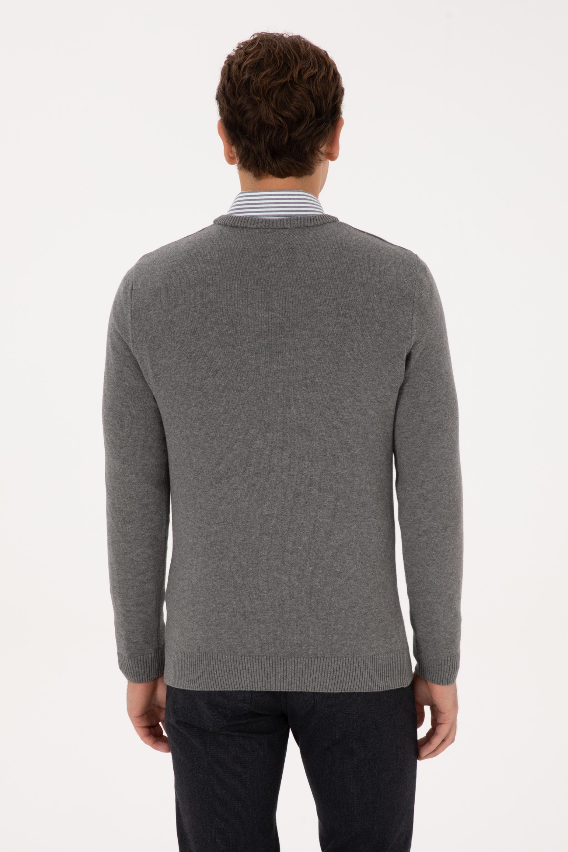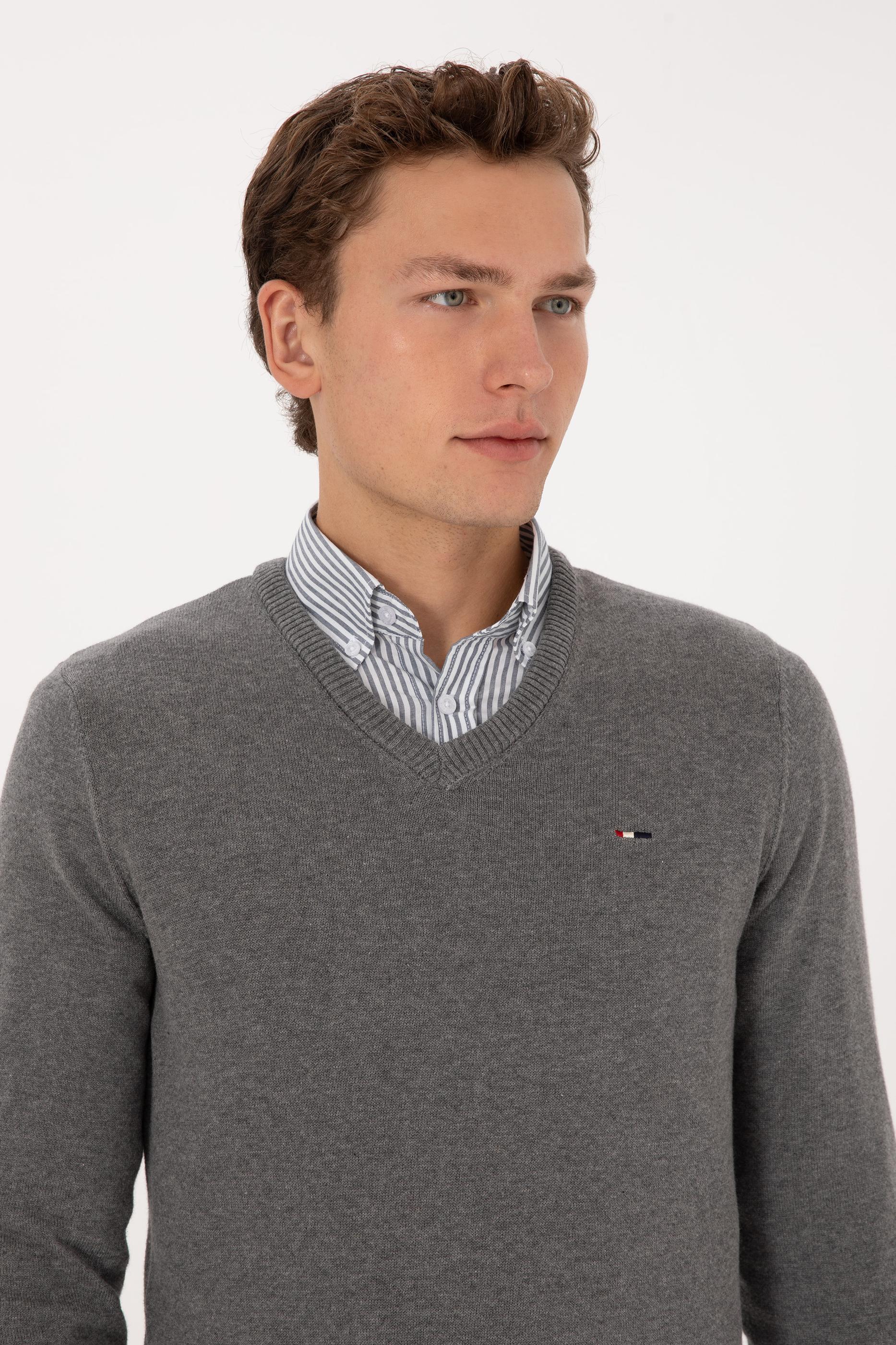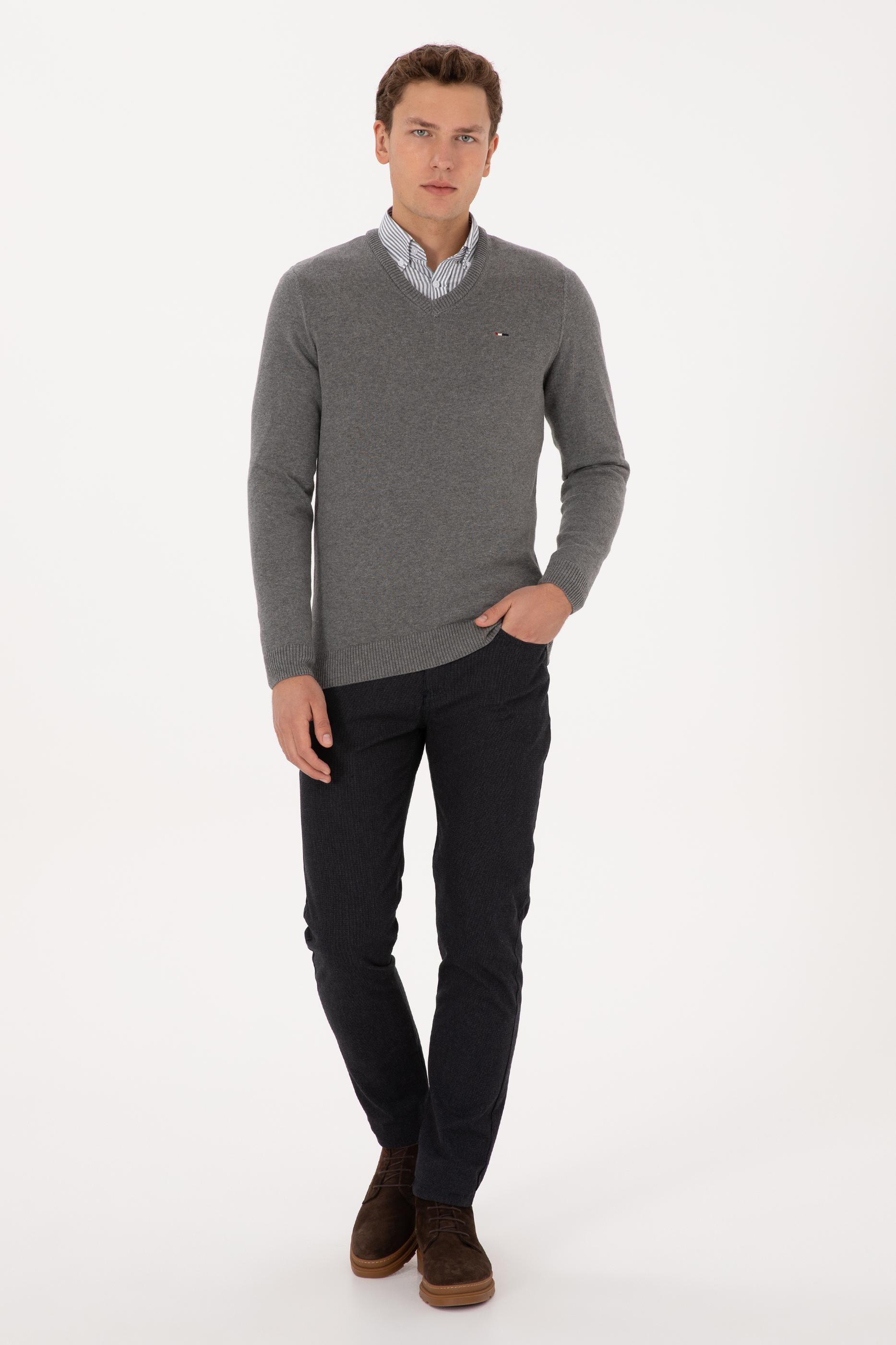 - Erkek Slim Fit V Yaka Gri Melanj Basic Kazak