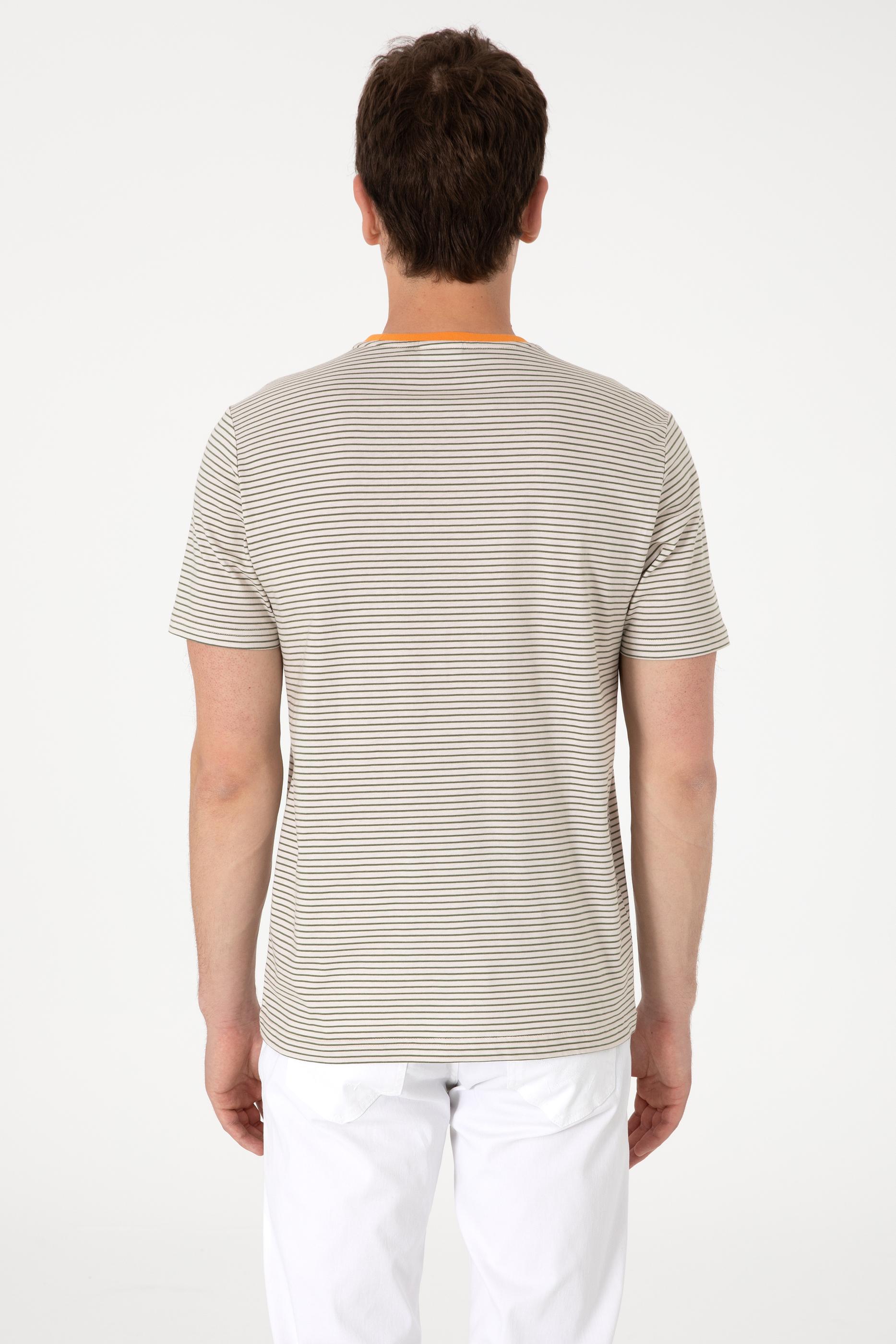 Erkek Regular Fit Bisiklet Yaka Haki Çizgili Tişört