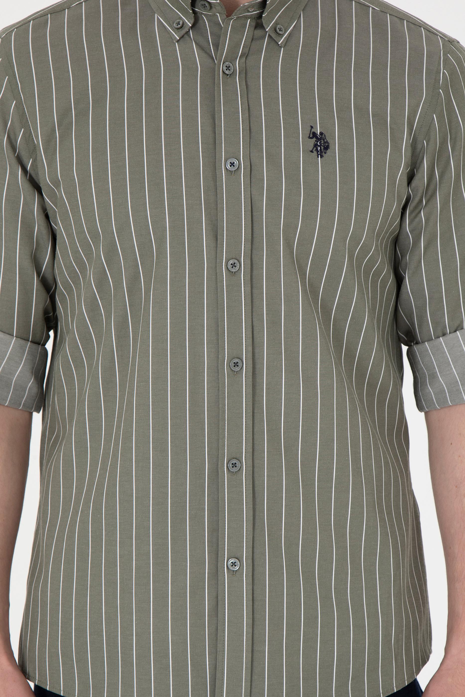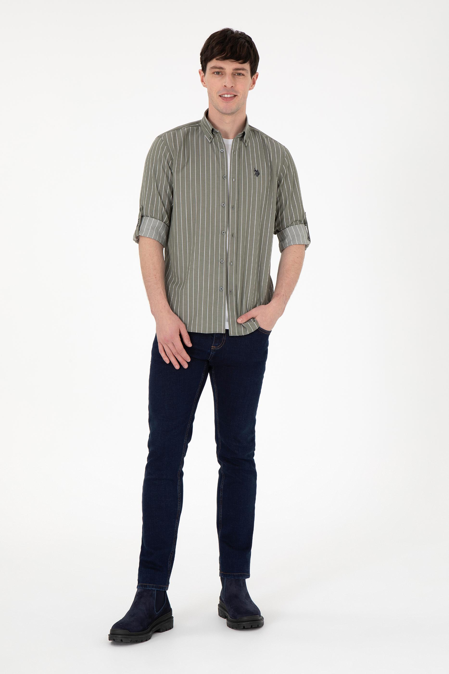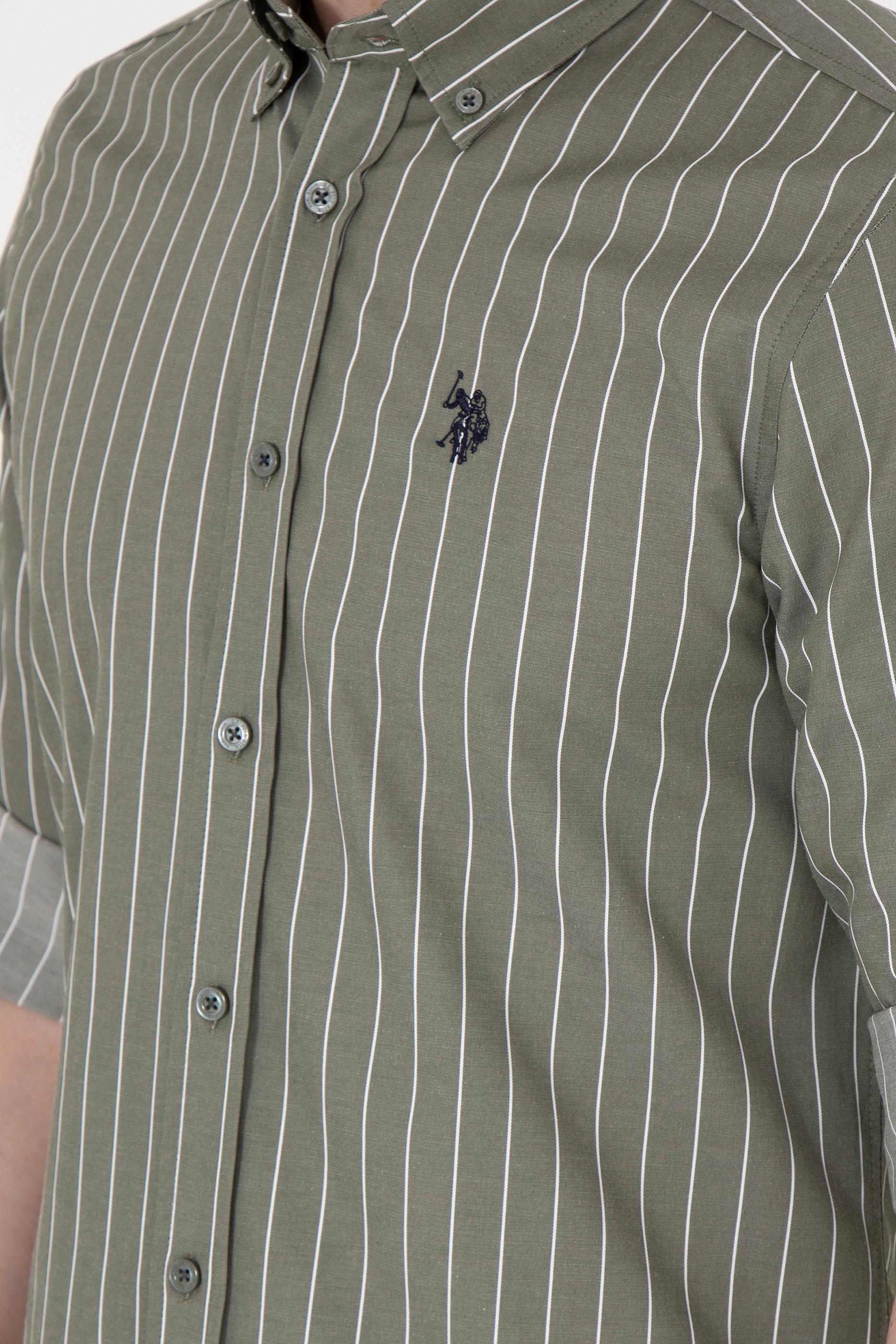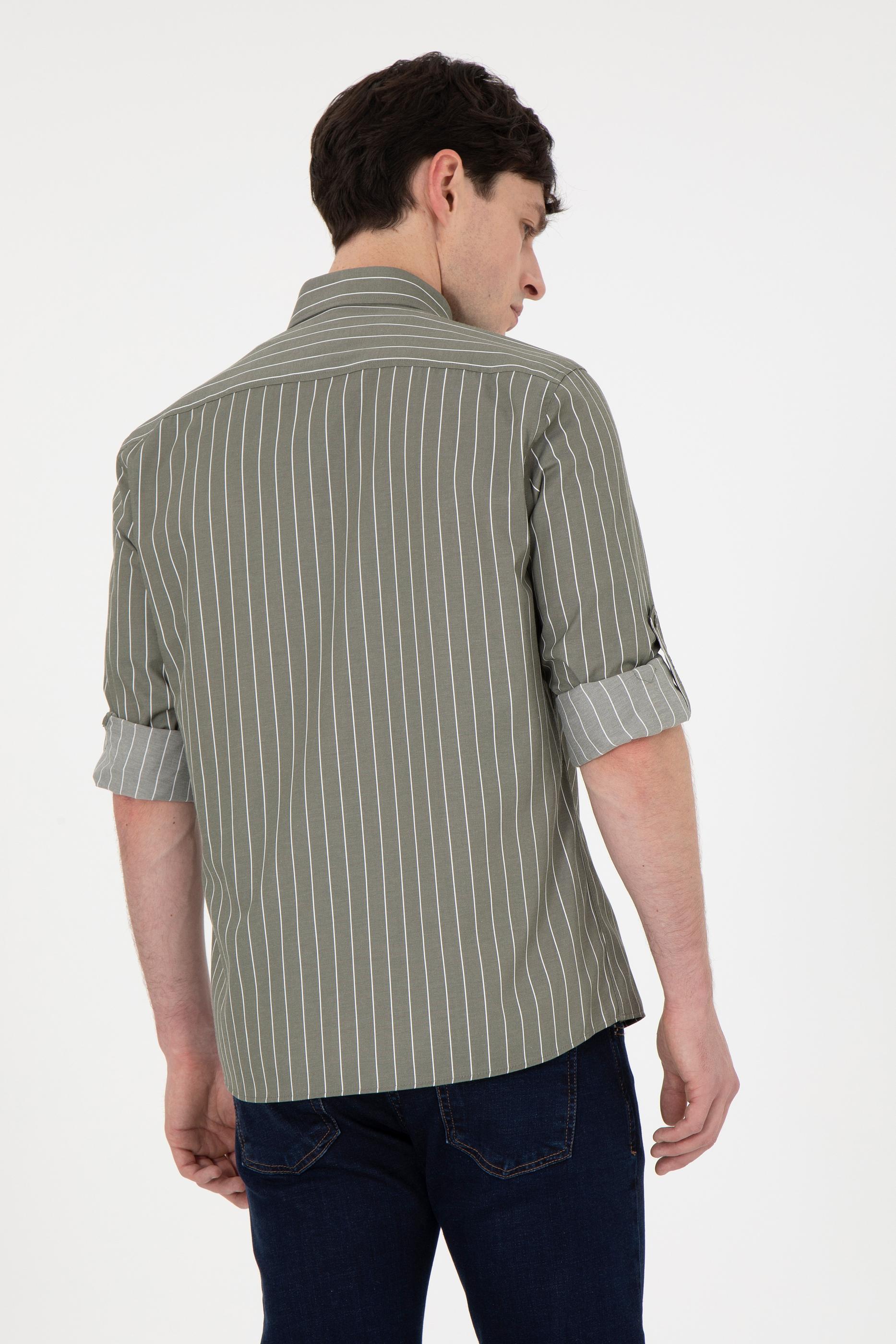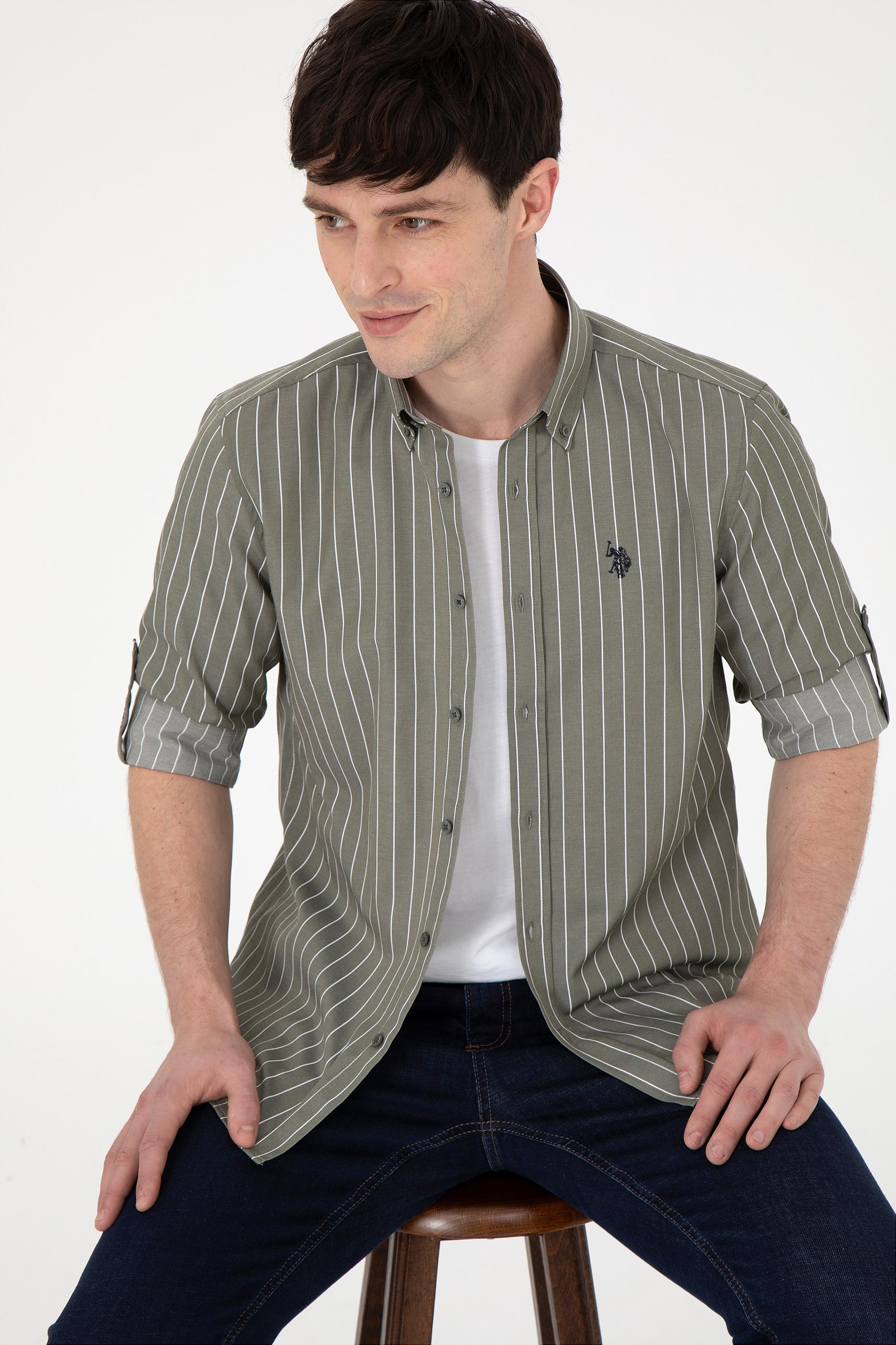Erkek Beyaz Çizgili Haki Gömlek