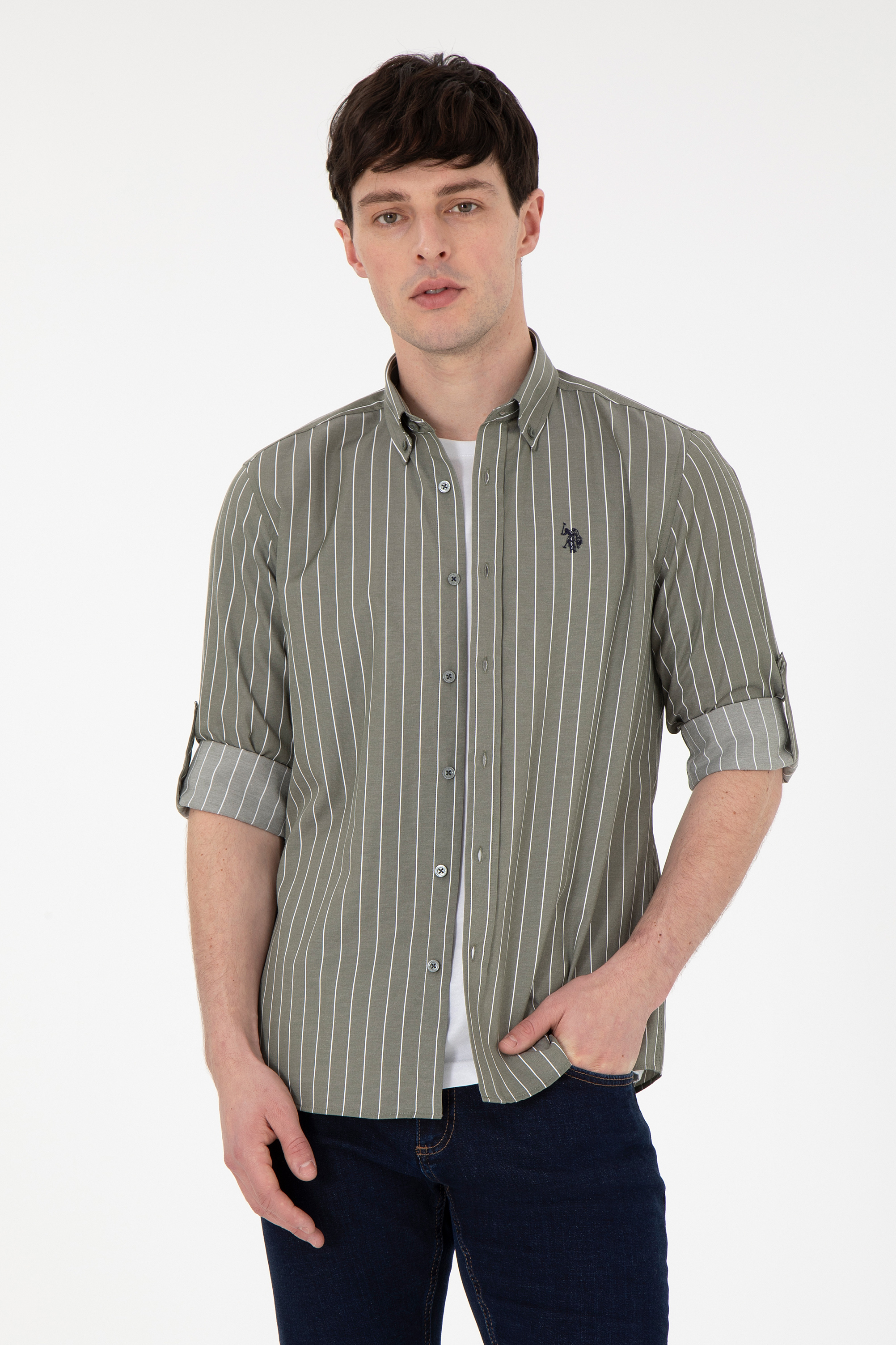 - Erkek Beyaz Çizgili Haki Gömlek