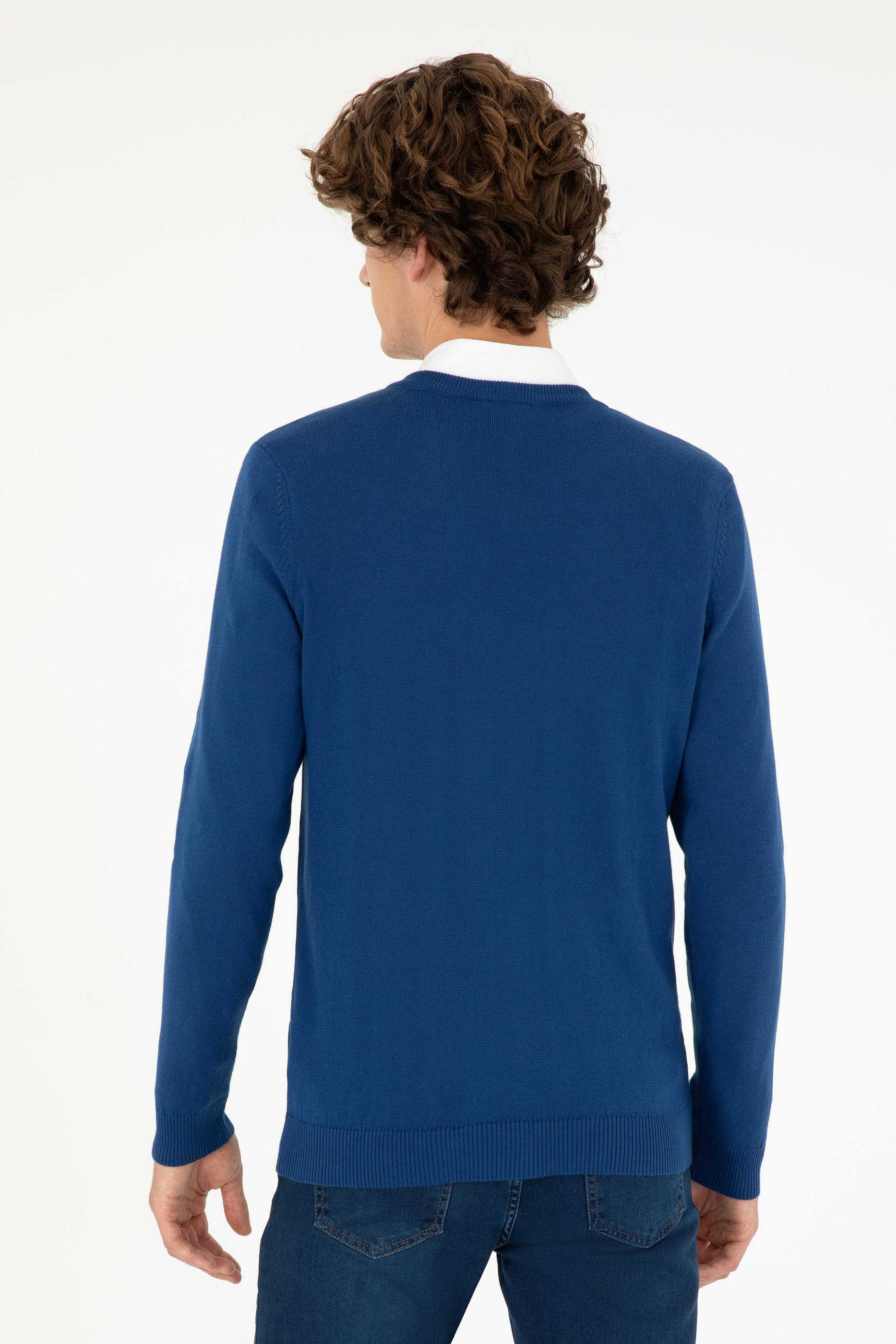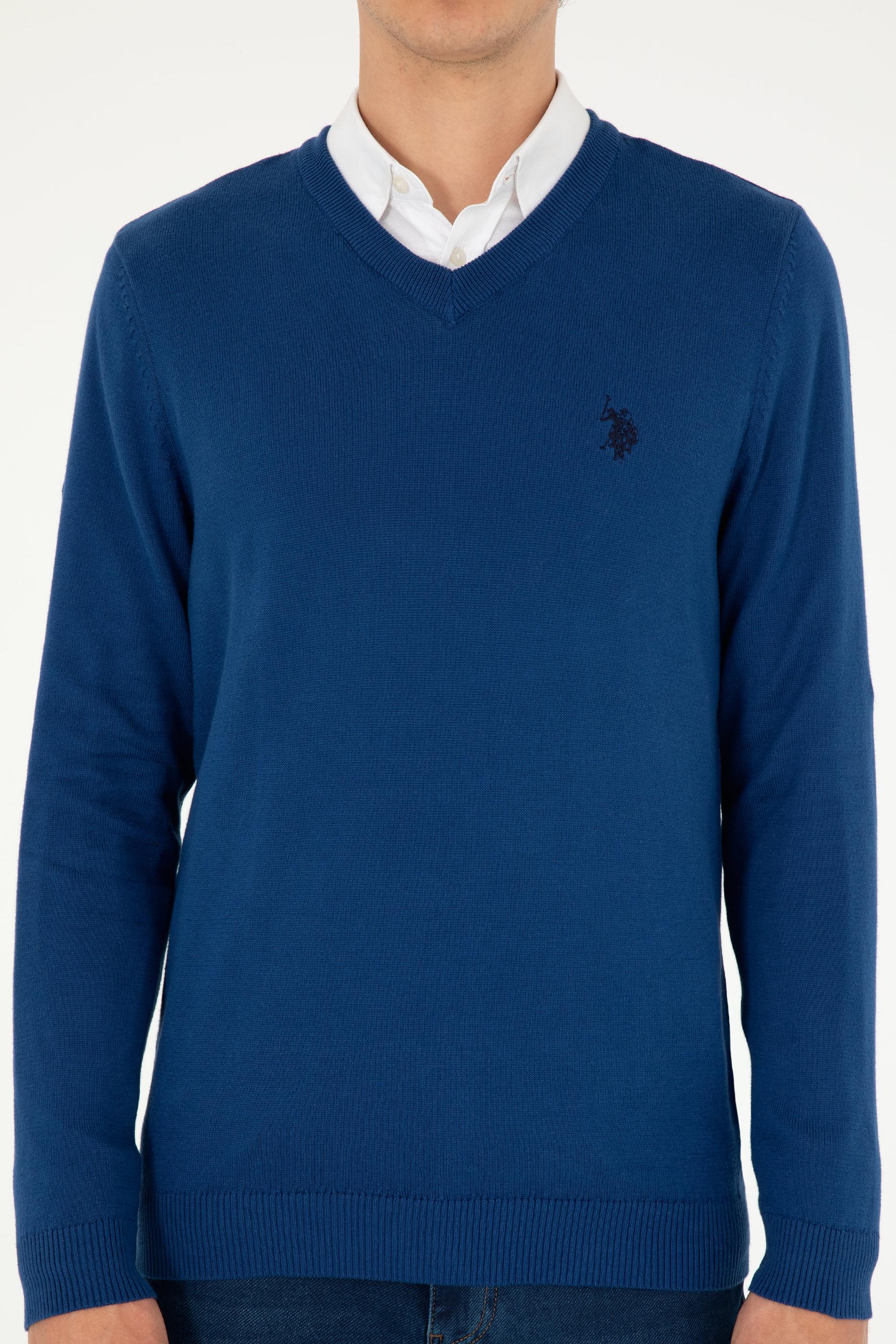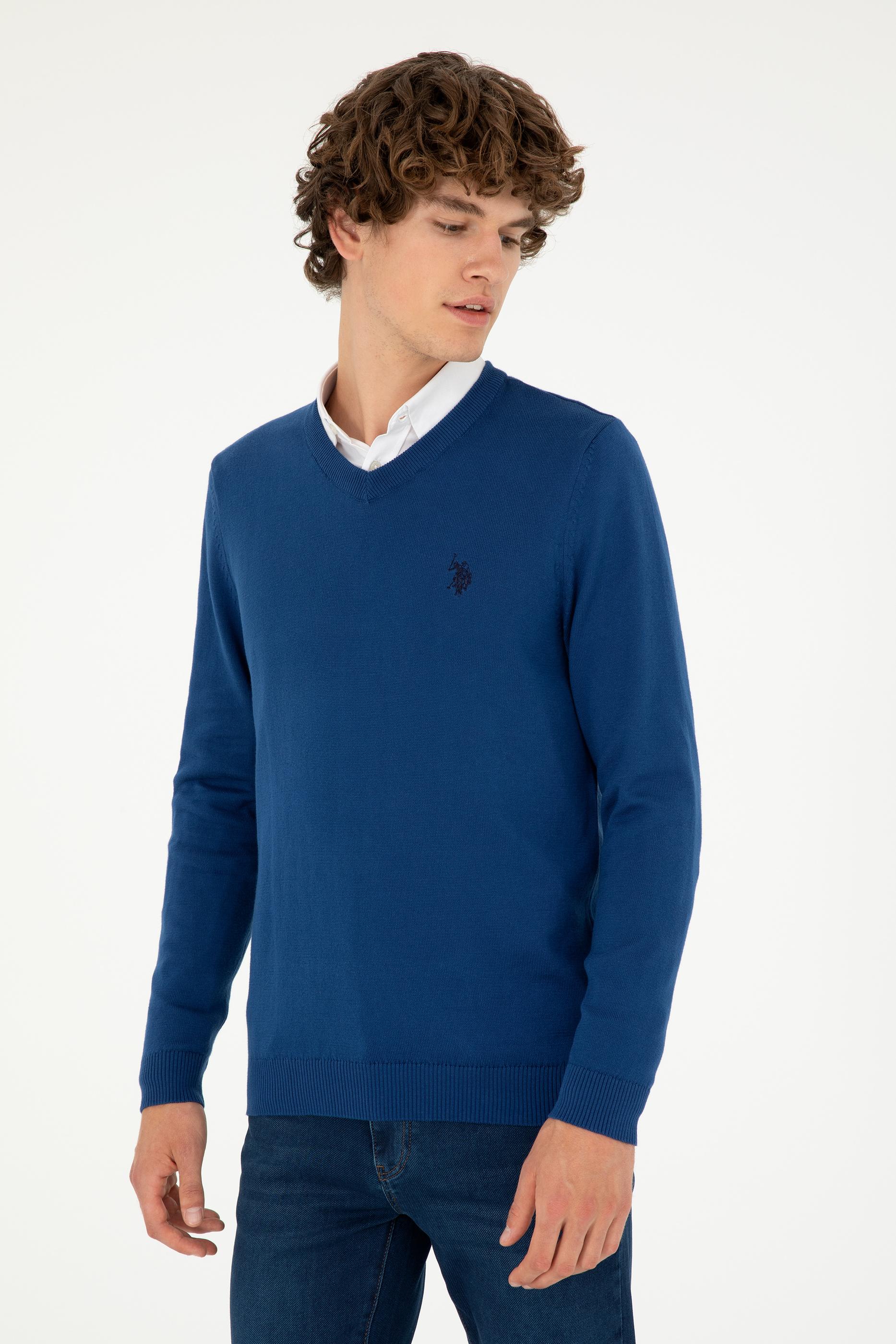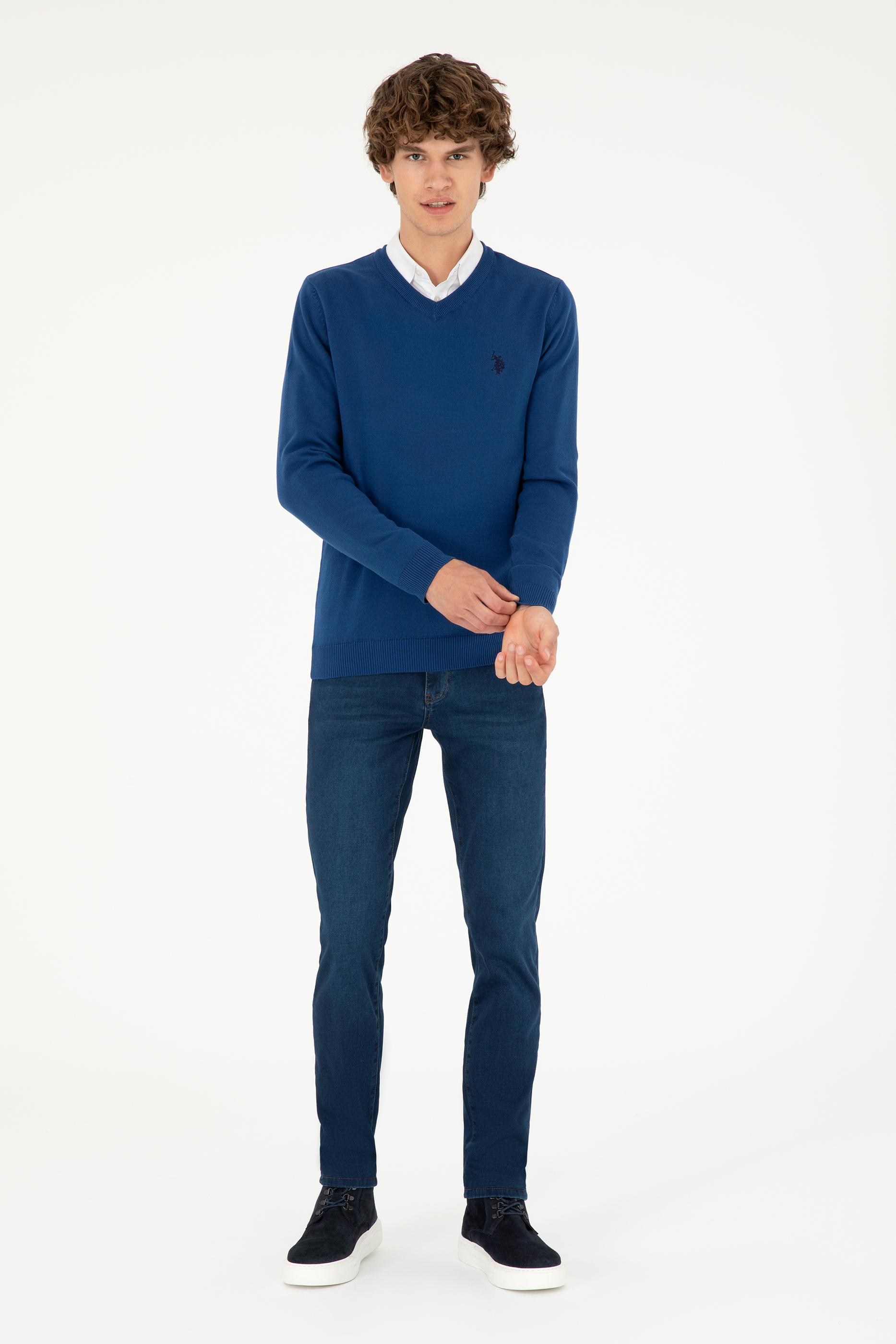 Erkek Slim Fit V Yaka İndigo Basic Kazak