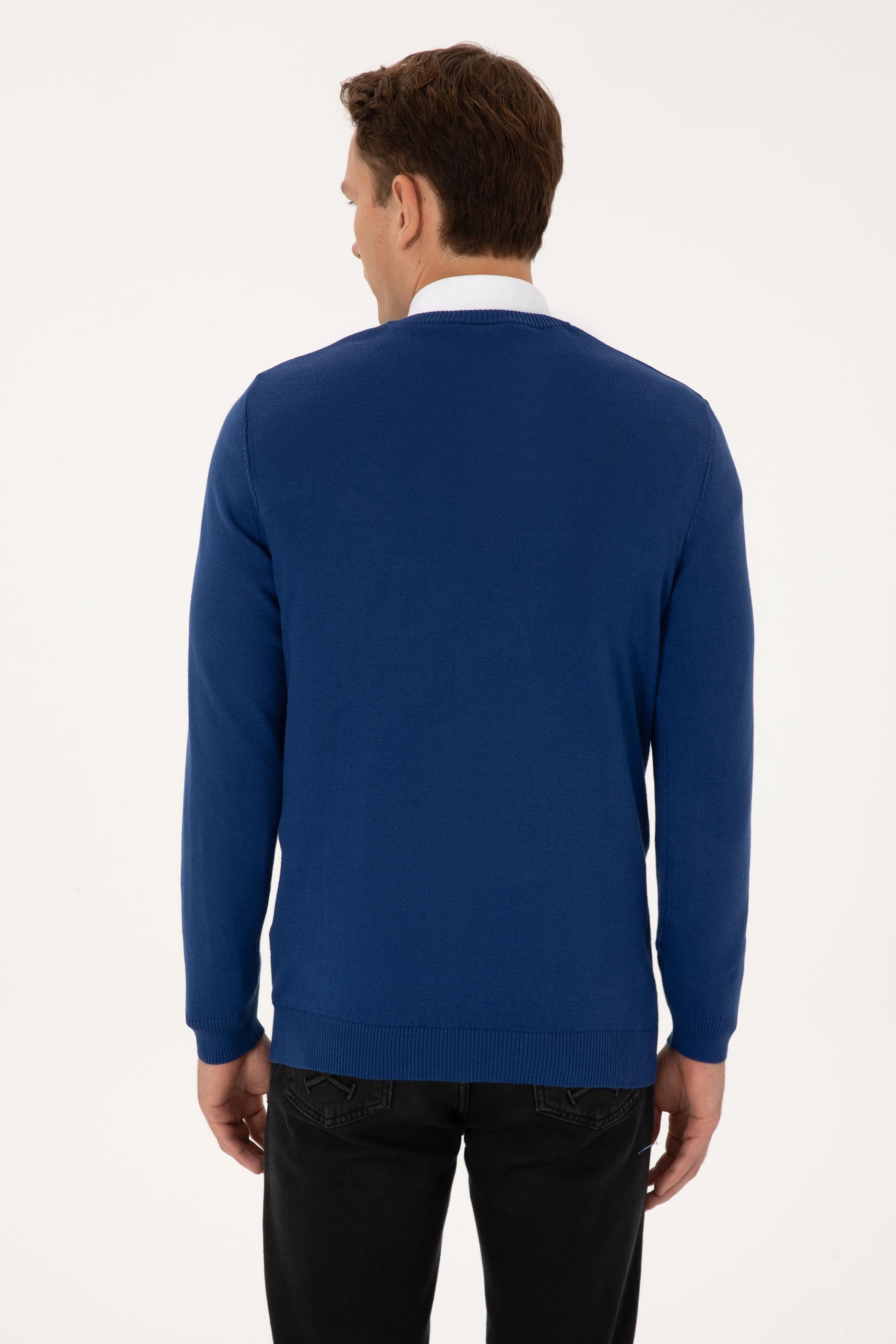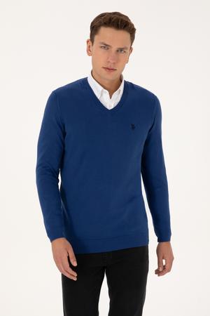 - Erkek Slim Fit V Yaka İndigo Basic Triko Kazak
