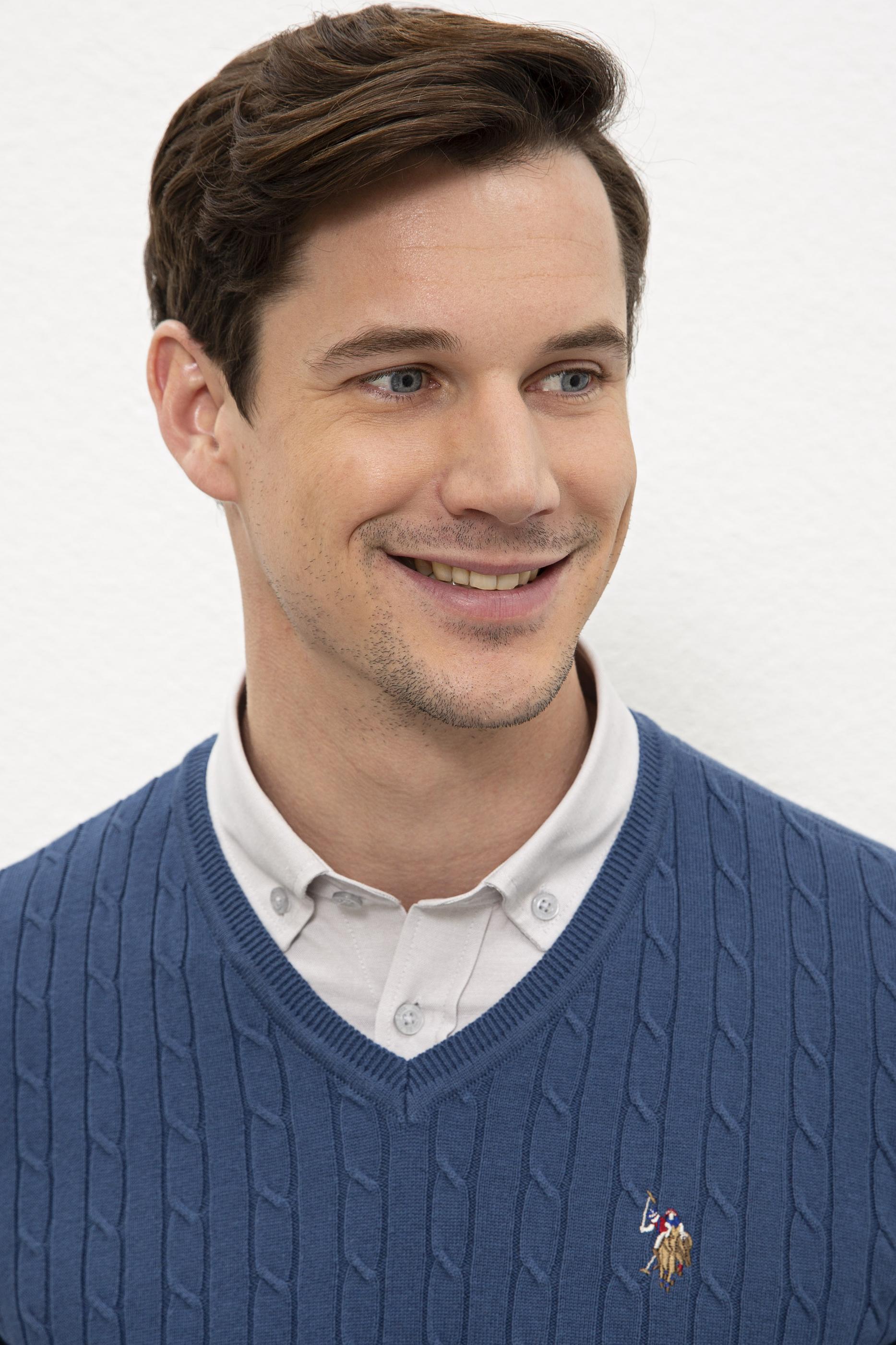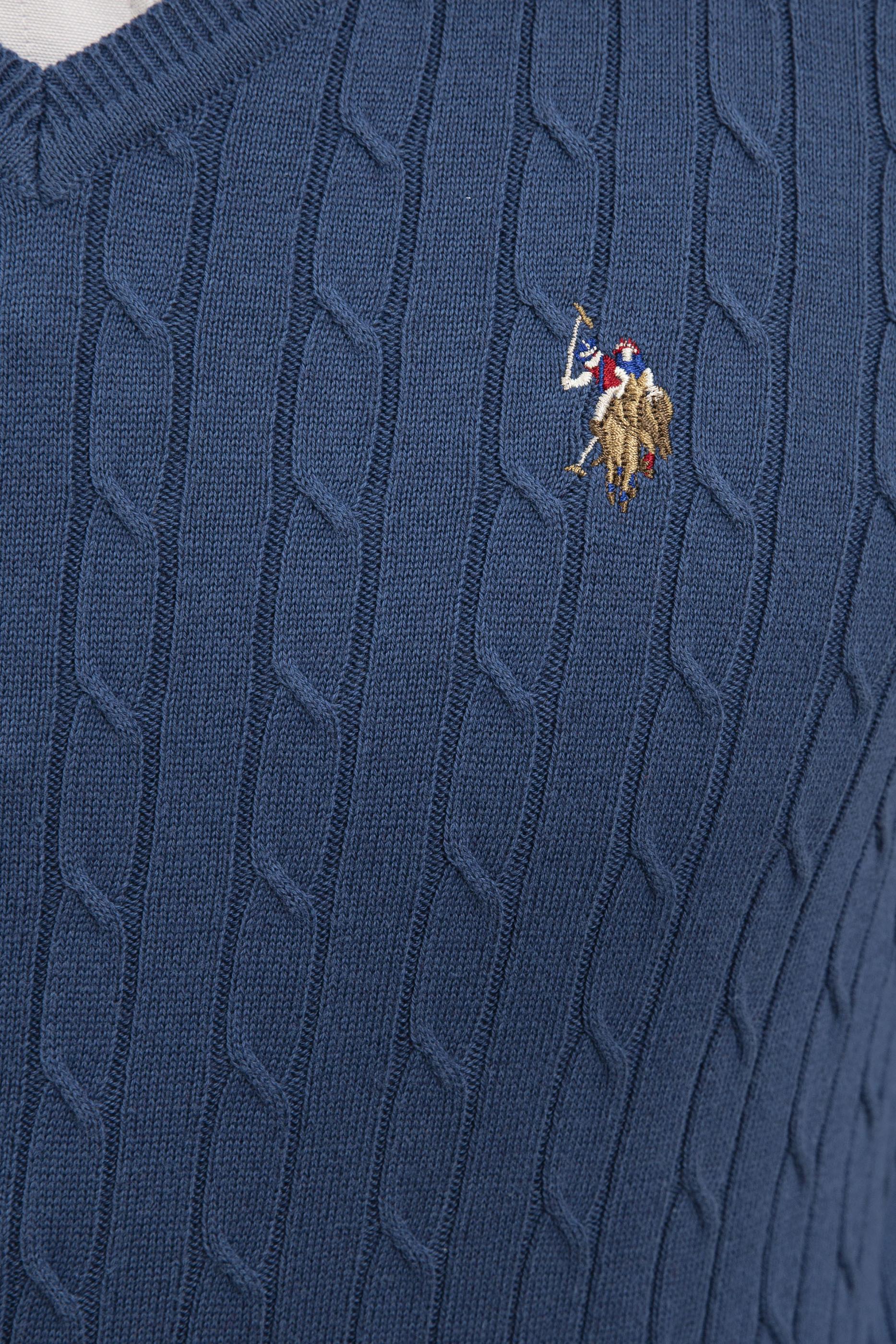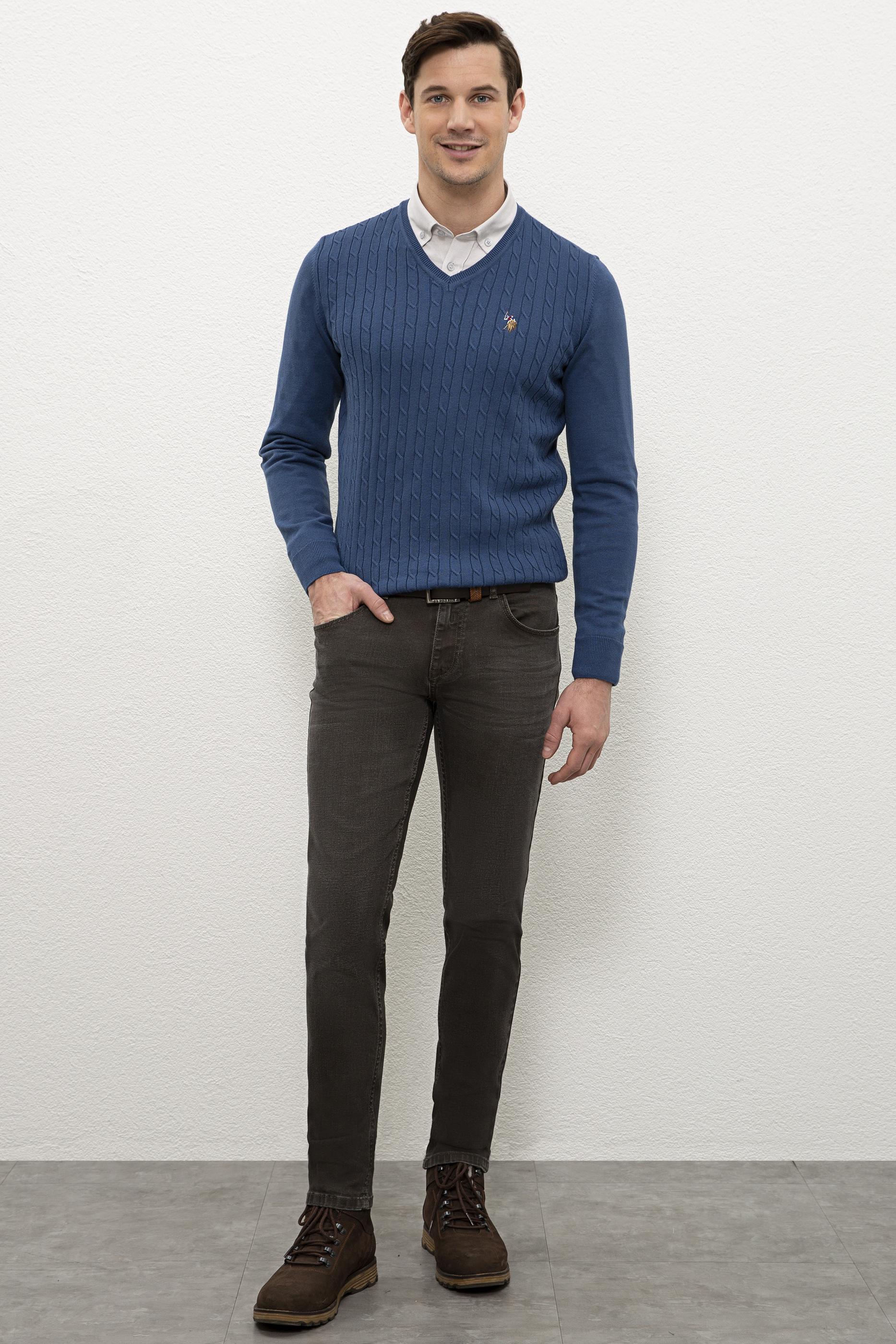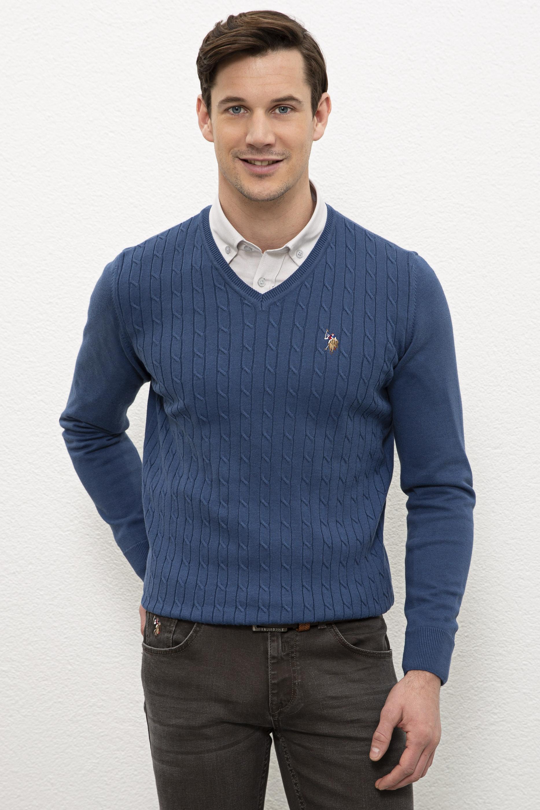 Erkek İndigo V-Yaka Triko Kazak Basic