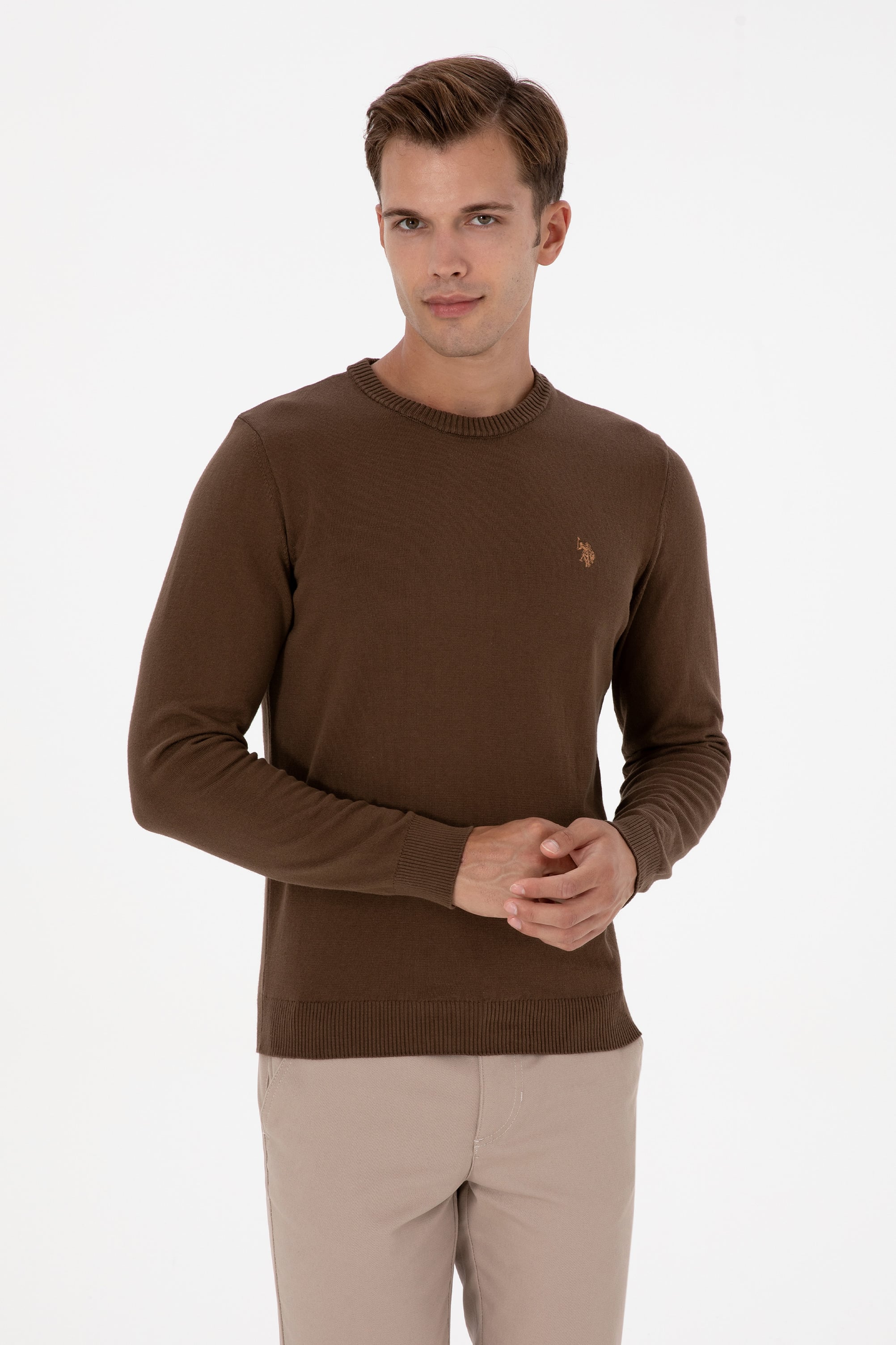 Erkek Slim Fit Bisiklet Yaka Kahverengi Basic Kazak