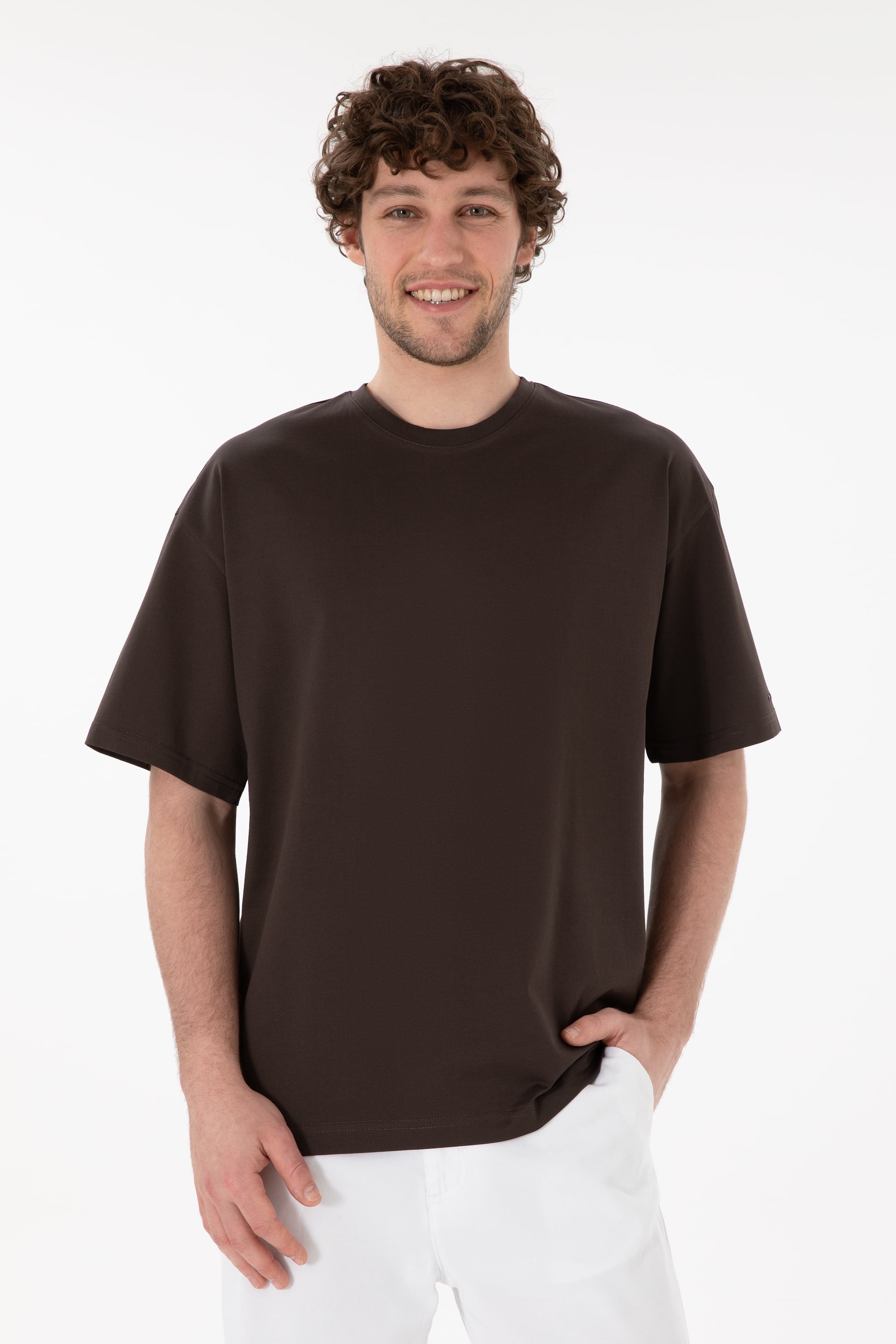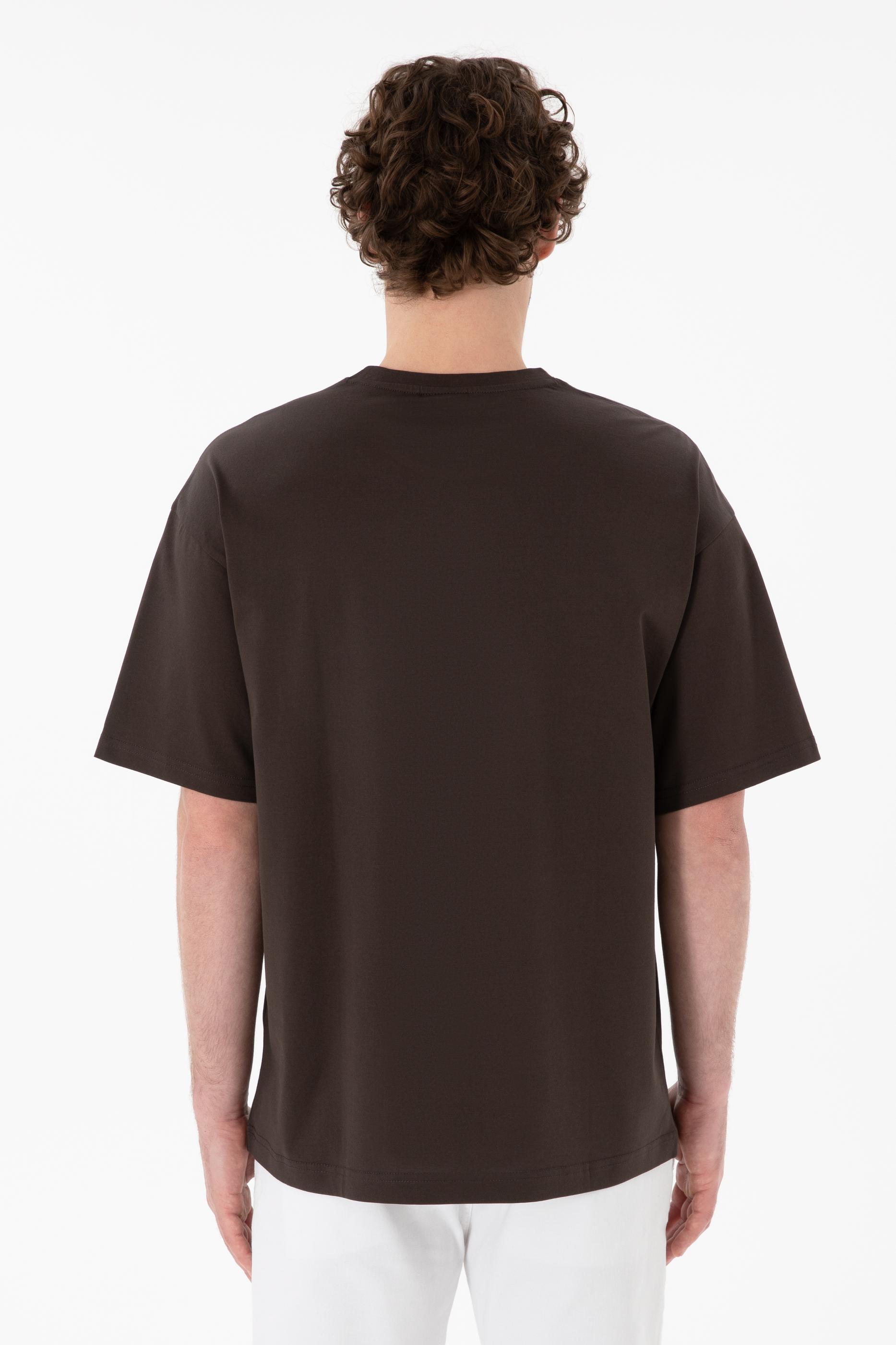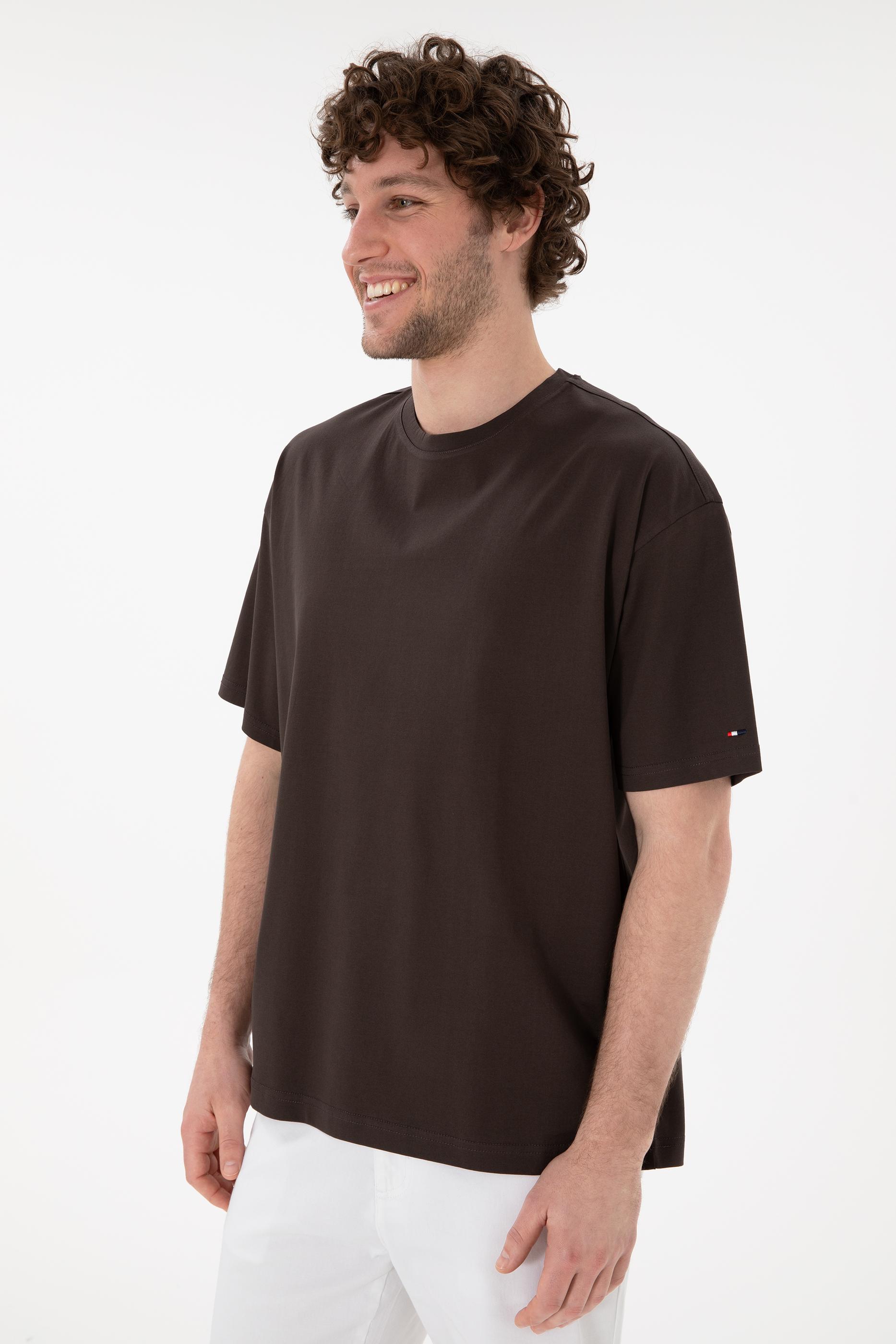 - Erkek Comfort Fit Bisiklet Yaka Kahverengi Merserize Basic Tişört