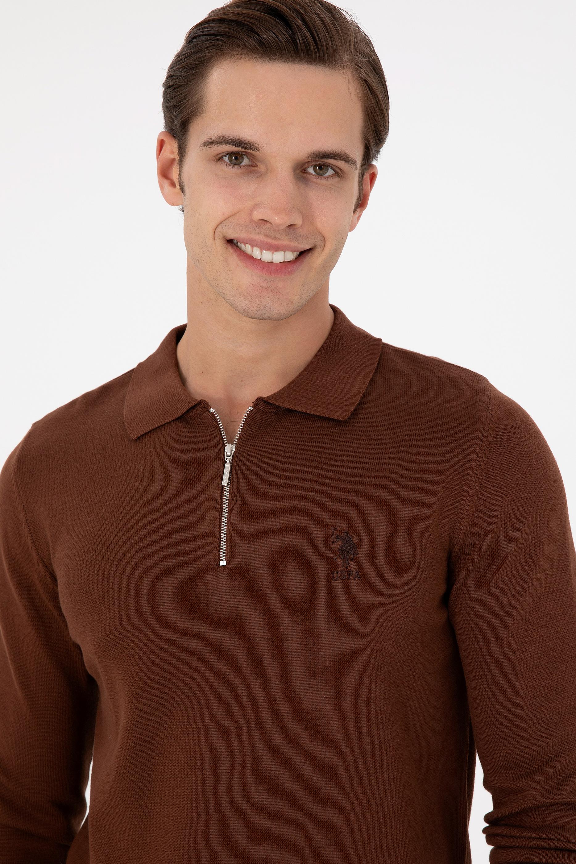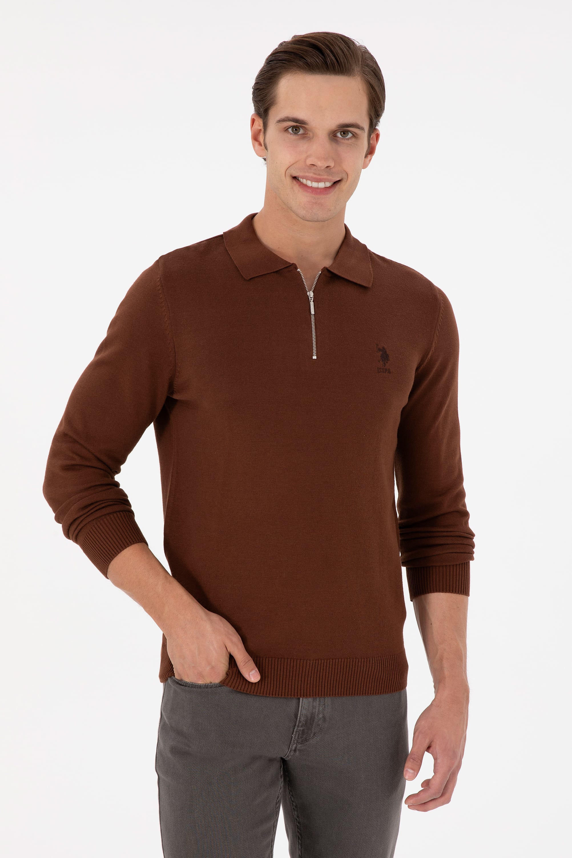 Erkek Slim Fit Yarım Fermuarlı Kahverengi Basic Kazak