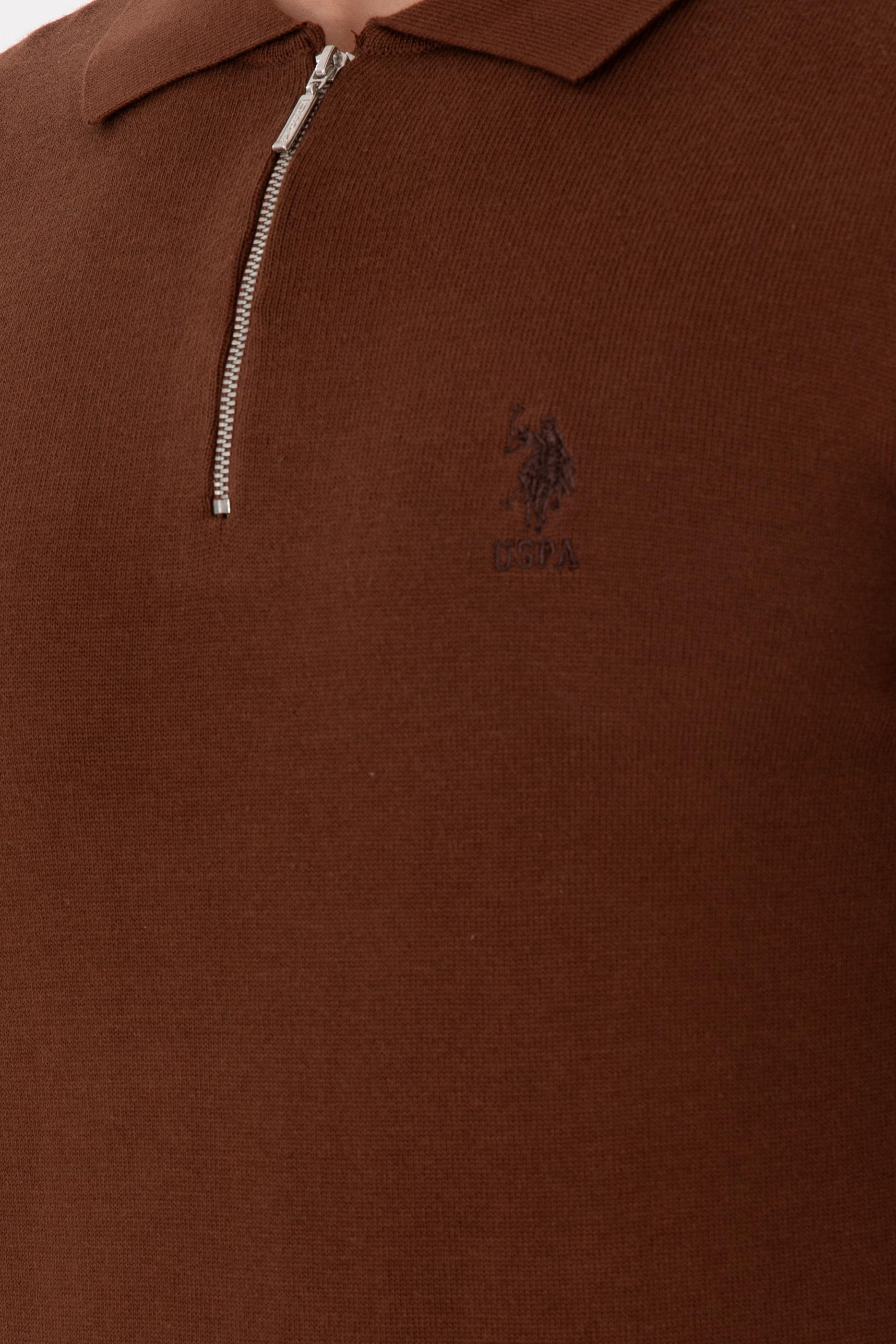 - Erkek Slim Fit Yarım Fermuarlı Kahverengi Basic Kazak