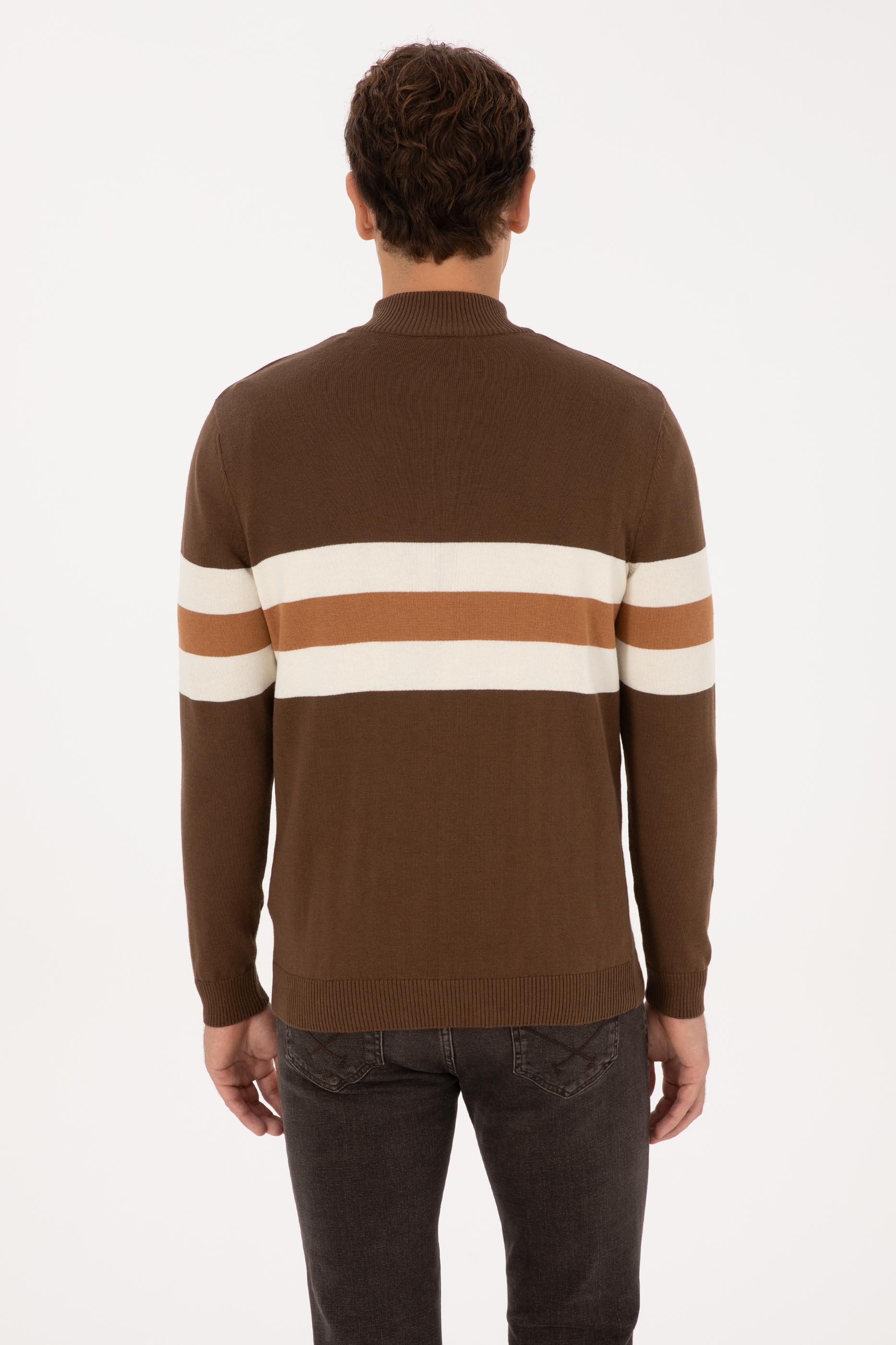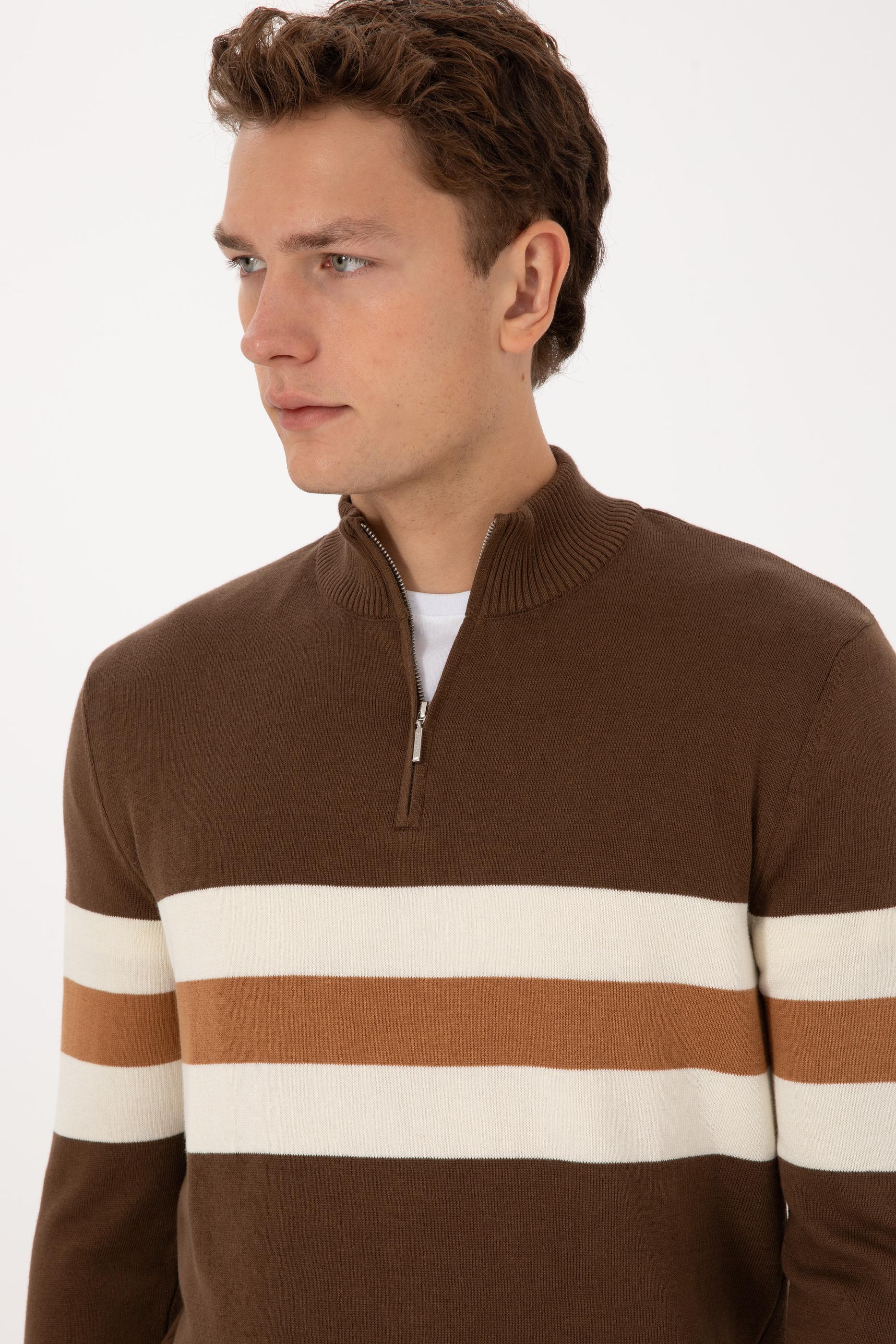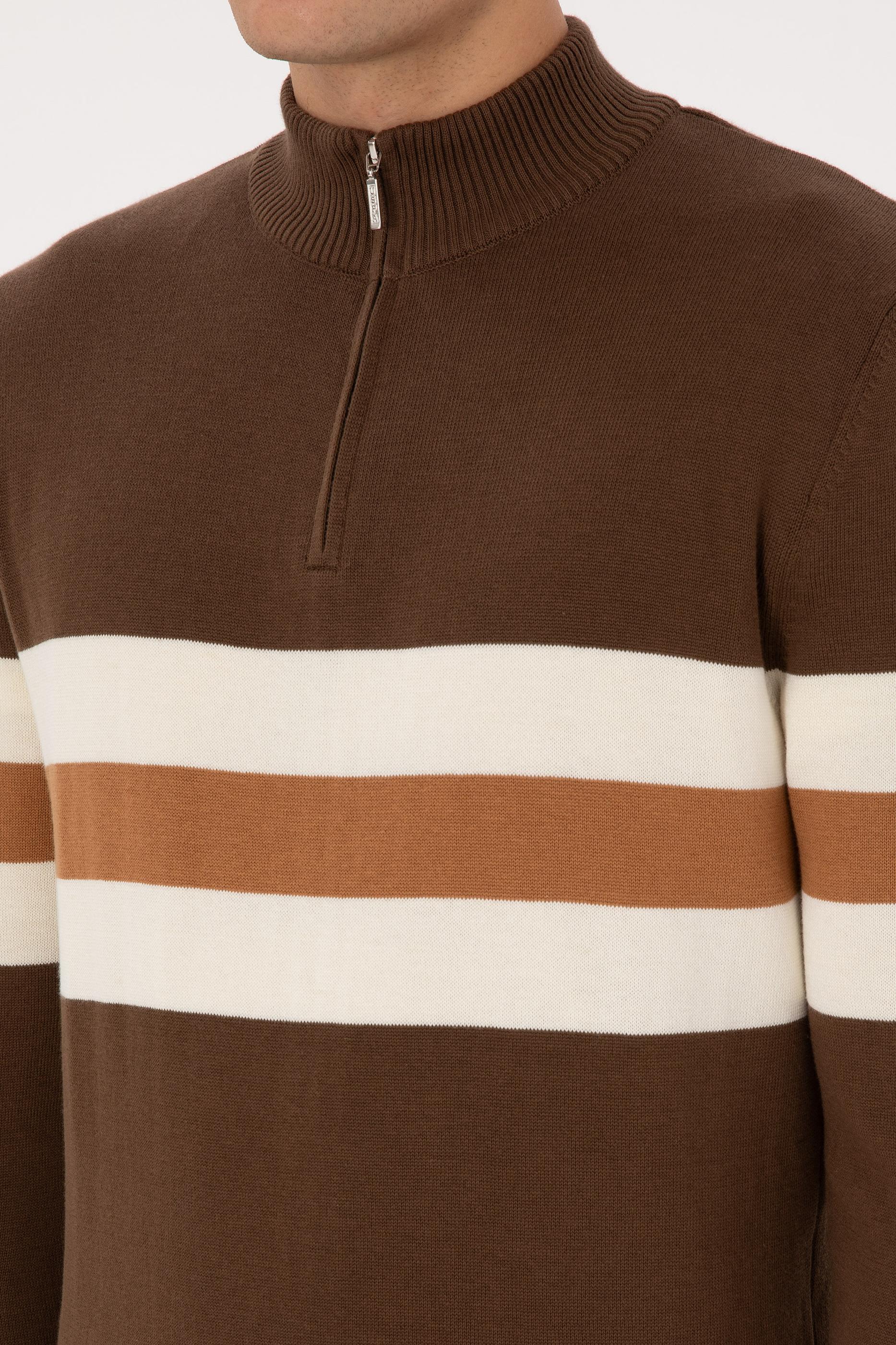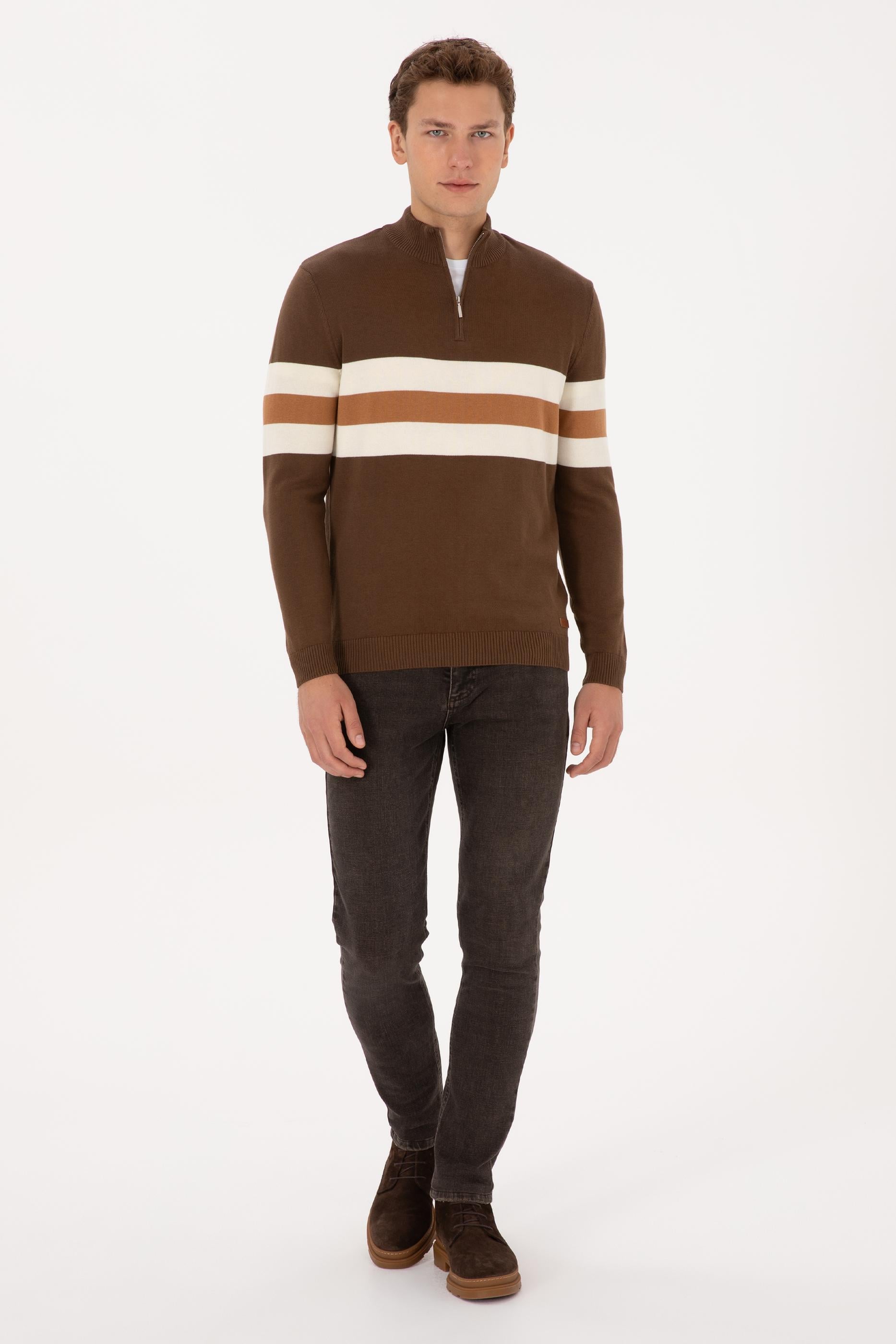 - Erkek Regular Fit Yarım Fermuarlı Kahverengi Kazak