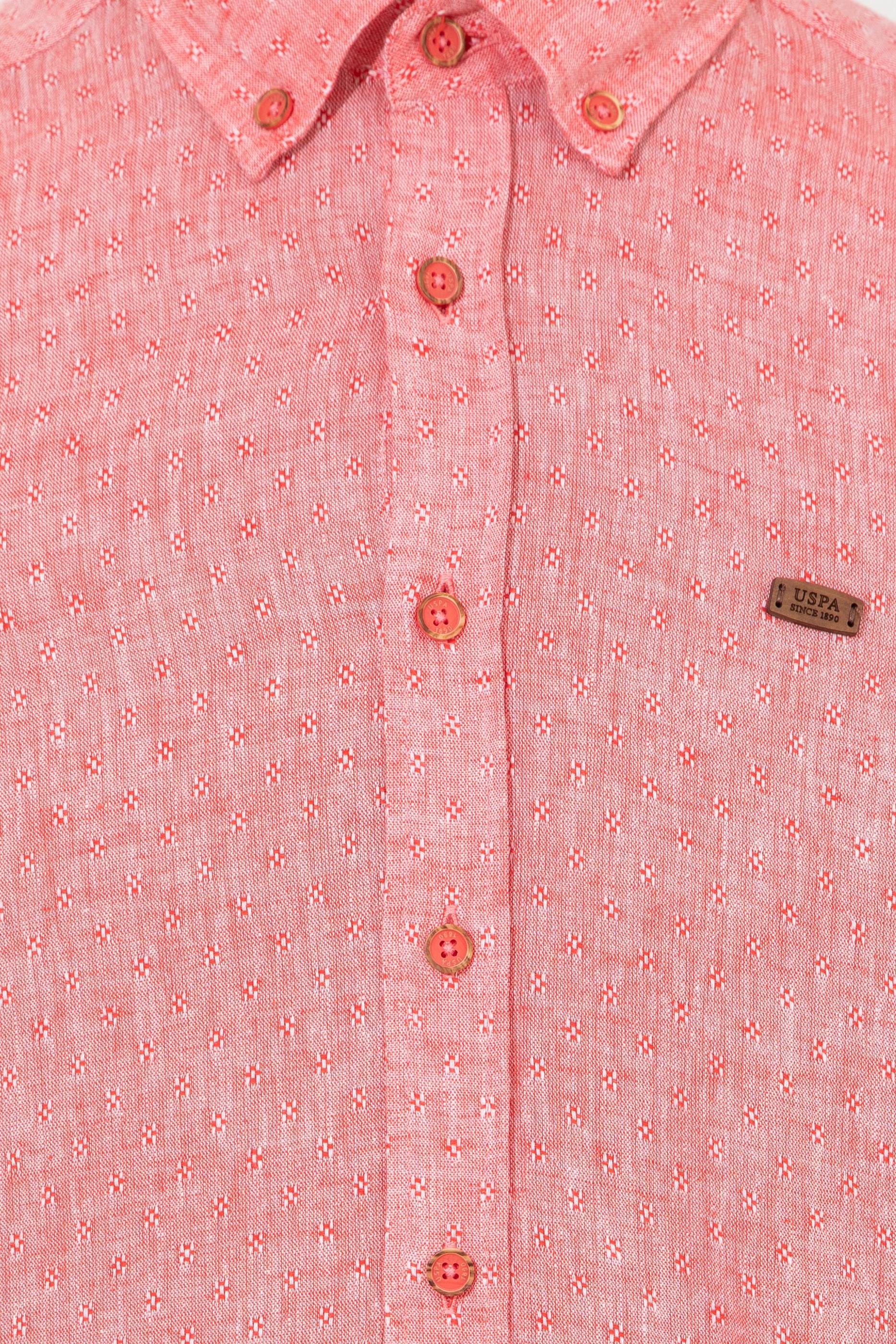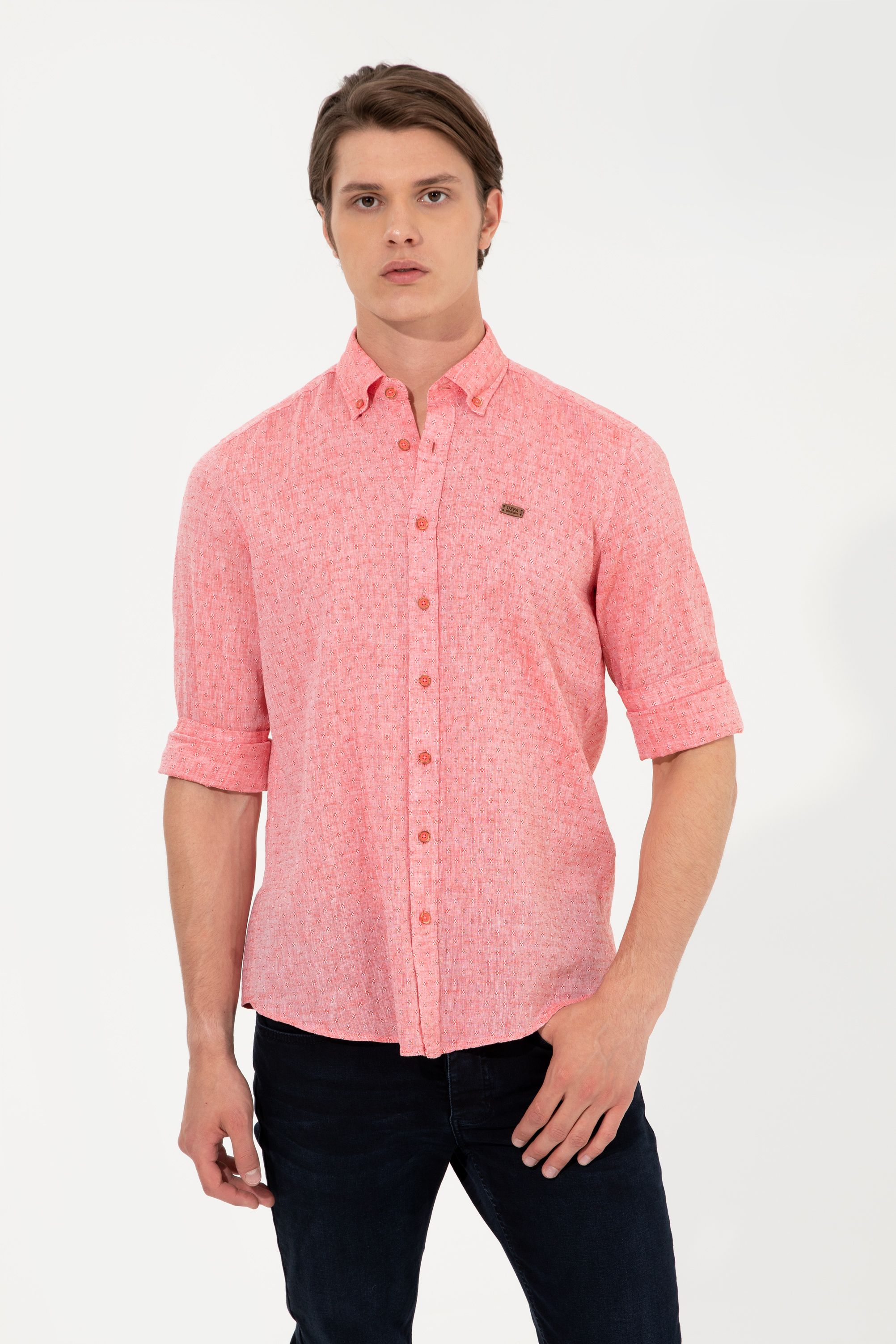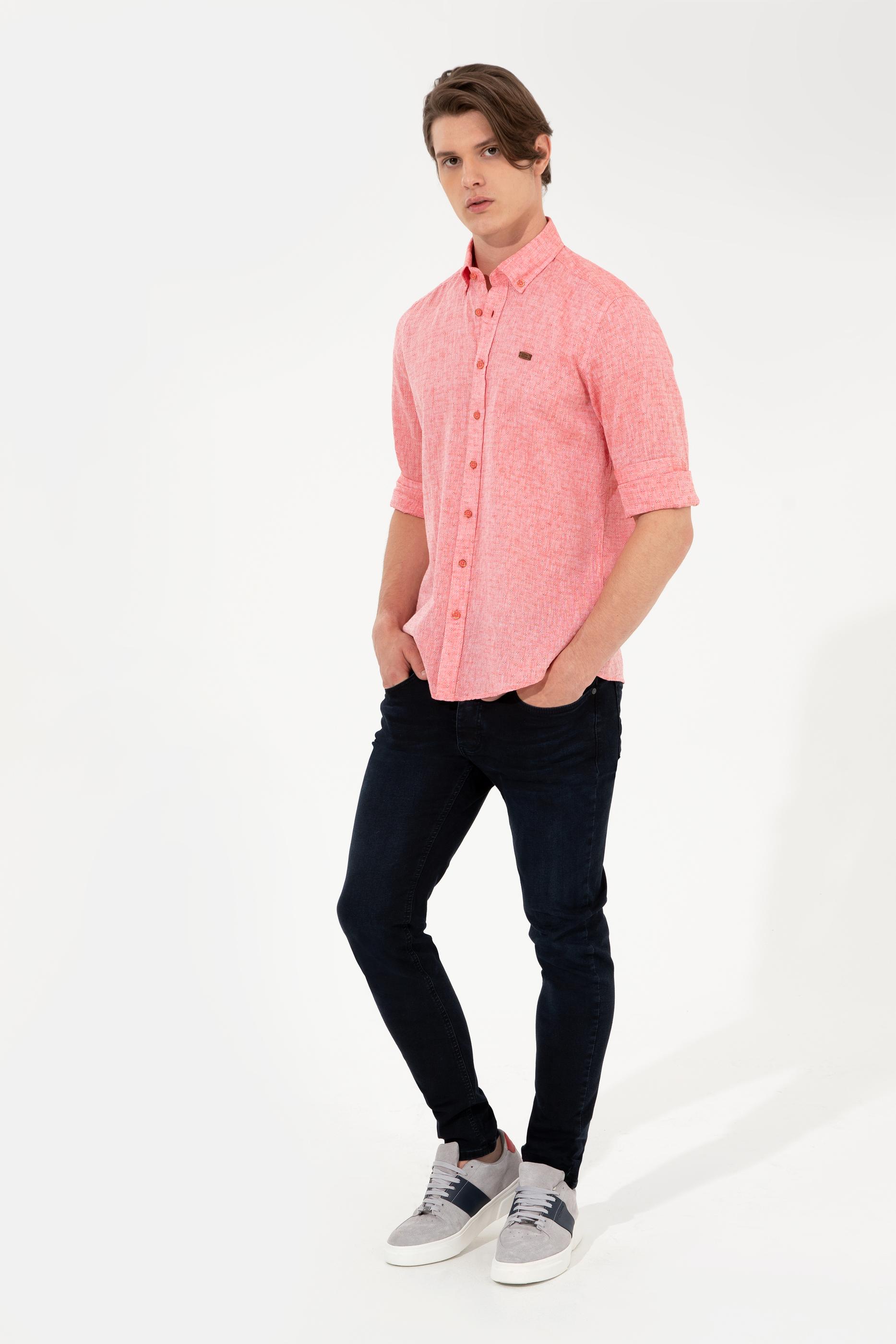 Sıcak yaz günlerinin ideal parçalarından pamuk ve keten karışımlı erkek gömleğimiz dinamik efekt veren düğmeli yaka detaya sahiptir.