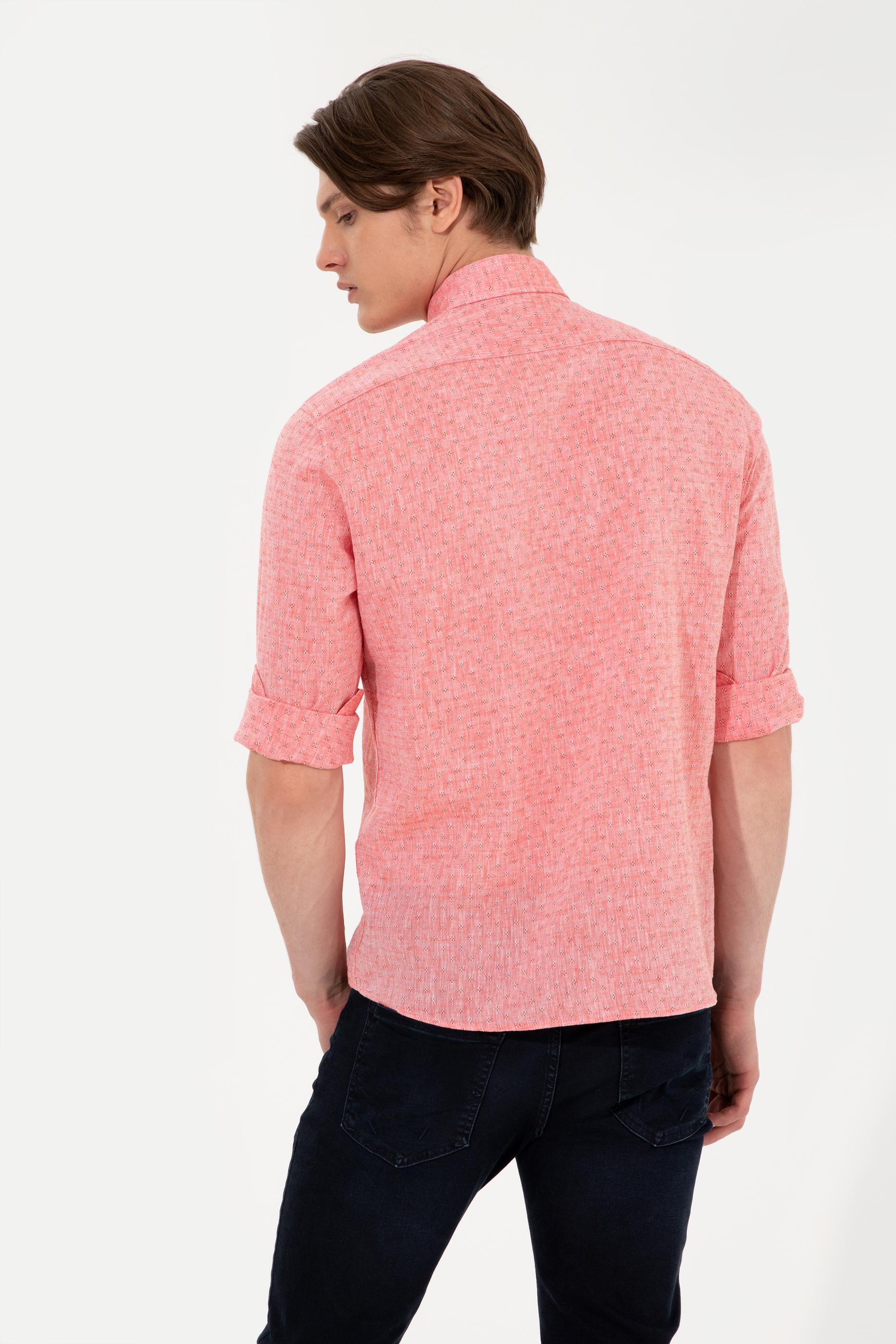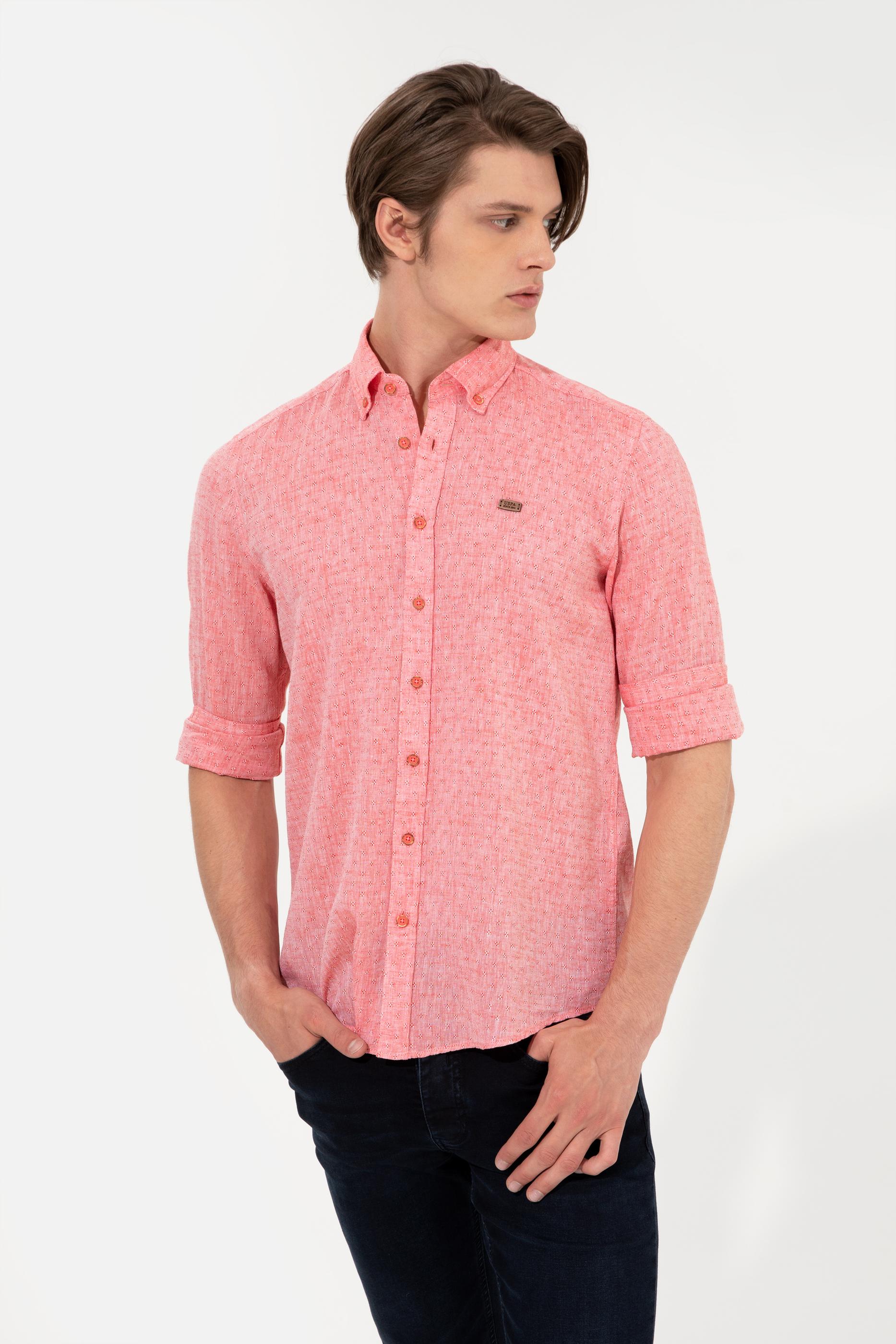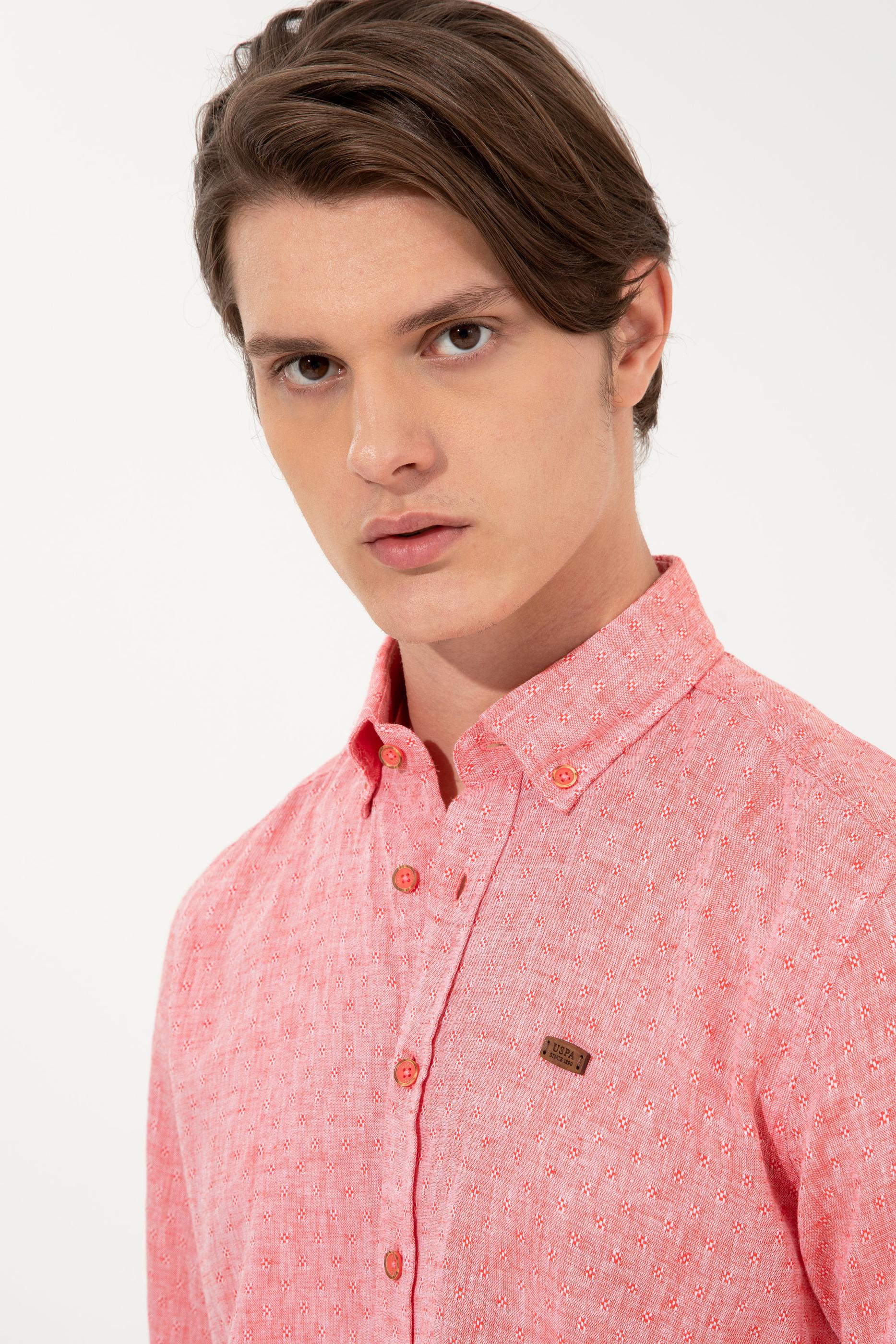 Canlı renk ve mikro desenleri bir araya getirerek tasarladığımız uzun kollu erkek gömleğimiz kolay ütülenebilir formdadır. Regular fit uzun kollu erkek gömleğimiz hafif dökümlü yapısıyla vücudunuzu sarmadan şık bir görünüm elde etmenizi sağlar. Sıcak yaz günlerinin ideal parçalarından pamuk ve keten karışımlı erkek gömleğimiz dinamik efekt veren düğmeli yaka detaya sahiptir.