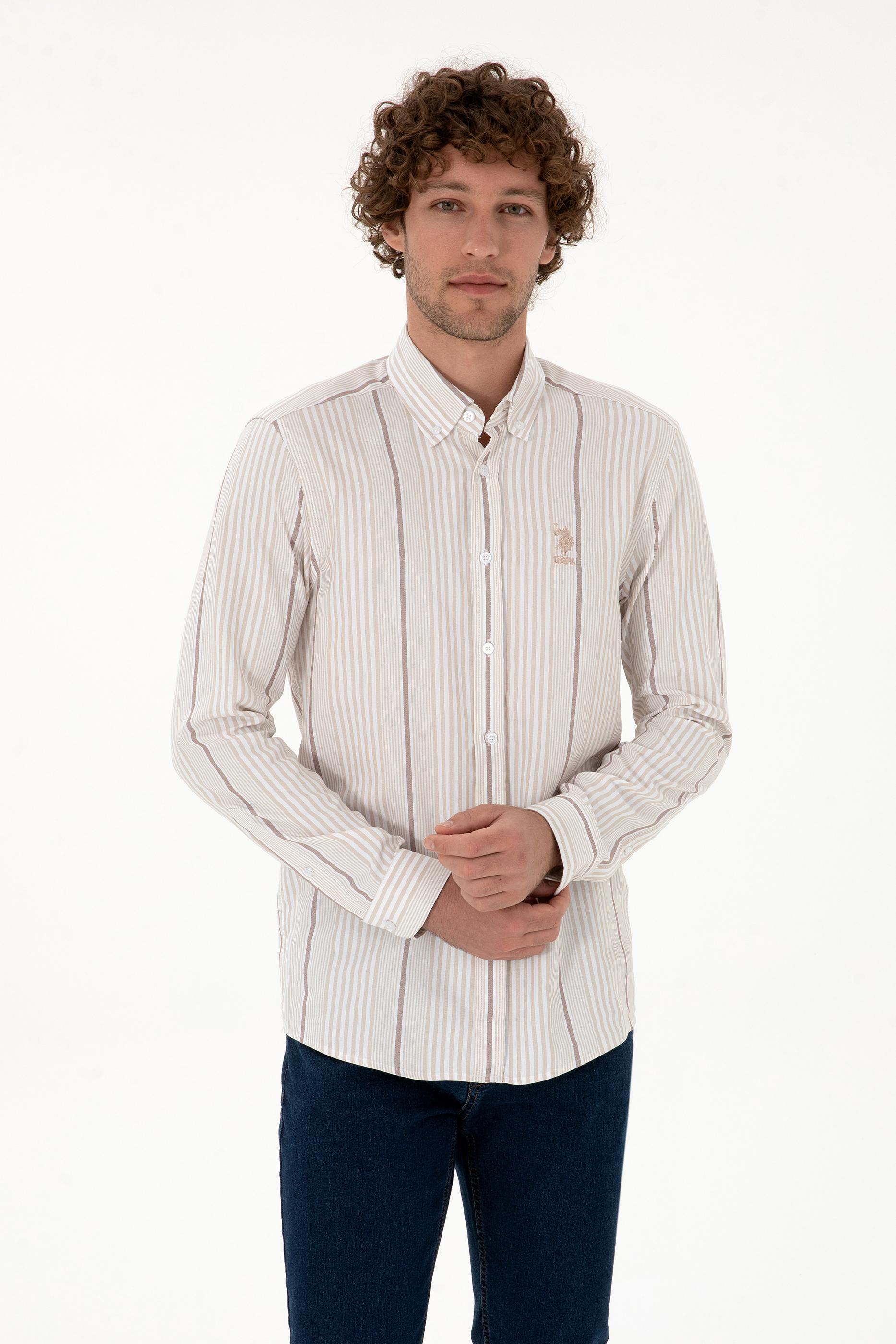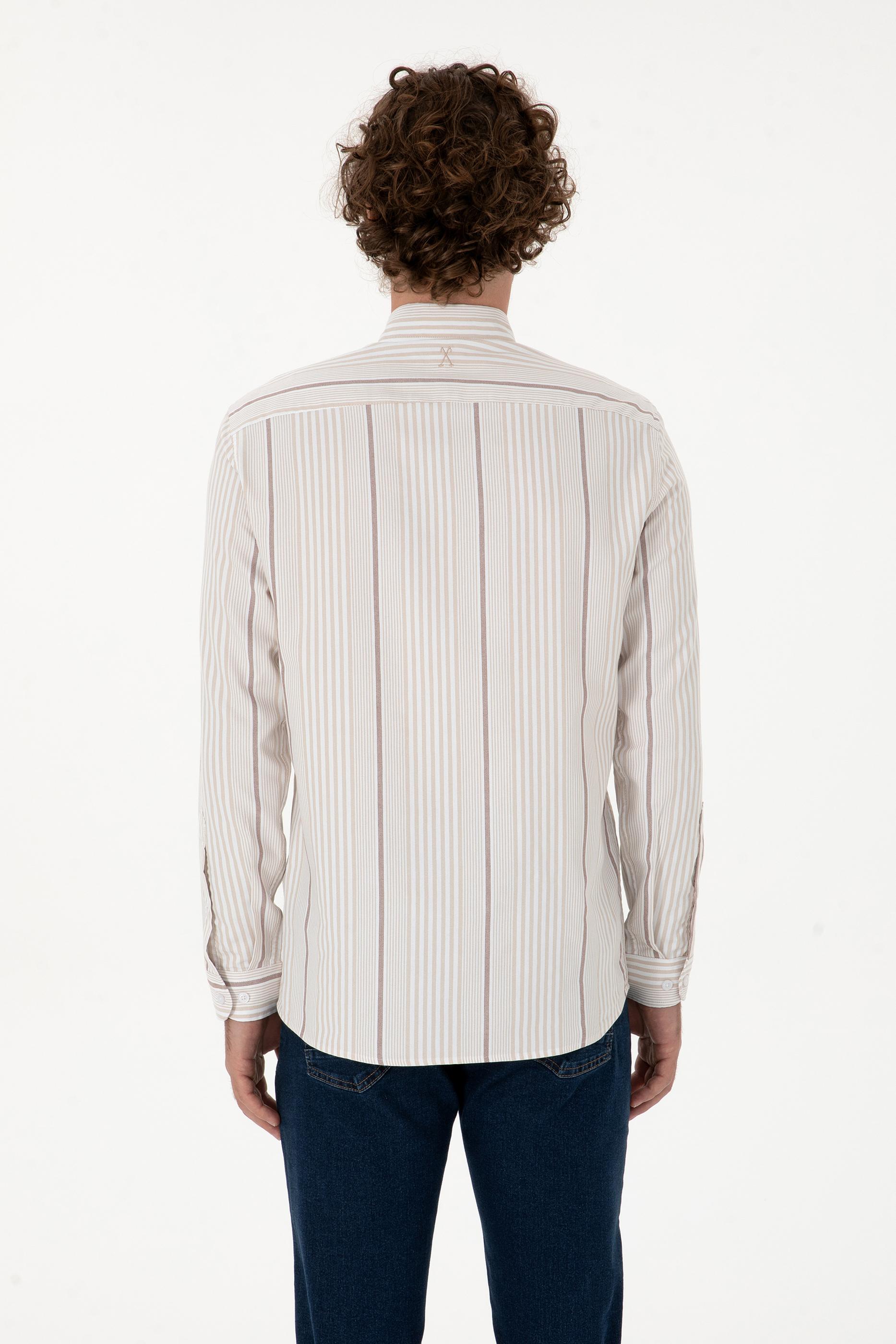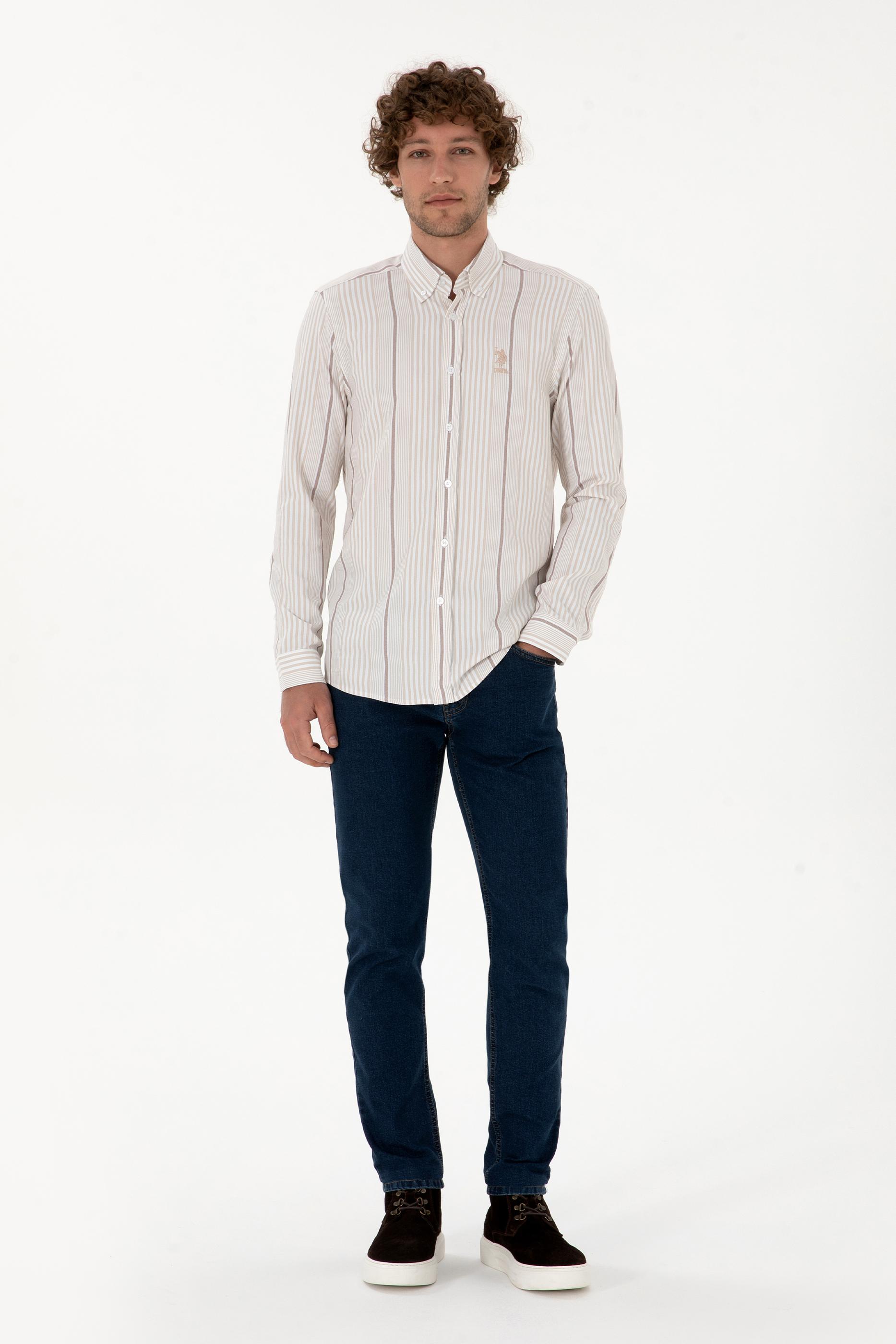 Erkek gömlek, bej rengi ve çizgili deseniyle sofistike bir şıklık sunar. Slim fit kalıbı vücudu hafifçe sararak fit bir görünüm kazandırır ve modern bir duruş sağlar. Uzun kollu tasarımı klasik bir hava katarken, polo yaka detayı gömleğe zarif bir stil ekler. Düğmeli kapama sistemi pratik kullanım imkânı sunarken, çizgili desen yapısı modeli daha dinamik ve dikkat çekici hale getirir. Jean ve chino pantolonlarla günlük şıklık yakalanabilir, klasik pantolonlarla ise ofis ortamında ya da özel davetlerde rahatlıkla tercih edilebilir. Zamansız tasarımı sayesinde her mevsim kullanılabilecek bu gömlek, gardırobun tamamlayıcı parçalarından biridir.