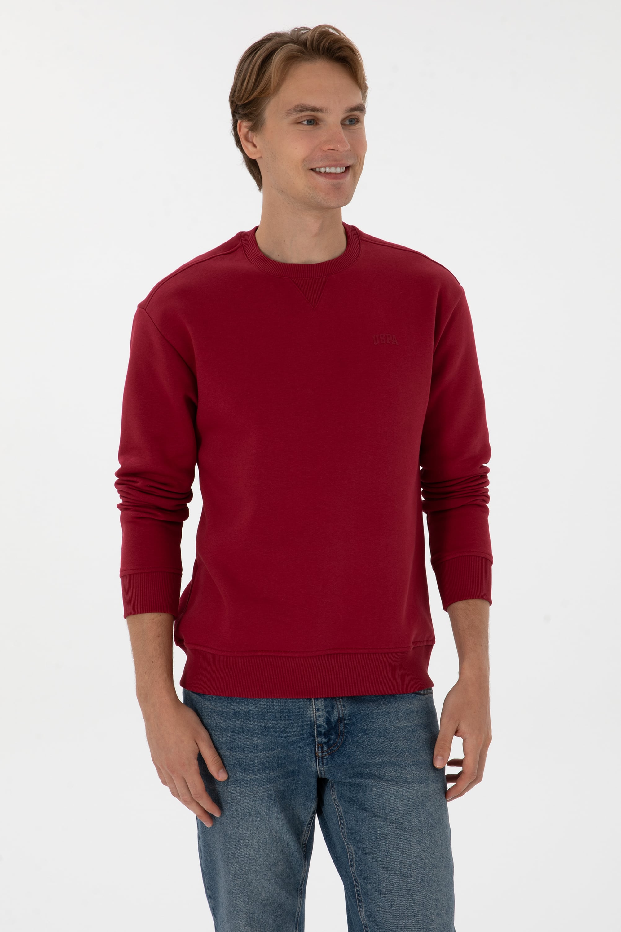 - Erkek Comfort Fit Bisiklet Yaka Şardonlu Koyu Frambuaz Basic Sweatshirt