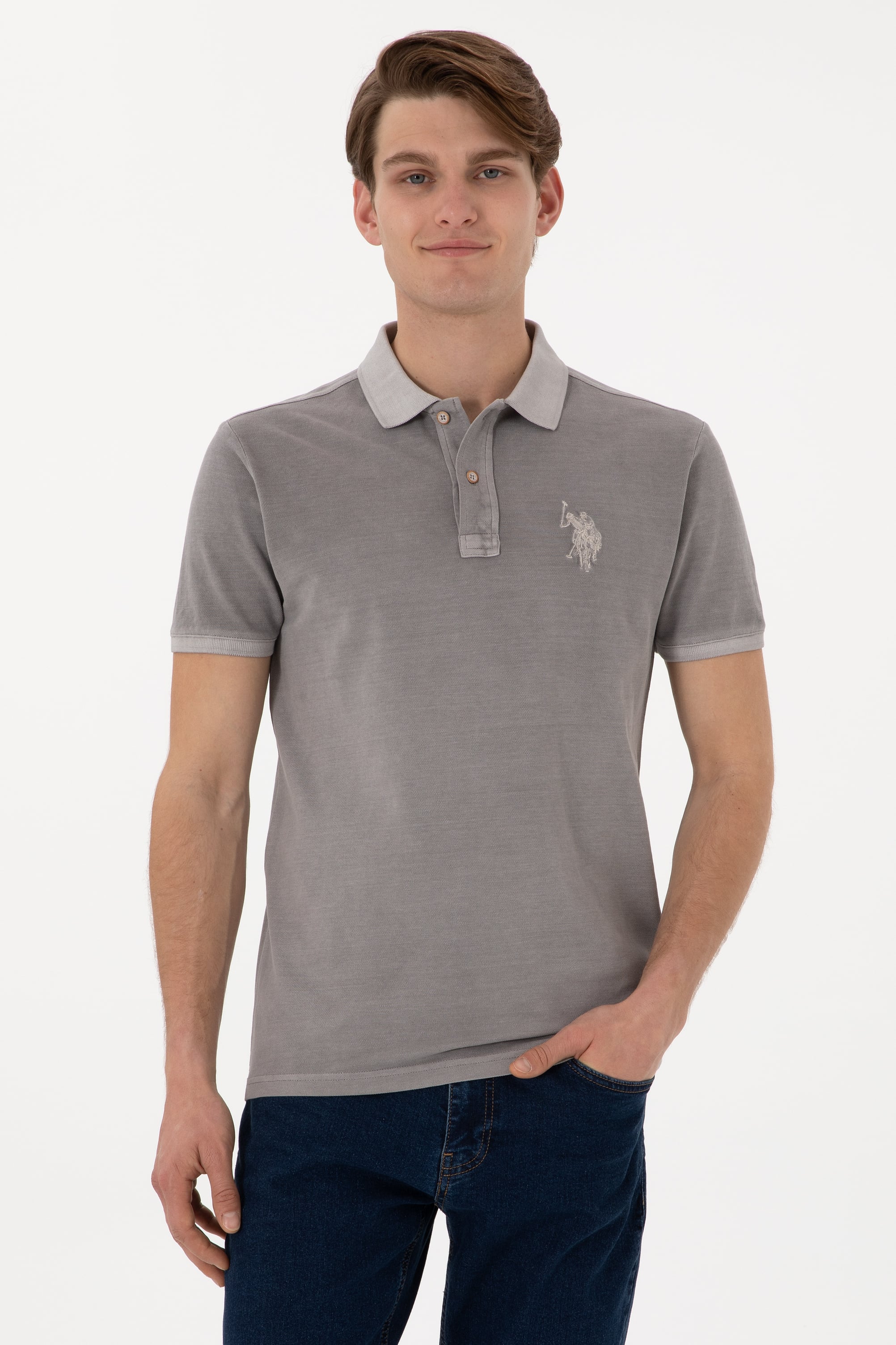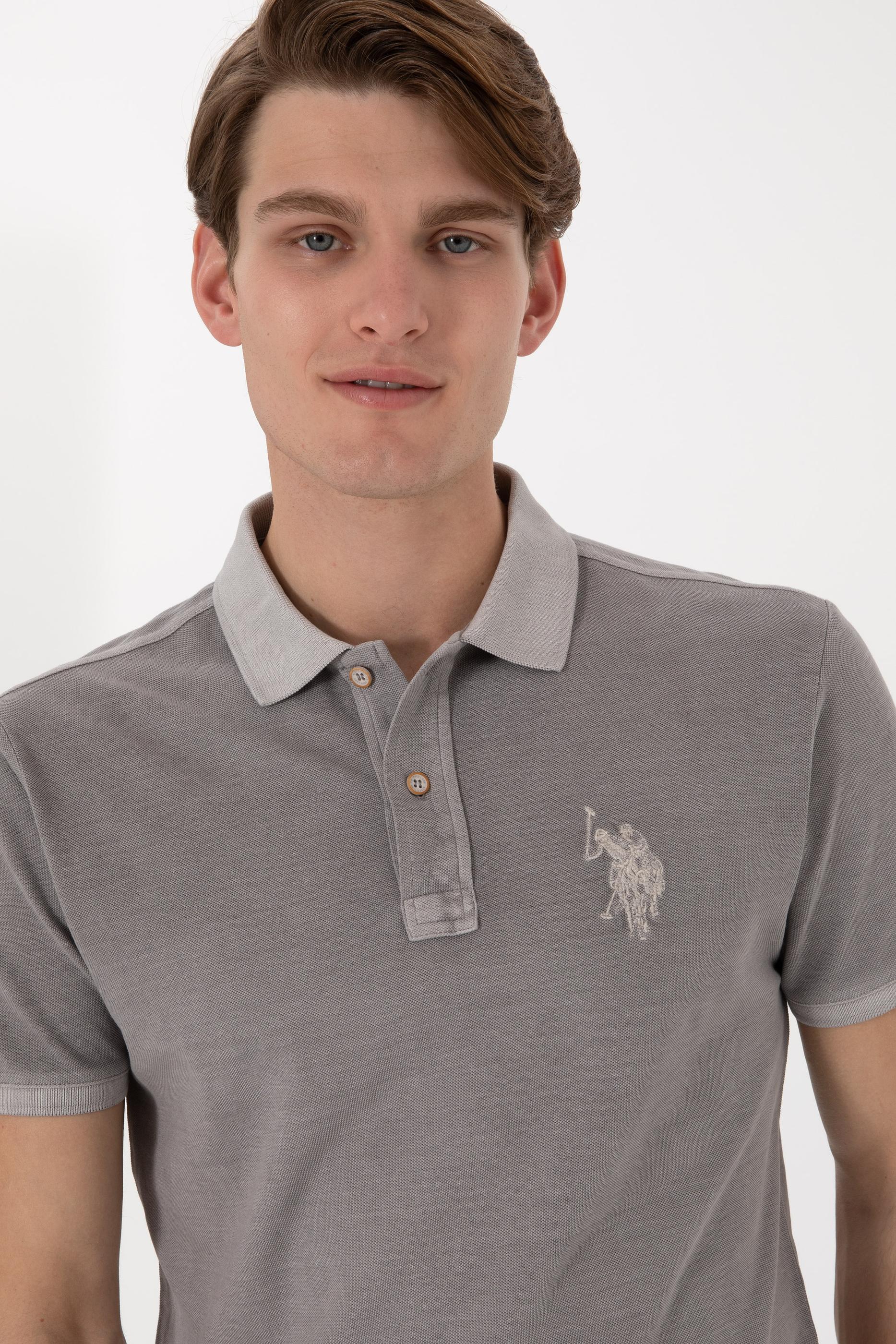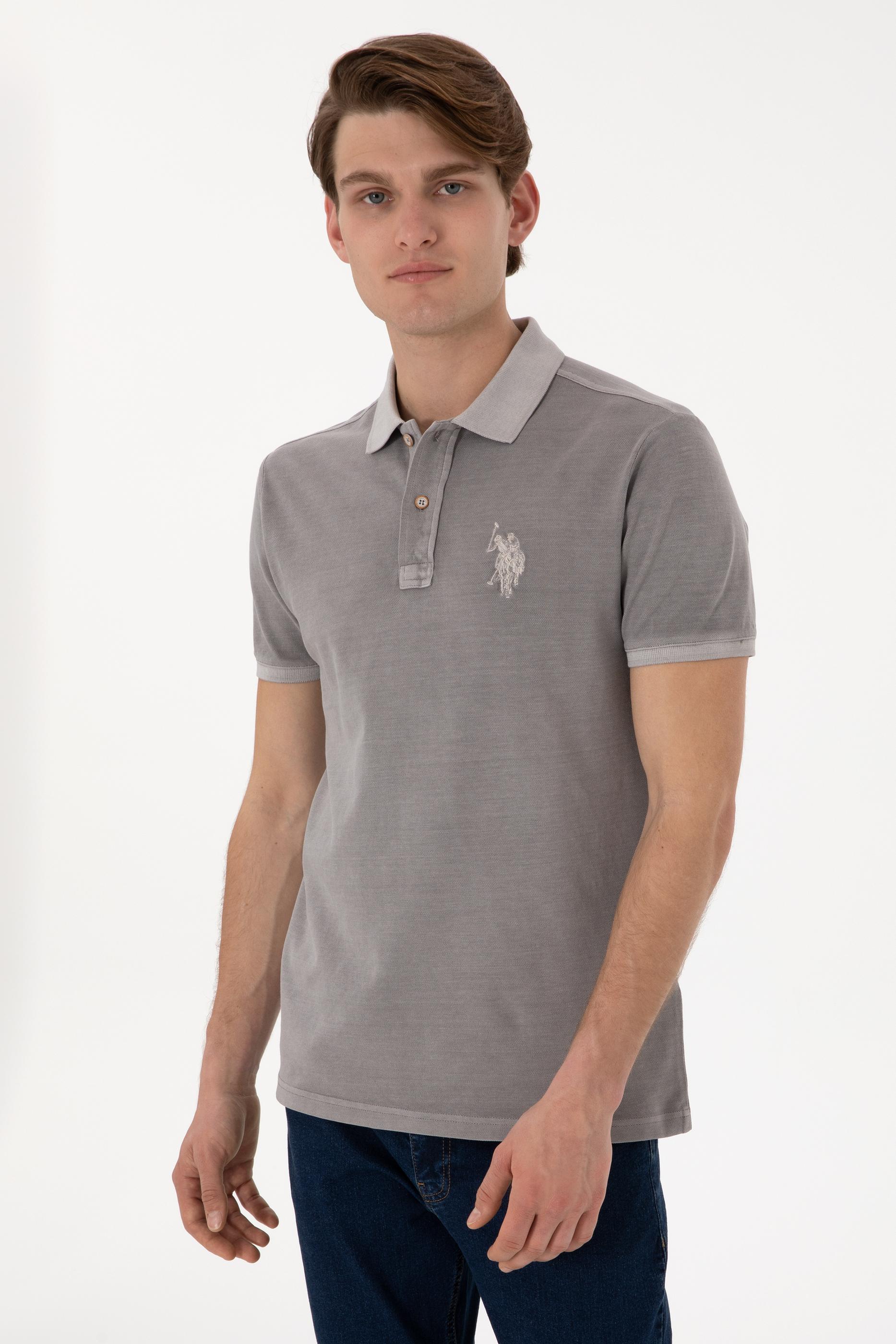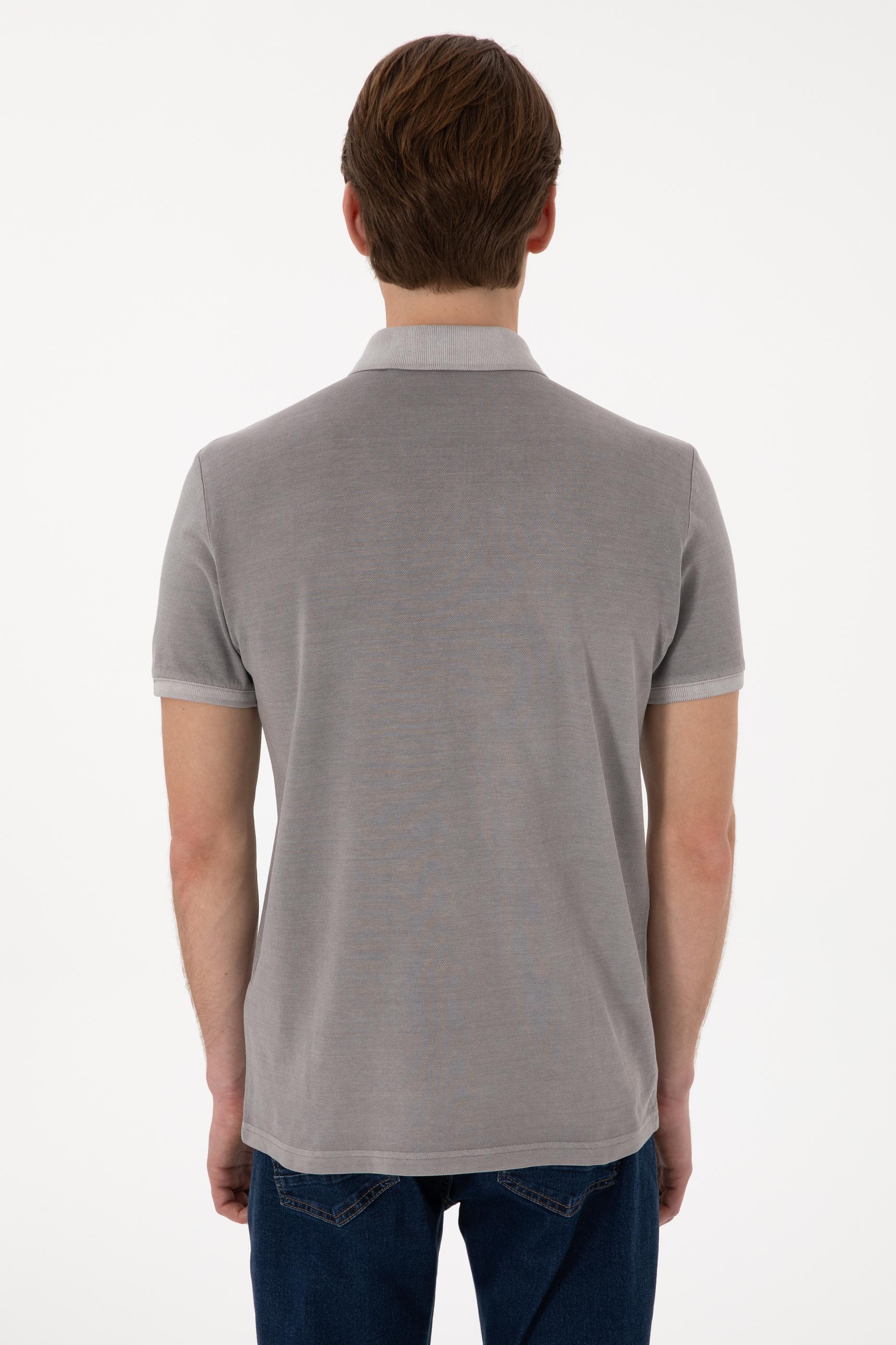 - Erkek Slim Fit Polo Yaka Koyu Gri Yıkamalı Basic Tişört
