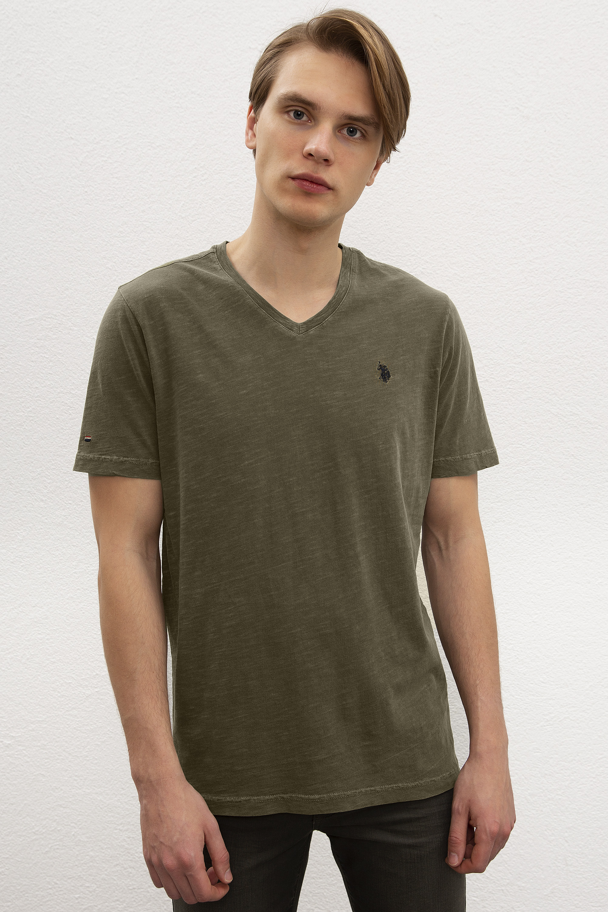 - Erkek Koyu Haki V-Yaka T-Shirt Basic