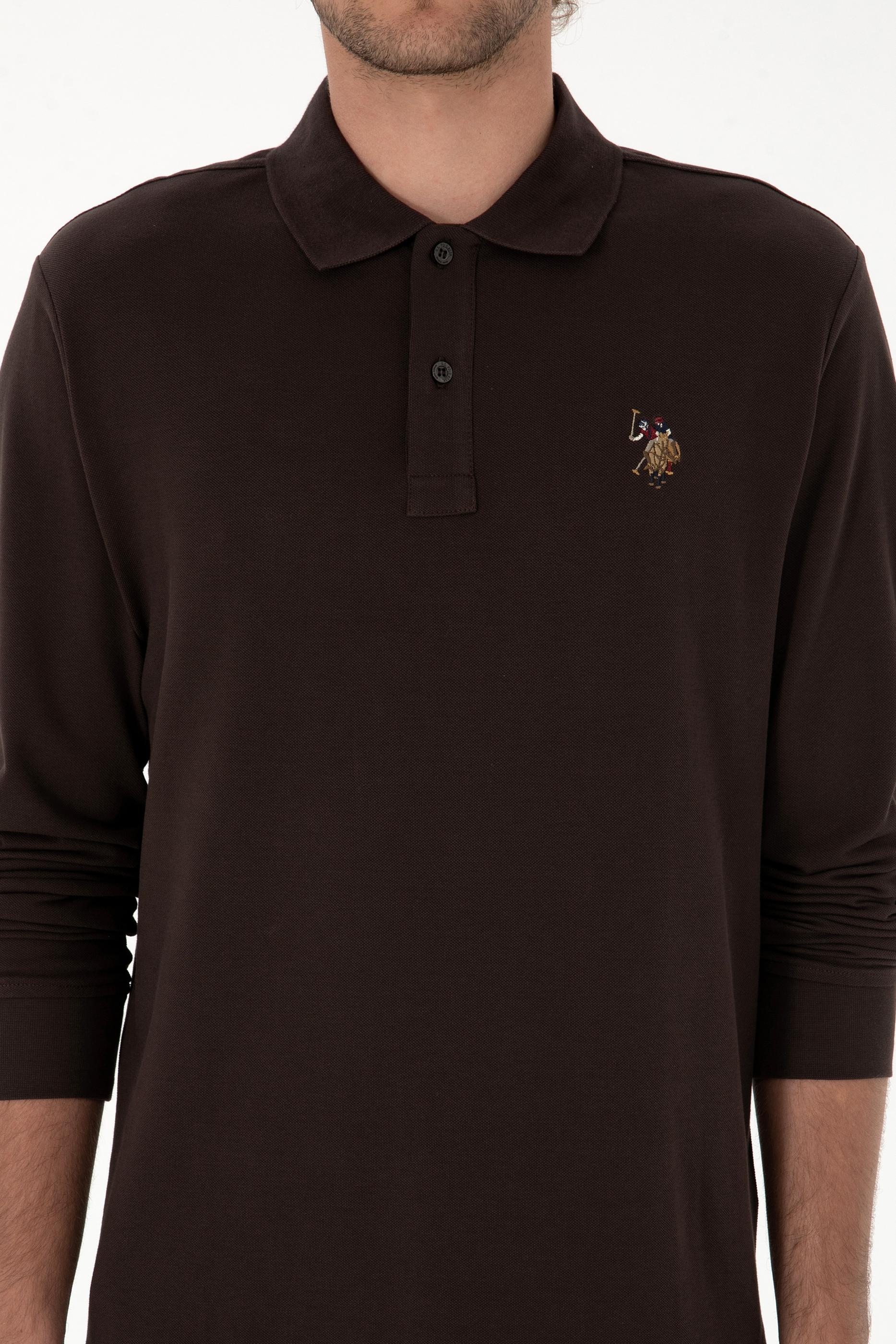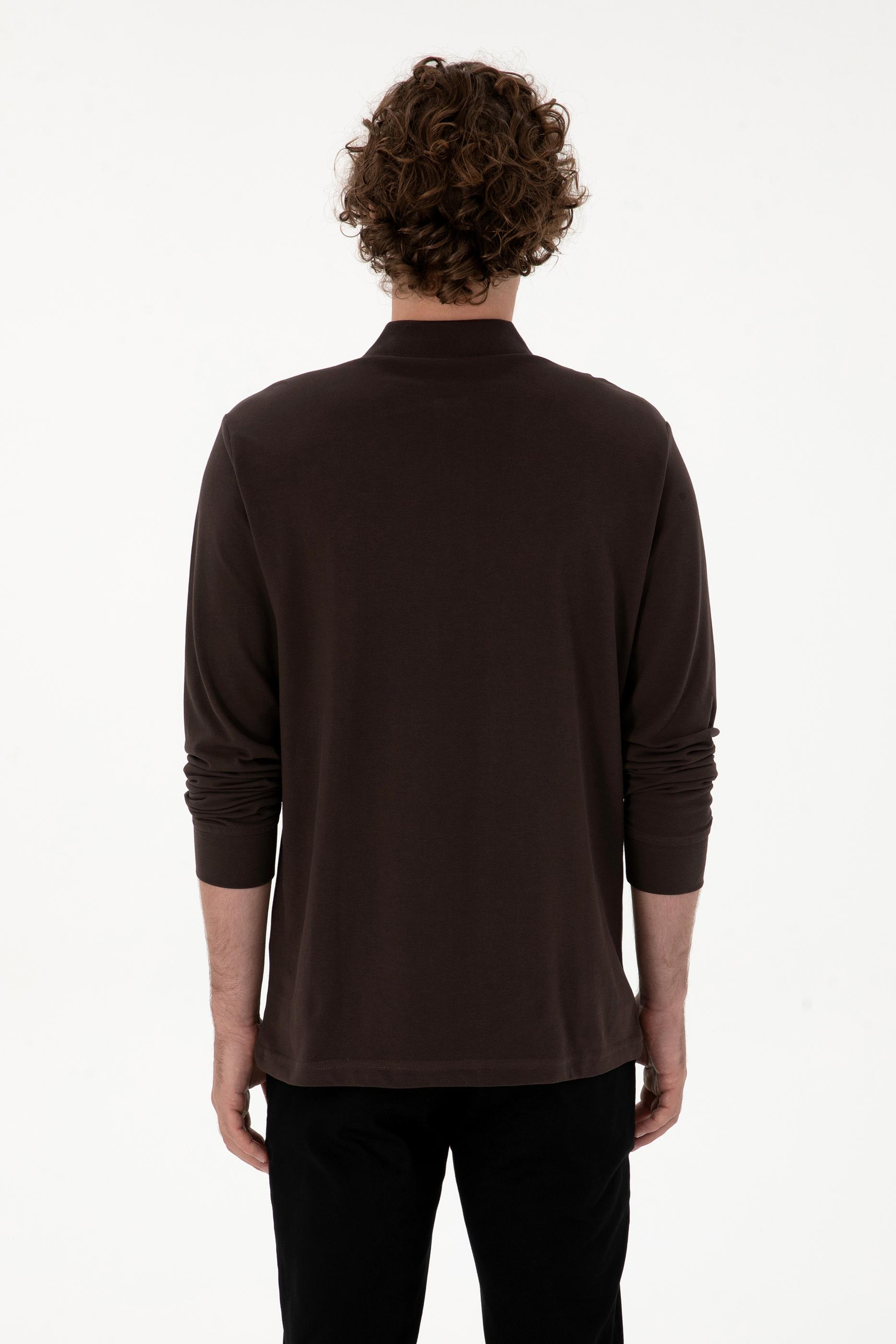 Erkek Regular Fit Polo Yaka Koyu Kahverengi Basic Sweatshirt