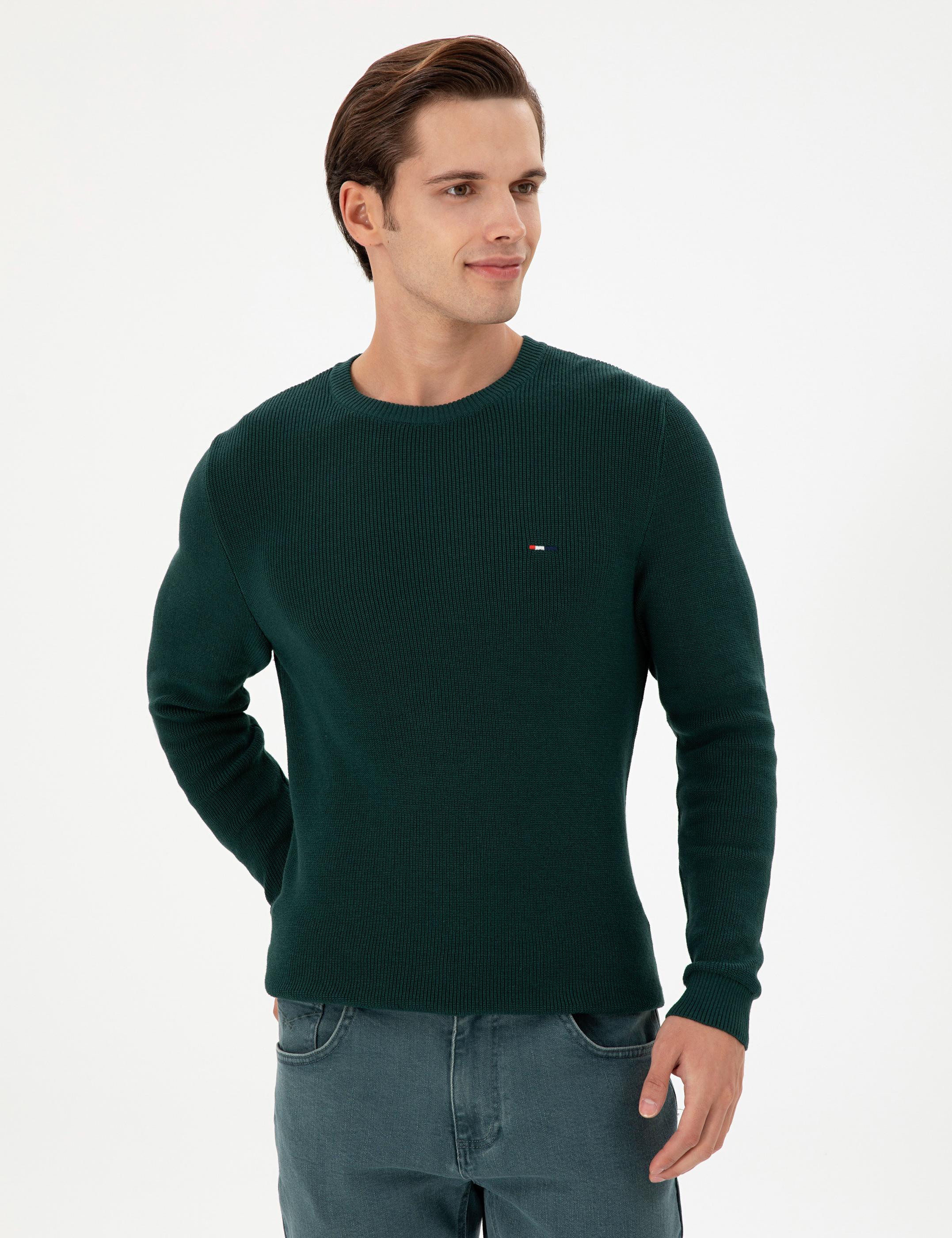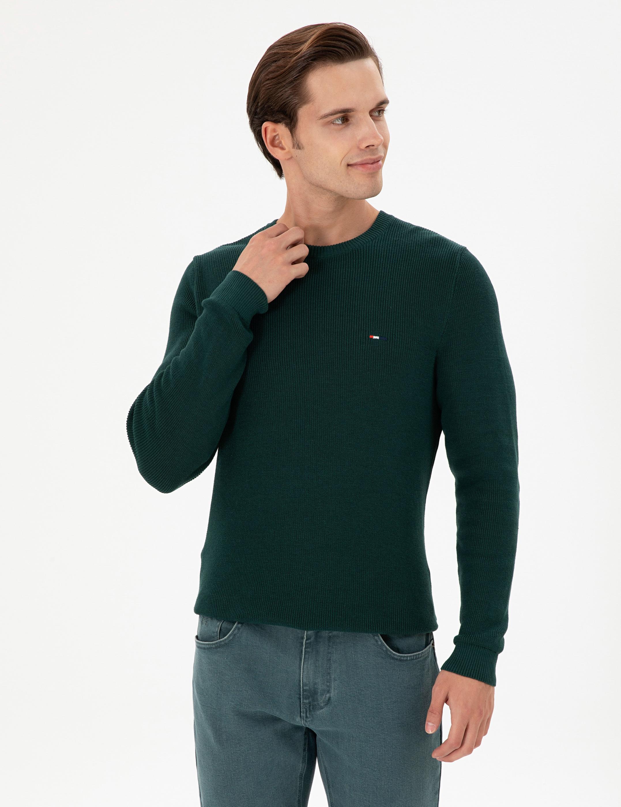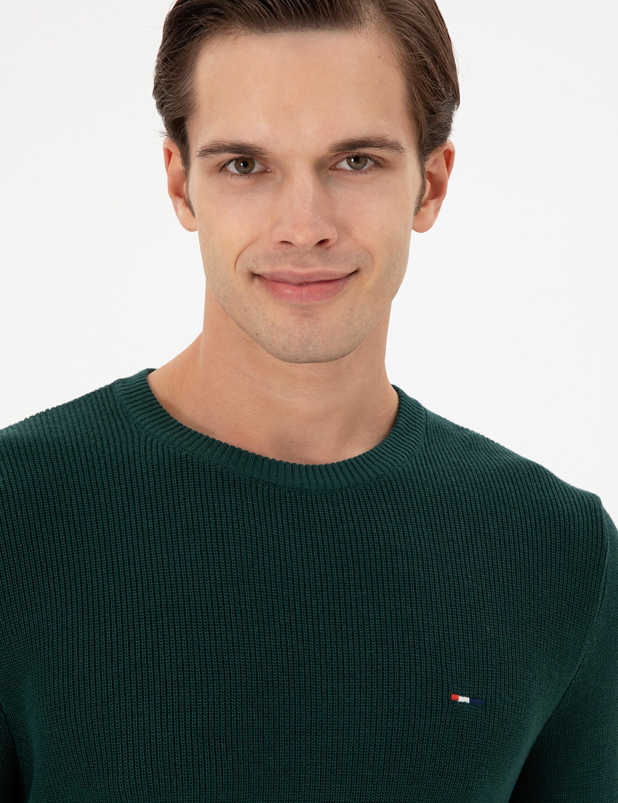 Erkek Slim Fit Bisiklet Yaka Koyu Yeşil Basic Kazak